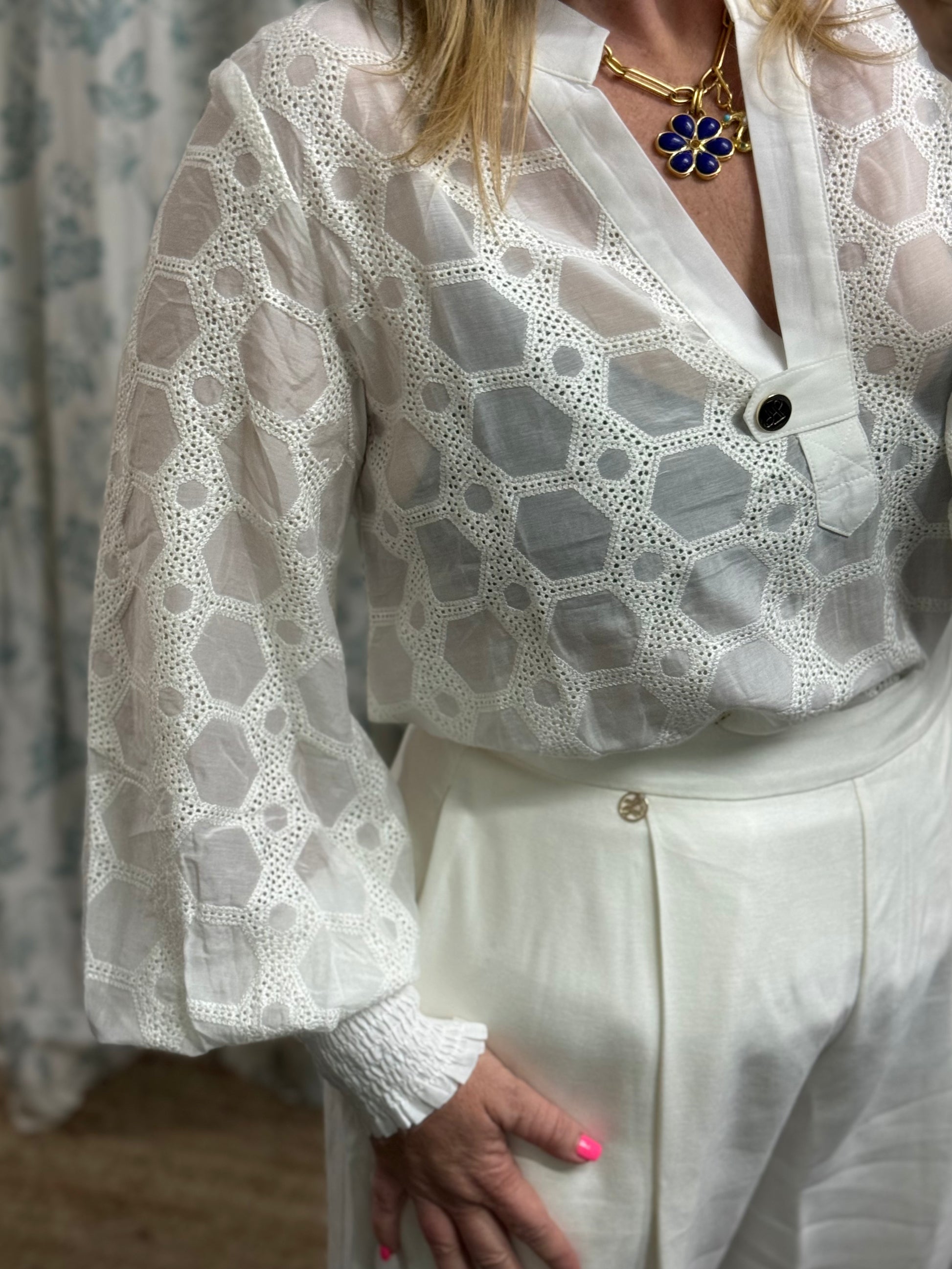This elegant blouse features delicate silk-cotton lace detailing, a flattering neckline, and a relaxed silhouette. Designed with versatility in mind, it includes soft balloon sleeves with comfortable elastic cuffs.