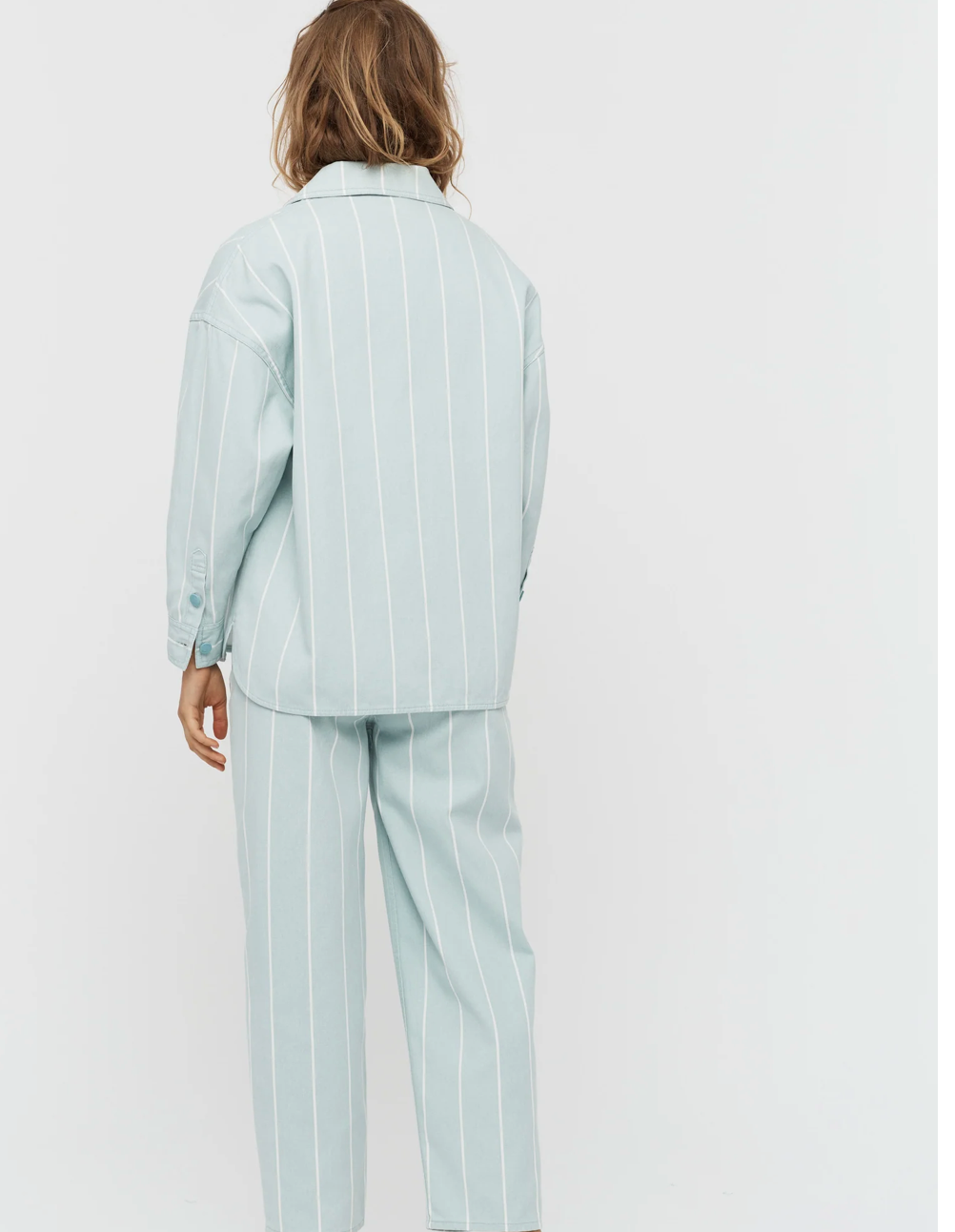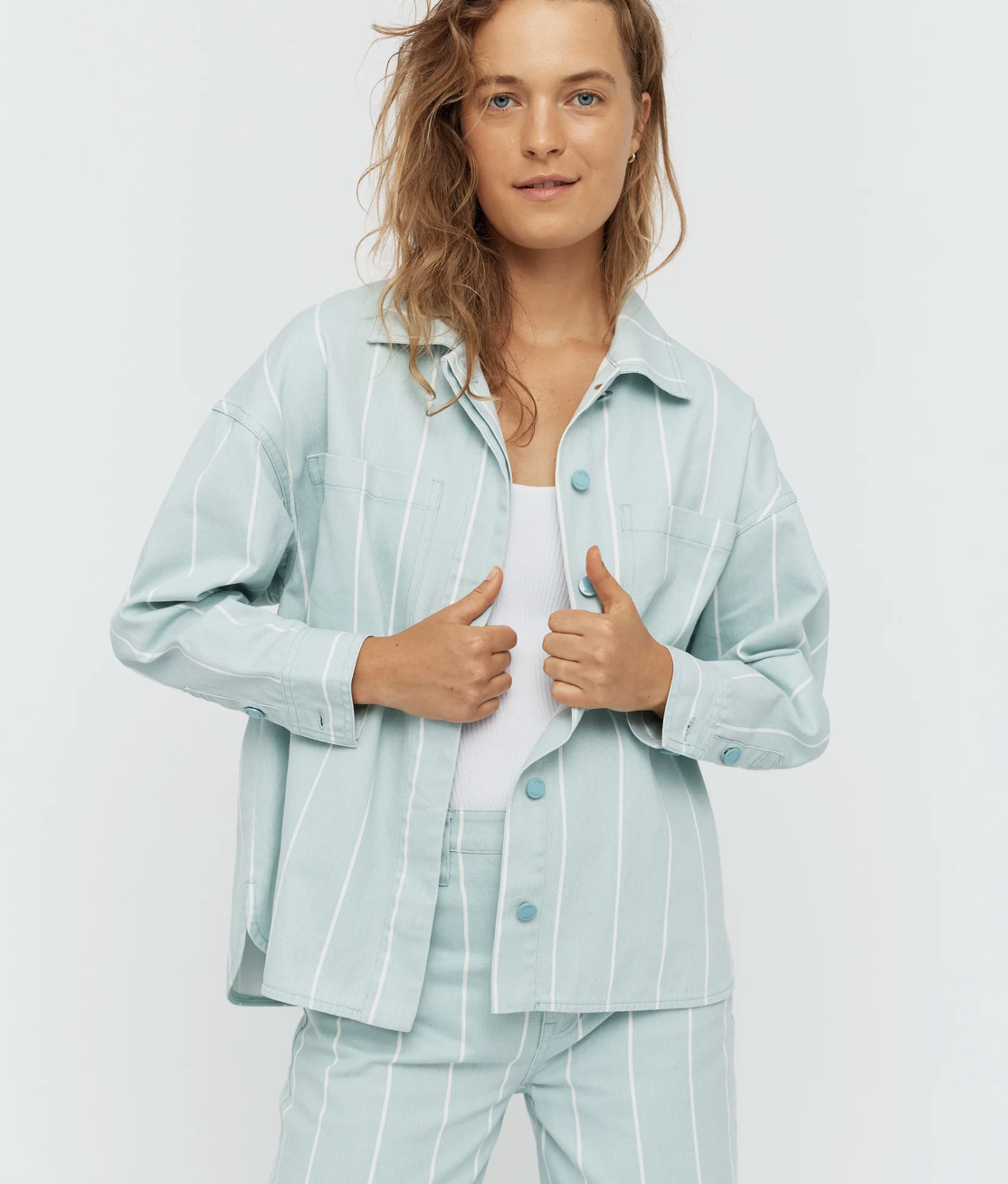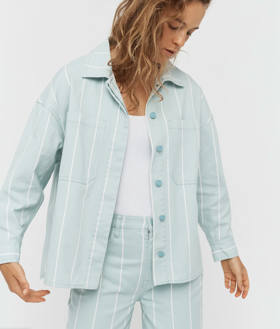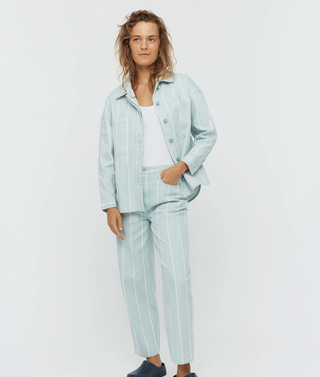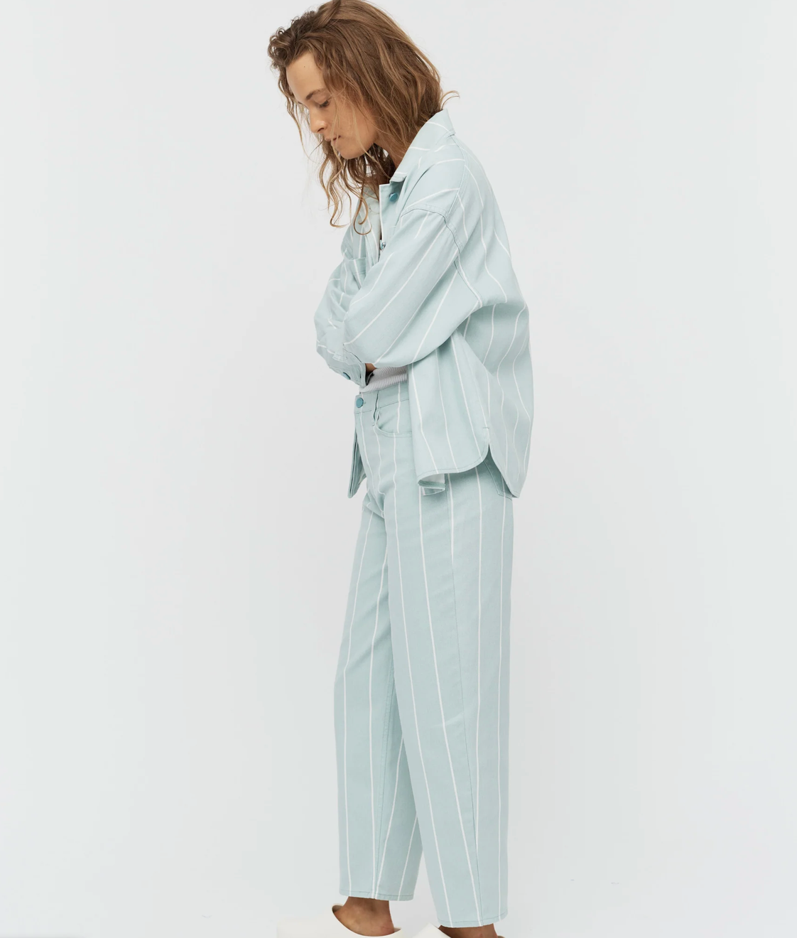 The stripe denim jean in cool pastel shades is the ultimate tran-seasonal piece for us! True to size, buy your normal size or size down.