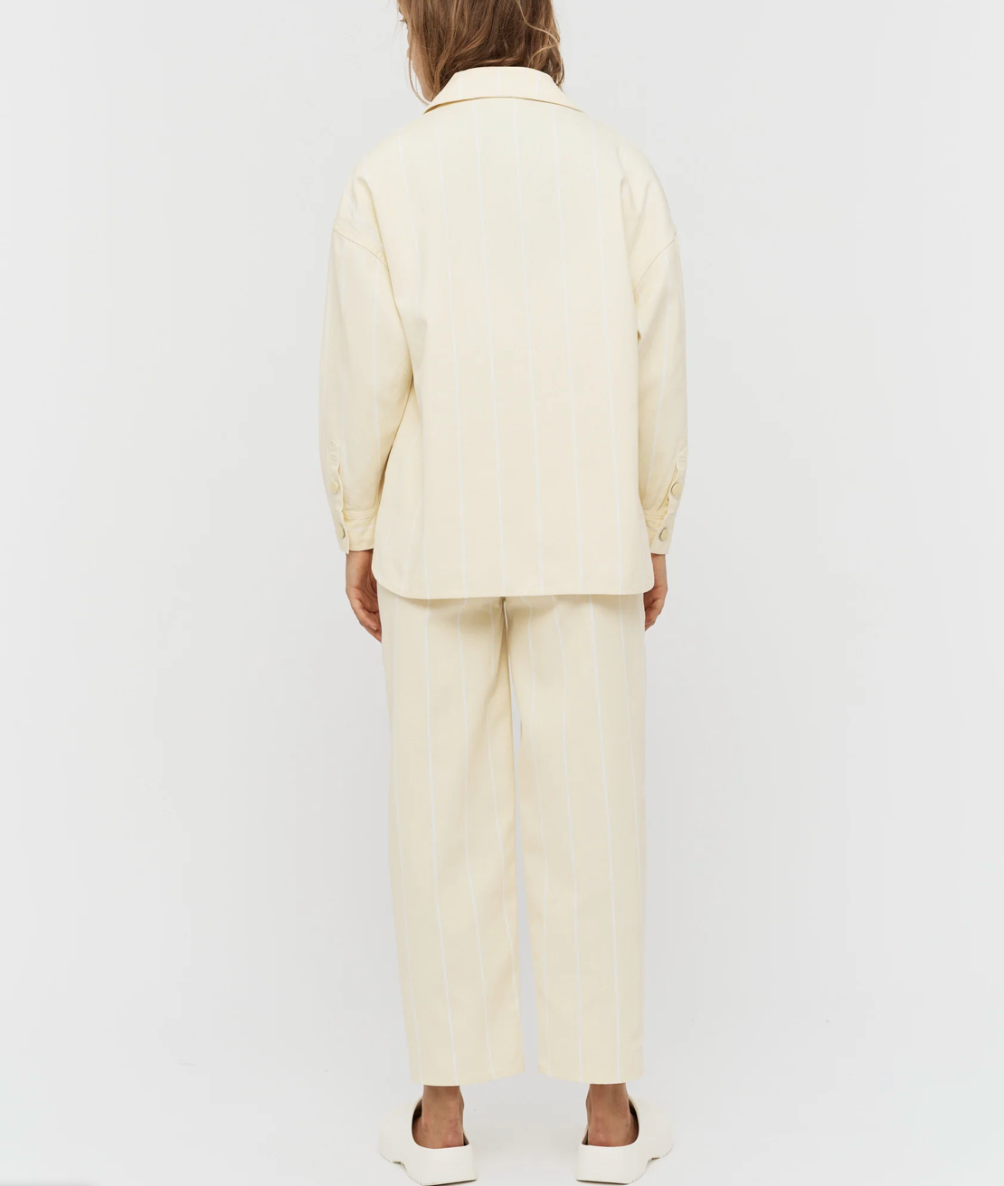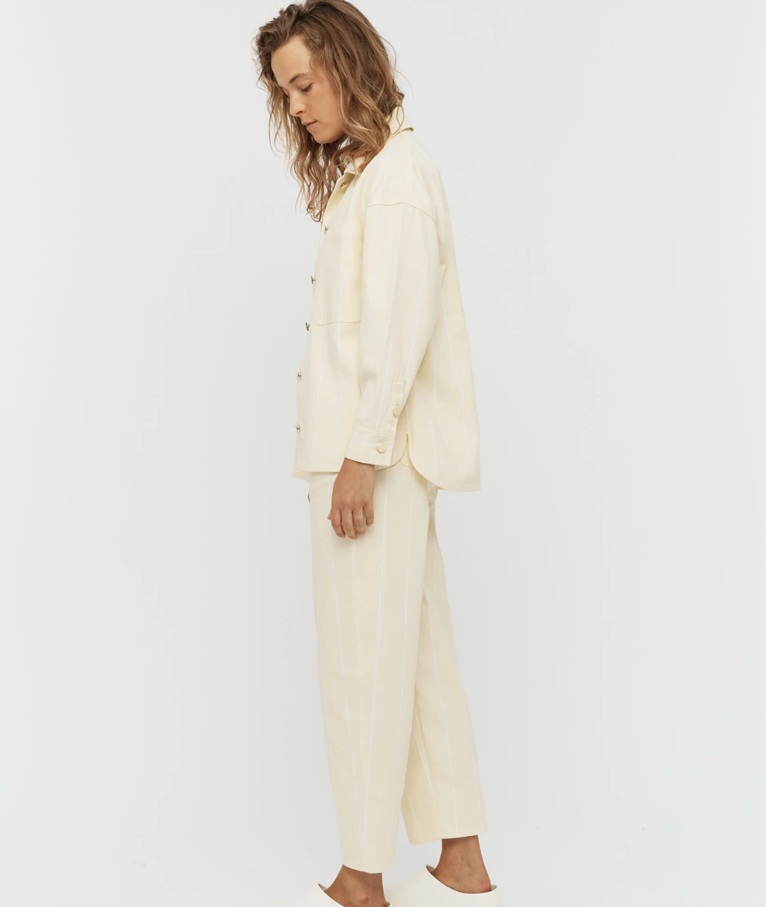 Introducing the LMND Amaya Jeans, designed with contemporary flair and stylish details. These jeans are crafted from lightweight 100% cotton denim and printed with our signature LMND stripe in soft yellow. Featuring a relaxed fit with a modern twist, they include customized LMND buttons, a front metal zip, back pockets, and the LMND embroidery logo. These jeans are set to become your go-to pair for the new season. Pair them with our matching Amaya Shacket for a cohesive and fashionable look, or mix with your favorite LMND tee.