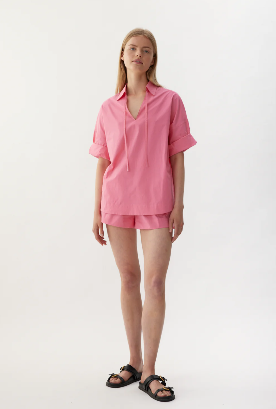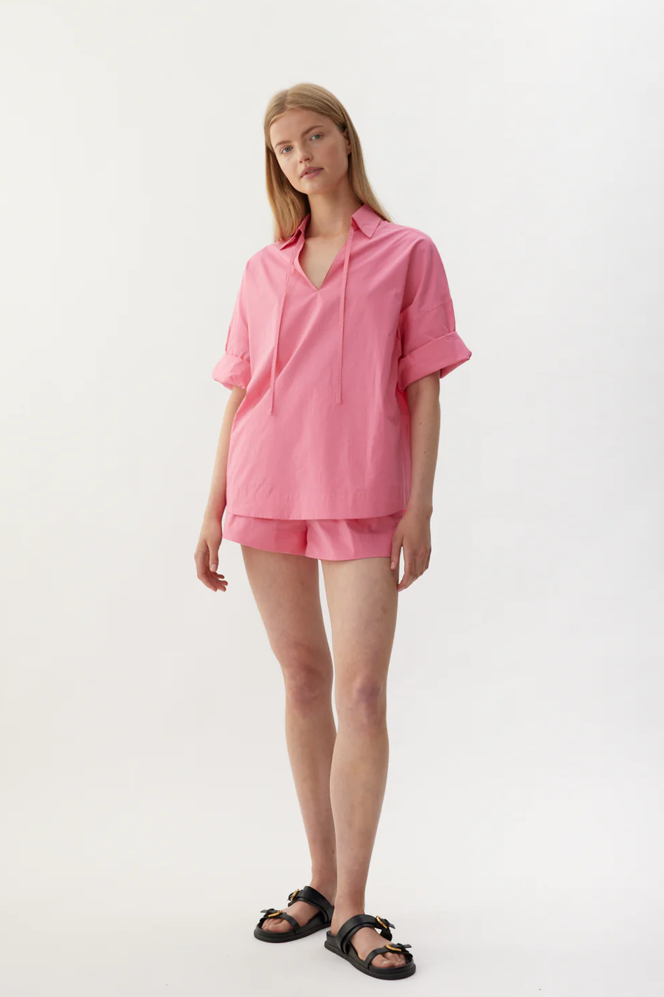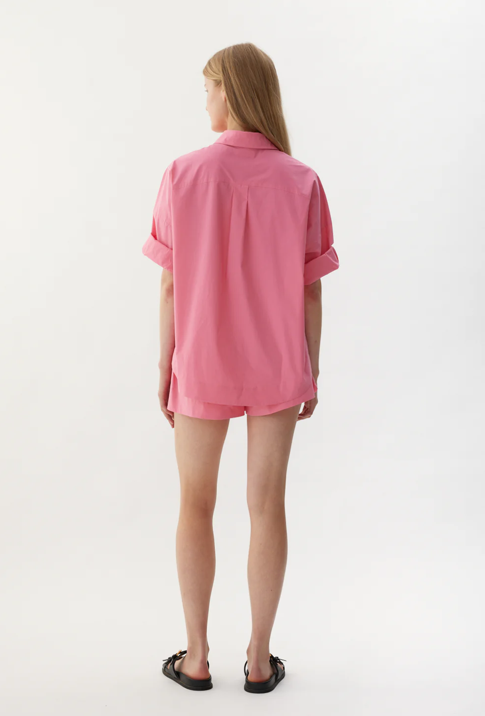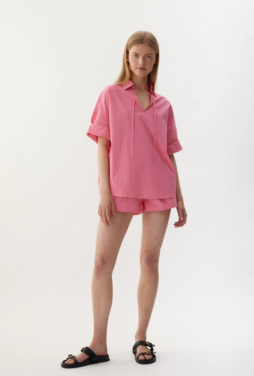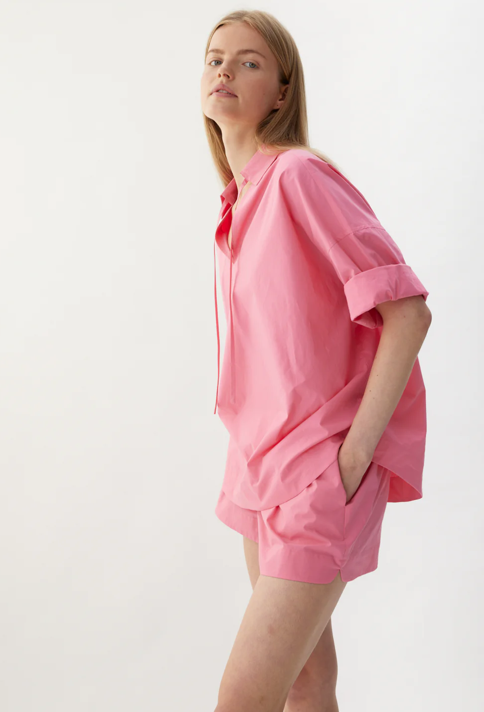 Crafted from lightweight, breathable 100% cotton, this shirt is made for warm days and effortless layering. The oversized fit features our signature drop shoulders for a relaxed, easygoing look, while the matching scalloped-hem shorts add a playful yet chic touch. The soft Rosa hue injects a bold, modern twist into your wardrobe, making this set perfect for casual outings or as your go-to vacation look.