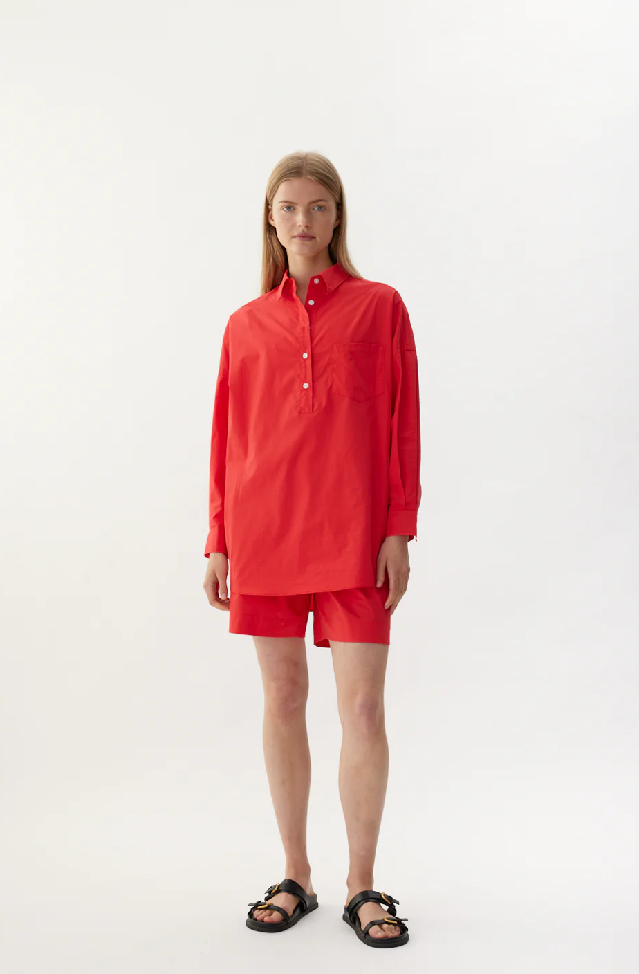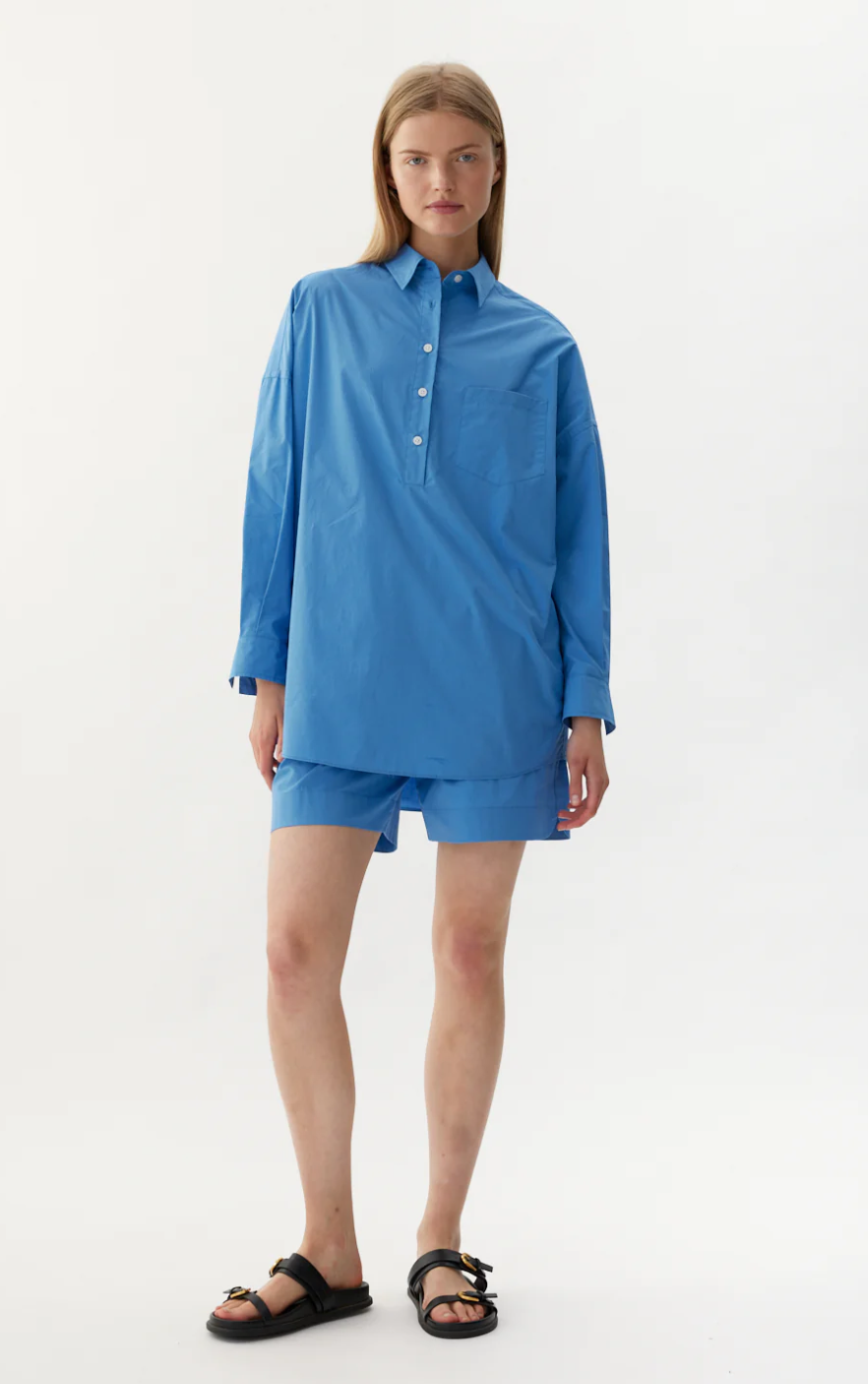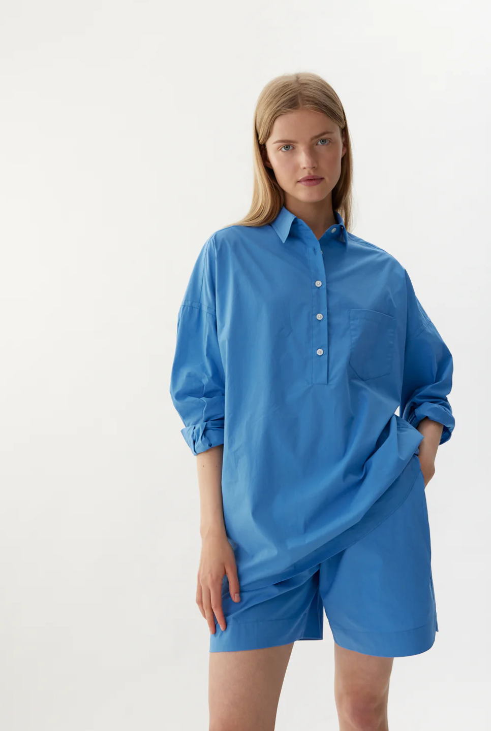 Introducing our Half Placket Chiara Shirt, a fresh take on our signature classic. Made from 100% premium cotton, this shirt offers a relaxed fit with a slightly loose silhouette and drop shoulders for a laid-back, yet polished look. The half placket adds a modern touch.