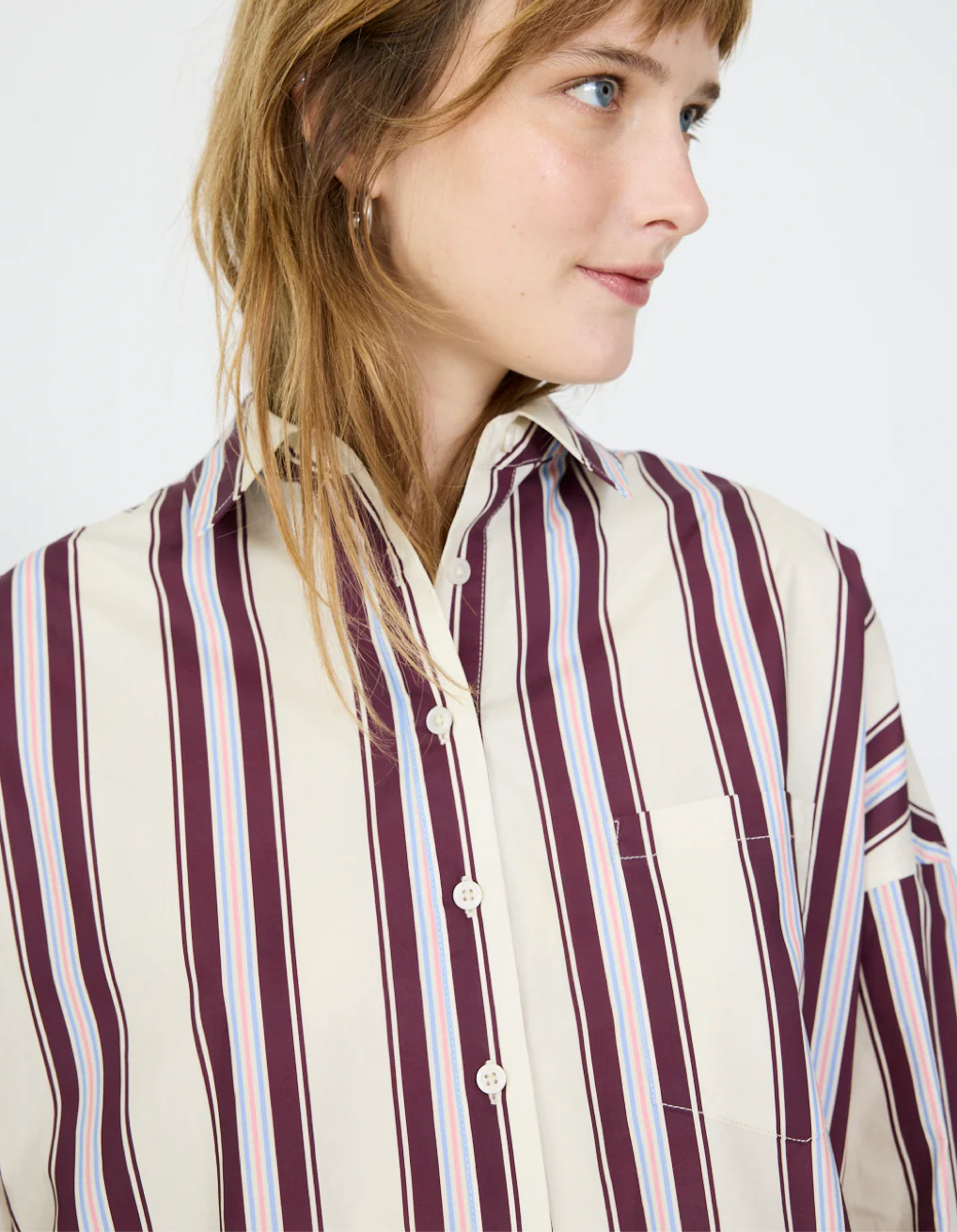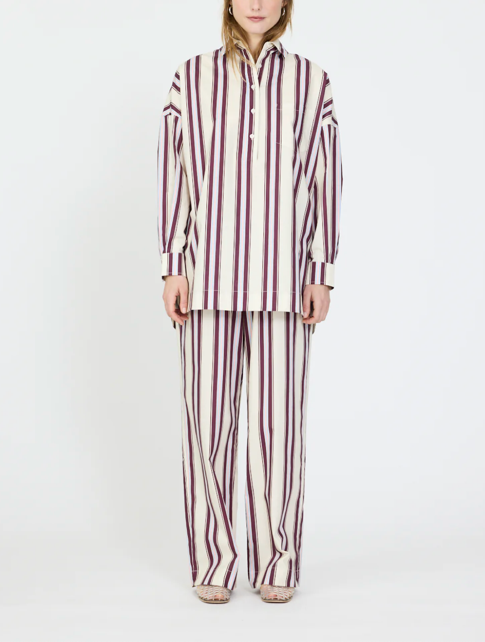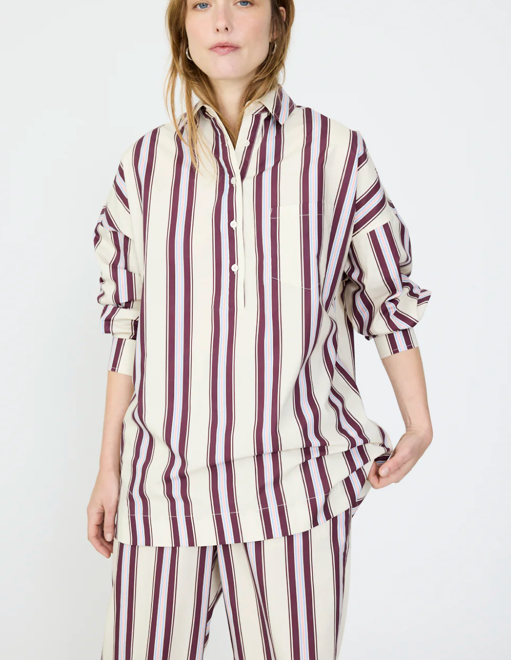 A fresh twist on a cult favourite. The Half Placket Chiara Shirt features all the signature ease of our classic Chiara, now updated with a modern half-button front and crafted in our exclusive yarn-dyed stripes for elevated texture and depth.