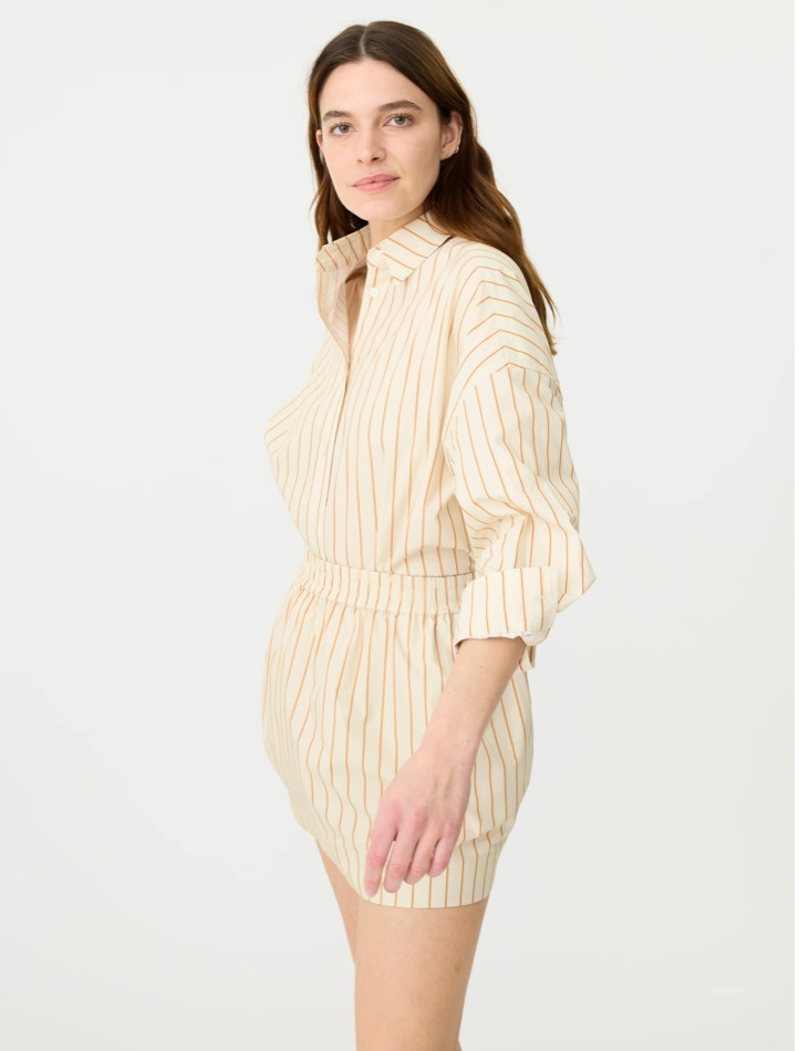 Introducing our Signature Classic Button-Up Shirt, featuring a stripe detail. Expertly crafted from 100% yarn-dyed cotton, this shirt effortlessly combines style and comfort. The design includes a practical chest pocket and our signature drop shoulders, creating a slightly loose silhouette perfect for layering under cozy knitwear or pairing with your favourite Chiara shorts.
