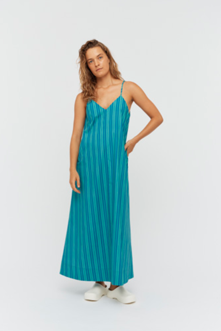 Introducing the Eva Trapeze Dress in Mystic Green/Electric Indigo from our latest collection. Crafted from 100% yarn-dyed cotton, this dress features a unique stripe pattern customised in our exclusive seasonal colours.