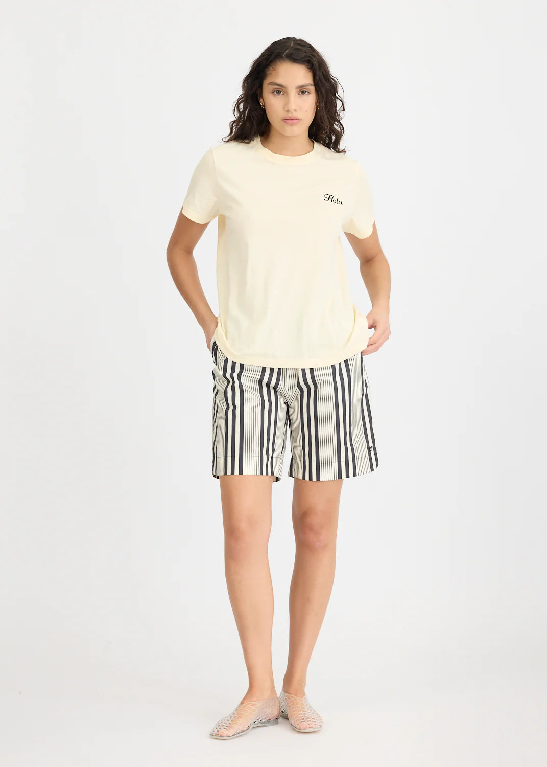 The Hola Tee in Birch brings a fresh, minimal base with a sharp Black flocked Hola across the chest. Made from 100% cotton, it feels soft yet structured, holding its shape while staying breathable through the day. The relaxed LMND silhouette keeps it effortless, perfect with stripes, denim, or your favourite Chiara shorts.