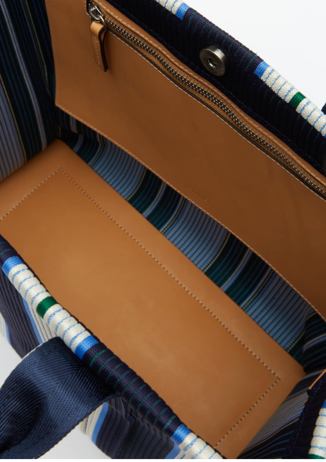 Defined by our exclusive signature stripes custom-woven in striking tones of Navy, Ink Blue, and Verde this structured tote is designed to bring joy to your everyday. From market mornings to weekend escapes, it’s the bag you’ll reach for time and again.