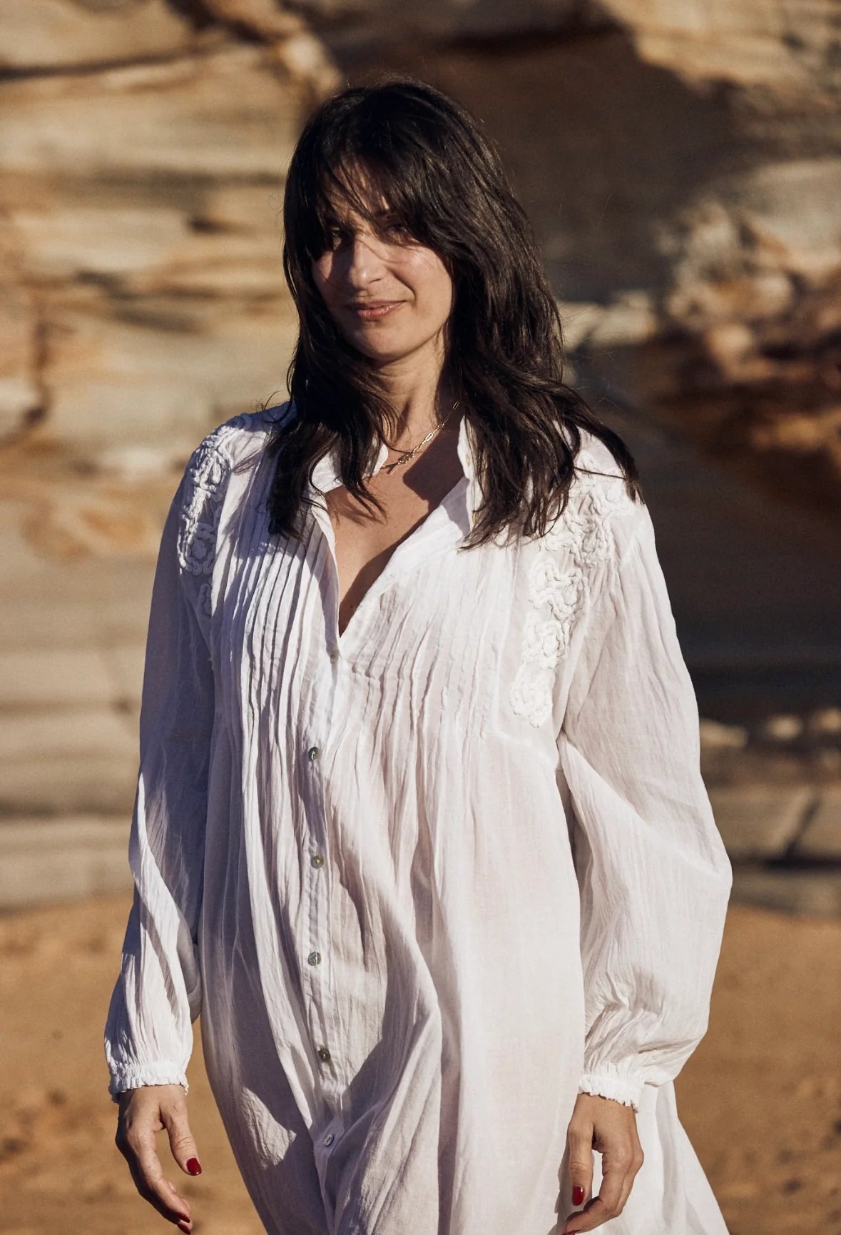 The Long Arcachon Dress brings effortless vintage charm to your summer wardrobe. Available in classic white or black, it features pearly shell buttons, a soft Chinese collar and lightly gathered waist for a flattering, easy fit. Lightweight and unlined, the perfect breezy, day-to-dusk dress.