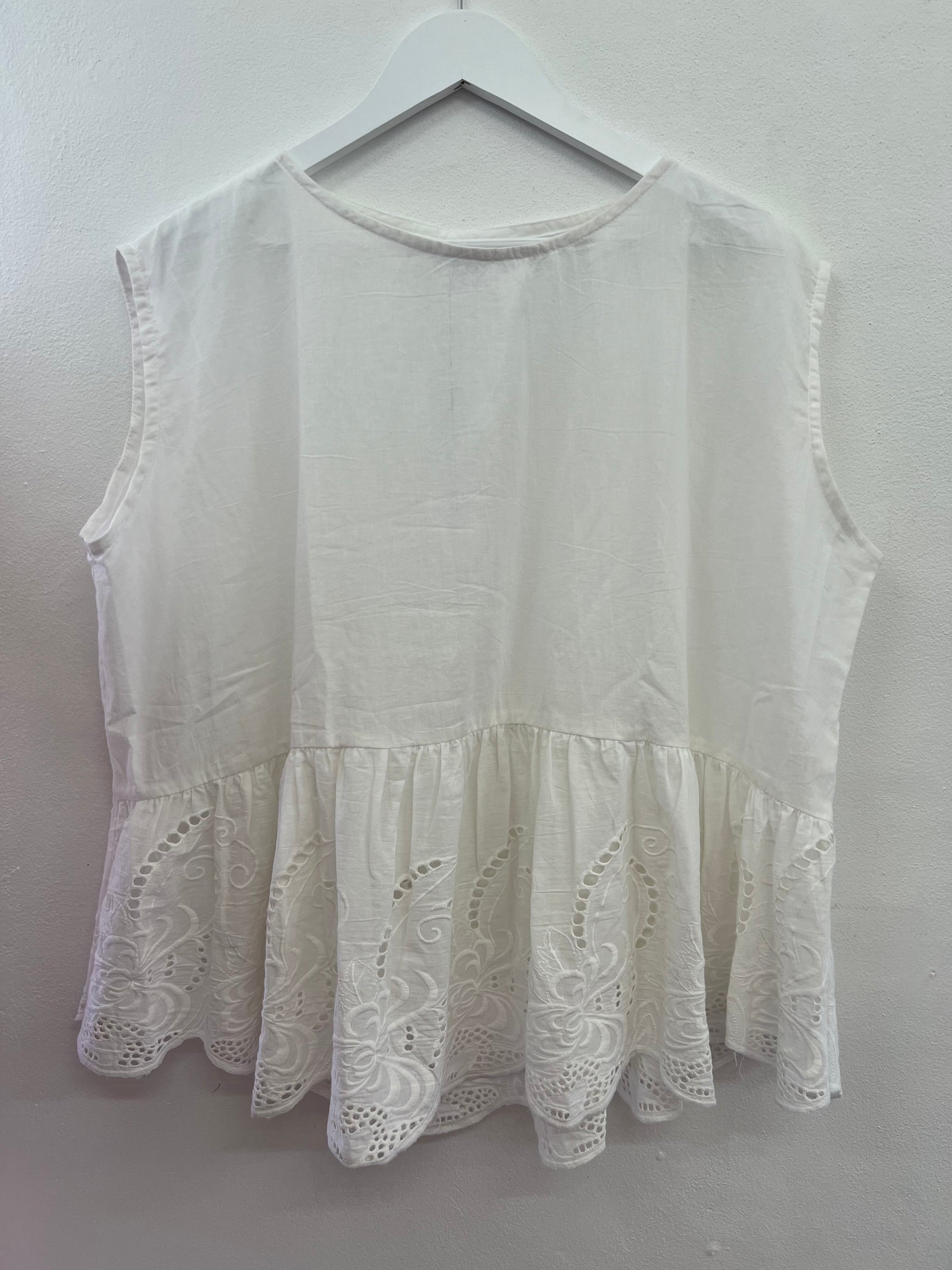 Beautiful neckline and frill detail. A great summer piece. One size fits up to a size 14.