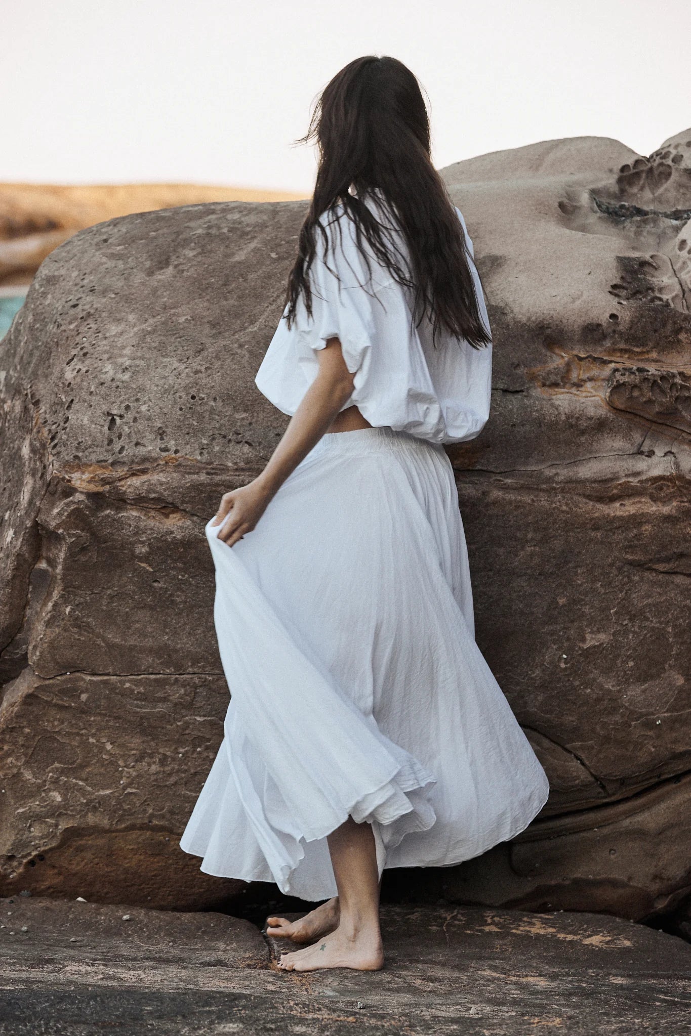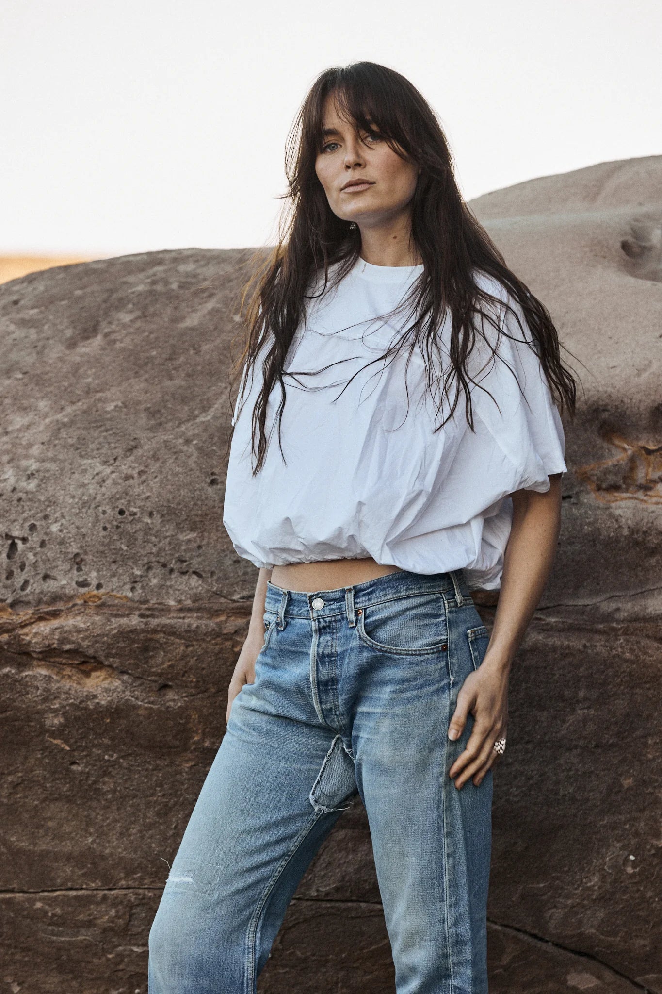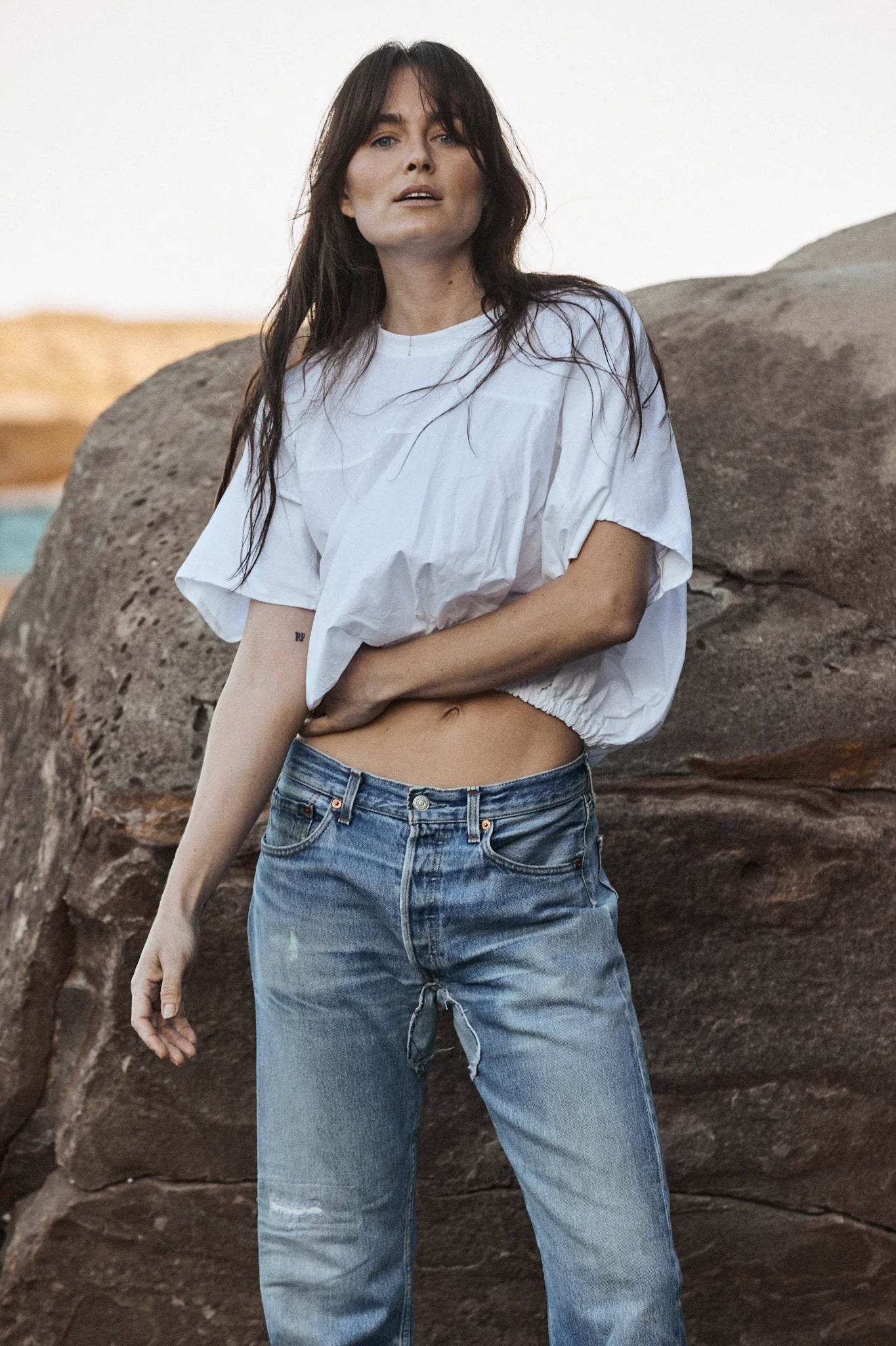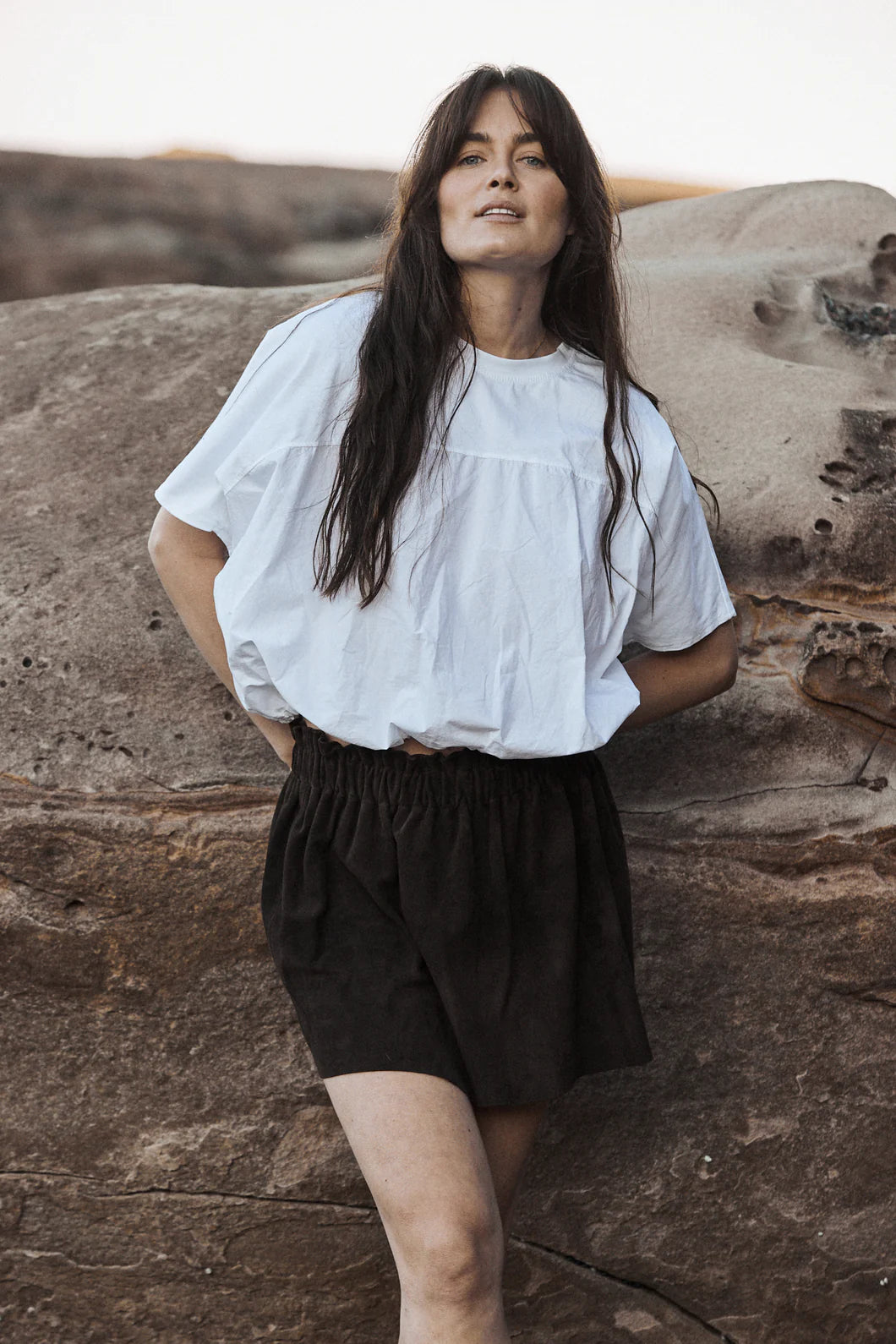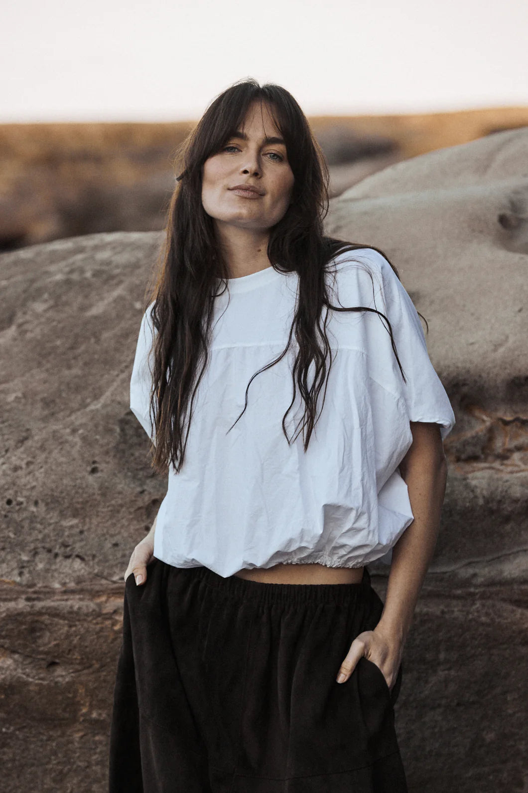 Designed with a wide sleeve, relaxed fit and soft elastic waist for easy styling. Half tee-shirt, half cotton poplin. The ideal blend for warm days.