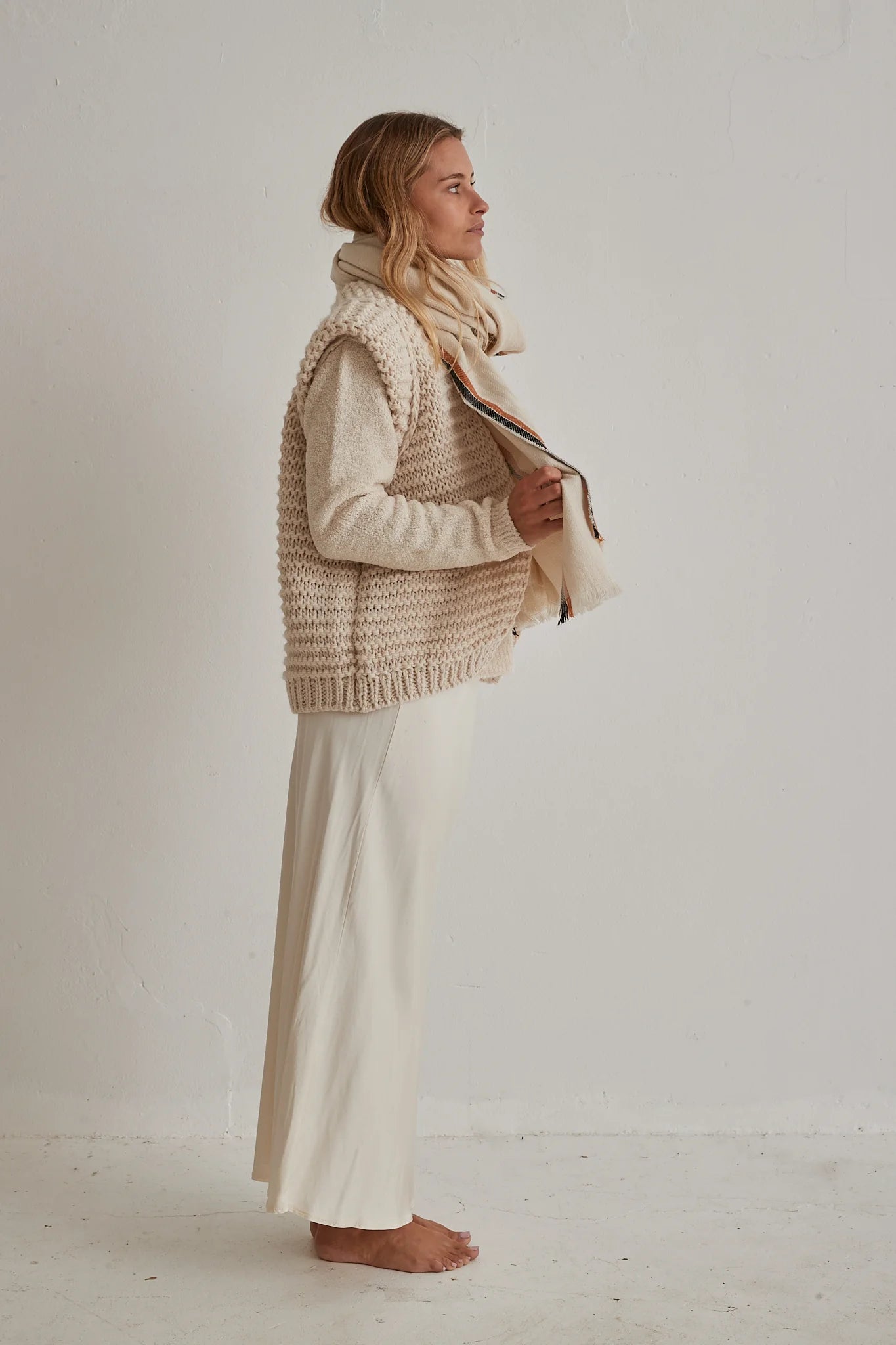 Super light, soft and surprisingly warm. This cream sleeveless knit is a layering dream. with its relaxed shape and timeless charm, its the kind of piece you'll reach for again and again. A Mamapapa favourite and super cute worn over shirts, dresses or on its own.