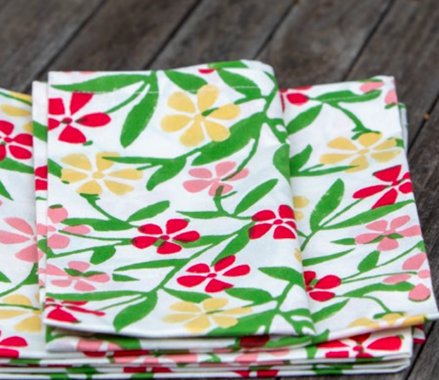 The Mosaic table linen set is a block printed Indian cotton featuring an all over bright and happy Mosaic print.