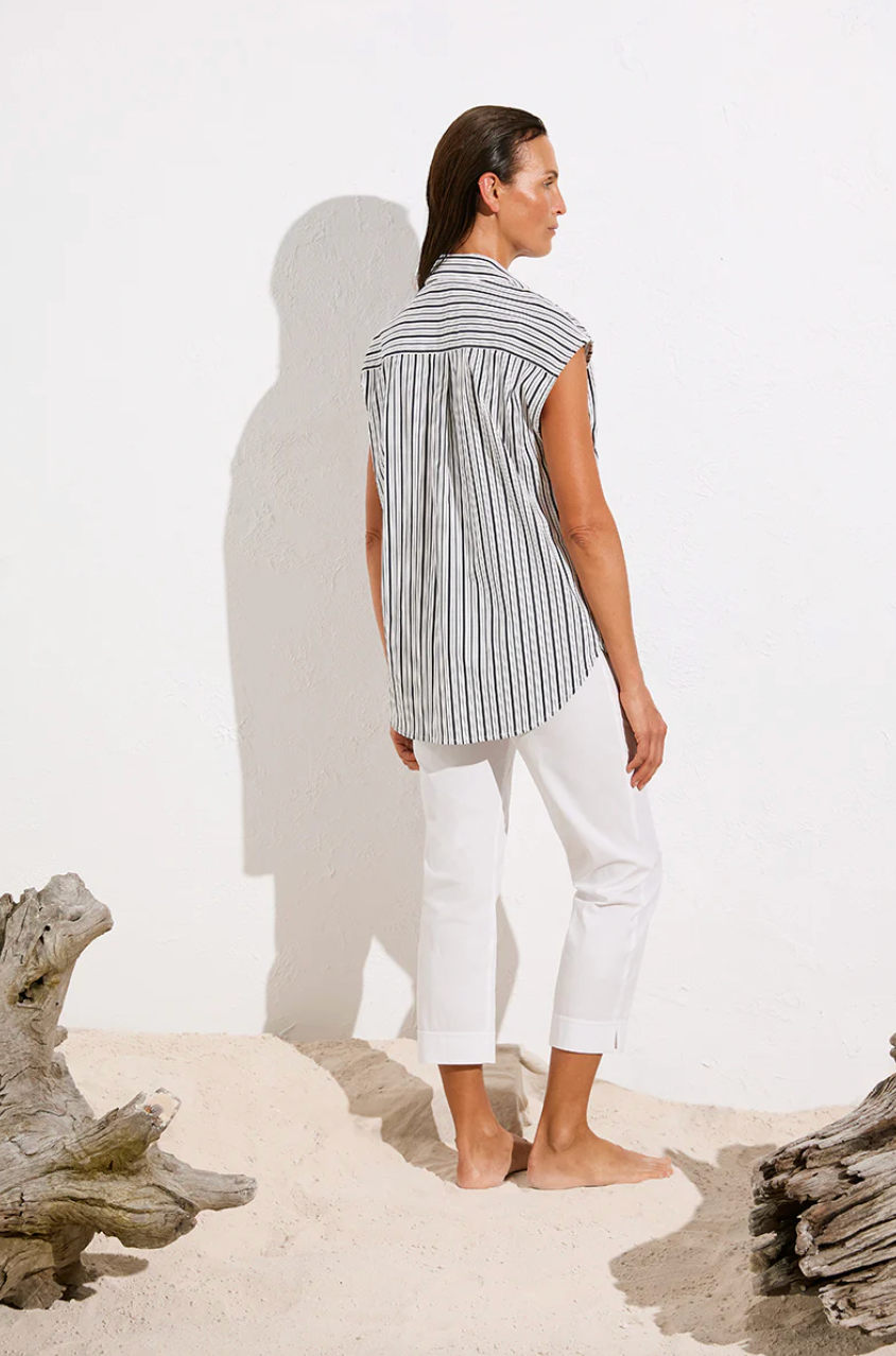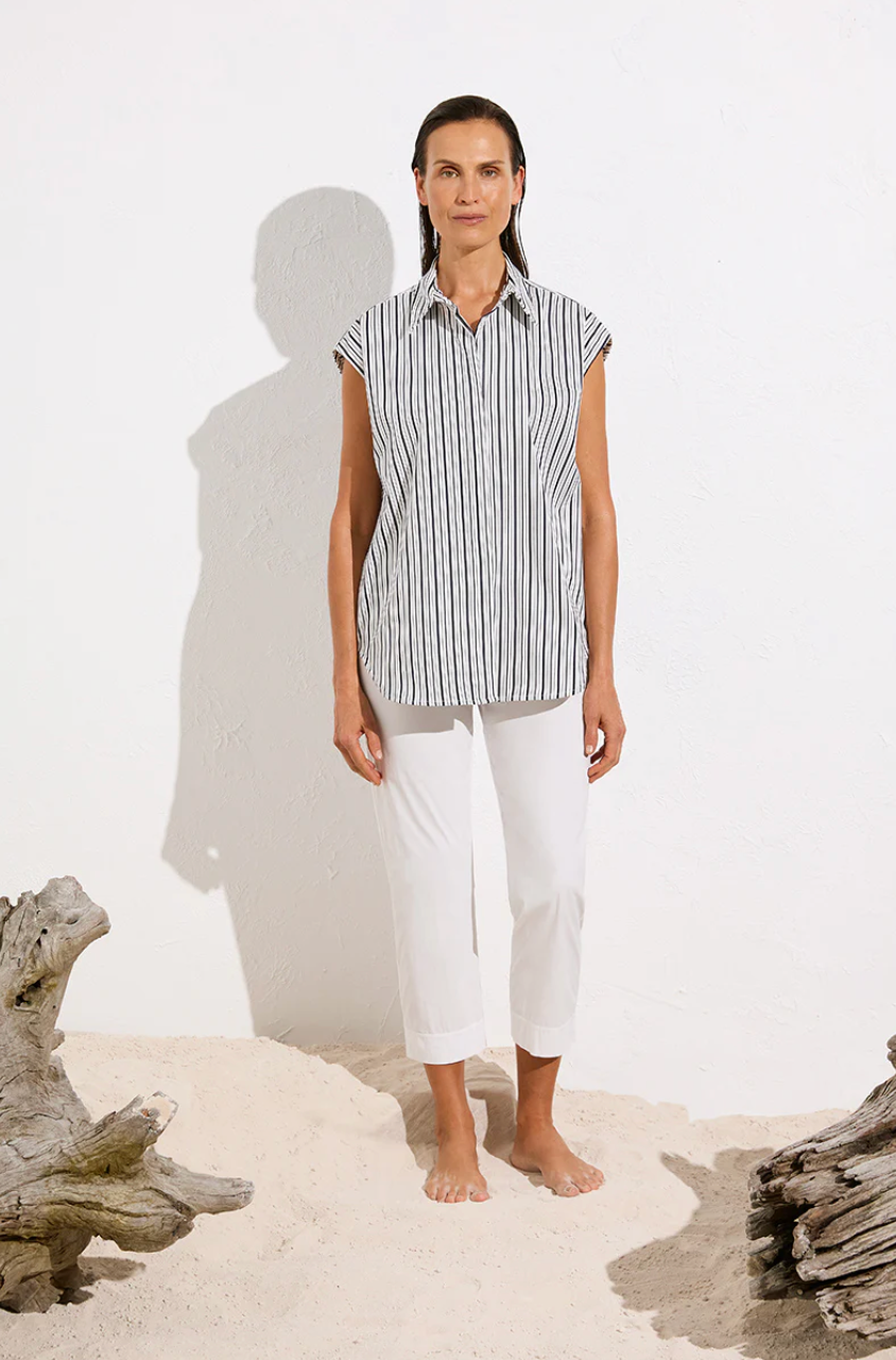 Discover Mela Purdie's Calico Stripe Popiline fabric, a Two- tone stripe cotton elastane blend with high stretch and a polished finish. The Slice Shirt has a modern relaxed fit with a crisp collar and concealed button closure