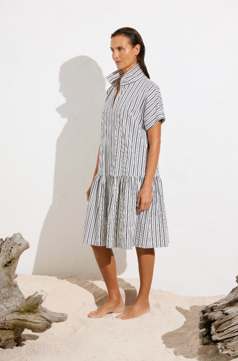 Discover Mela Purdie's Calico Stripe Popilene fabric, a Two- tone stripe cotton elastane blend with high stretch and a polished finish. The Zip Botanica Dress features a high collar stand with zip through detailing and gathered skirt hem.