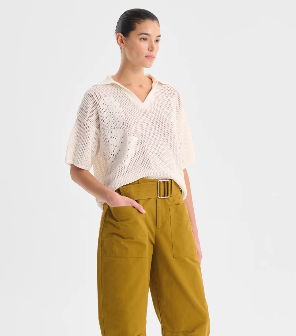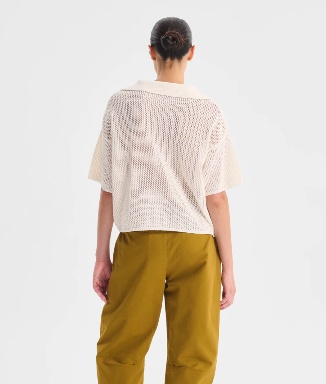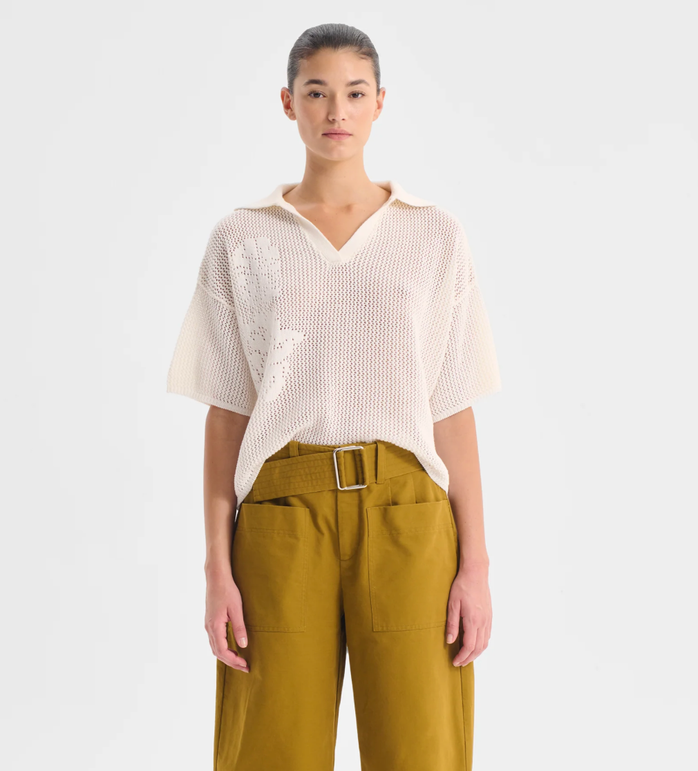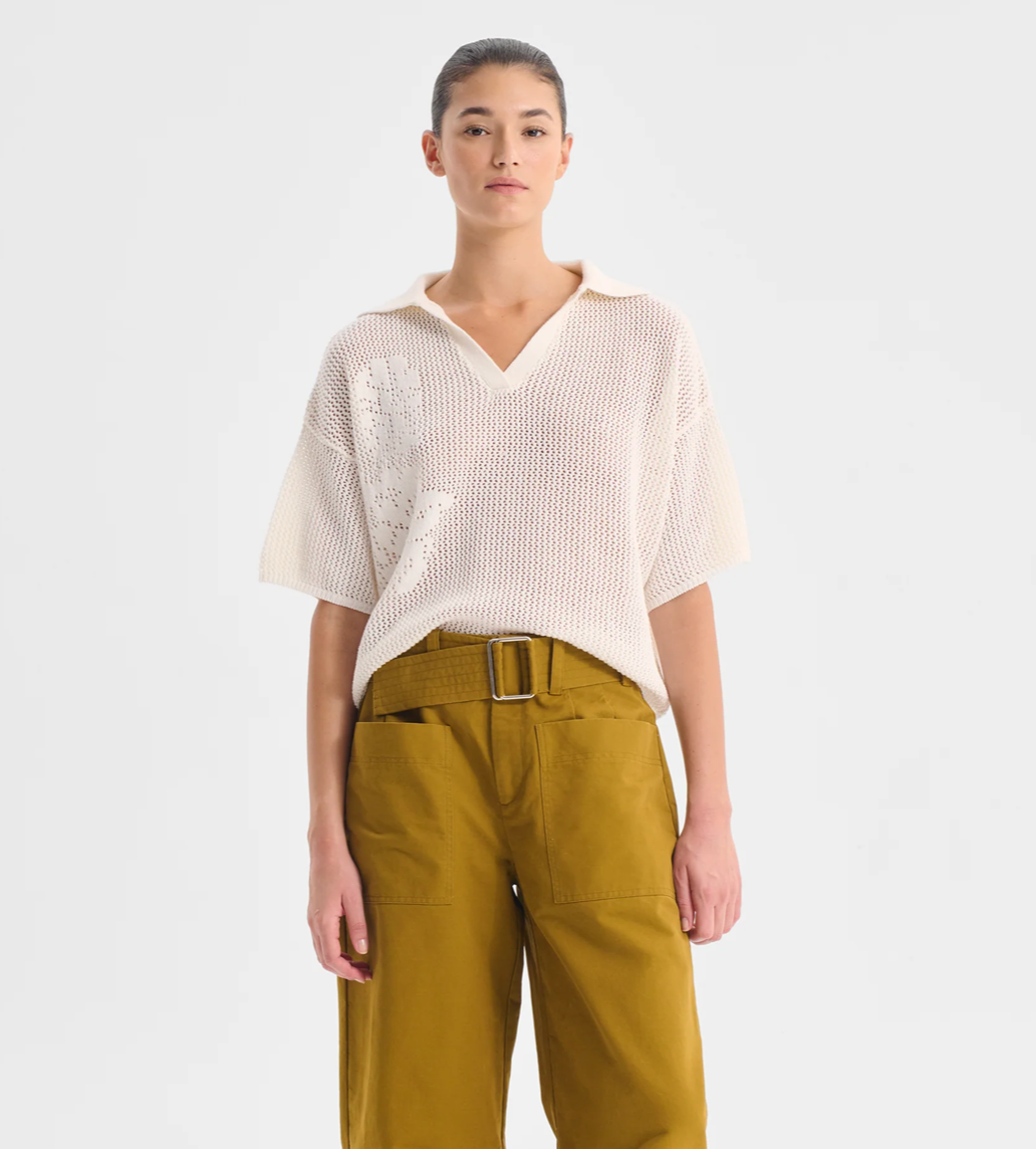 Made from cotton jacquard knit, the Chiara Top features a subtle floral motif and a soft polo neckline. With elbow-length sleeves, a relaxed boxy fit, and rib trim at the collar, sleeves, and hem, it blends texture and ease for everyday elegance.