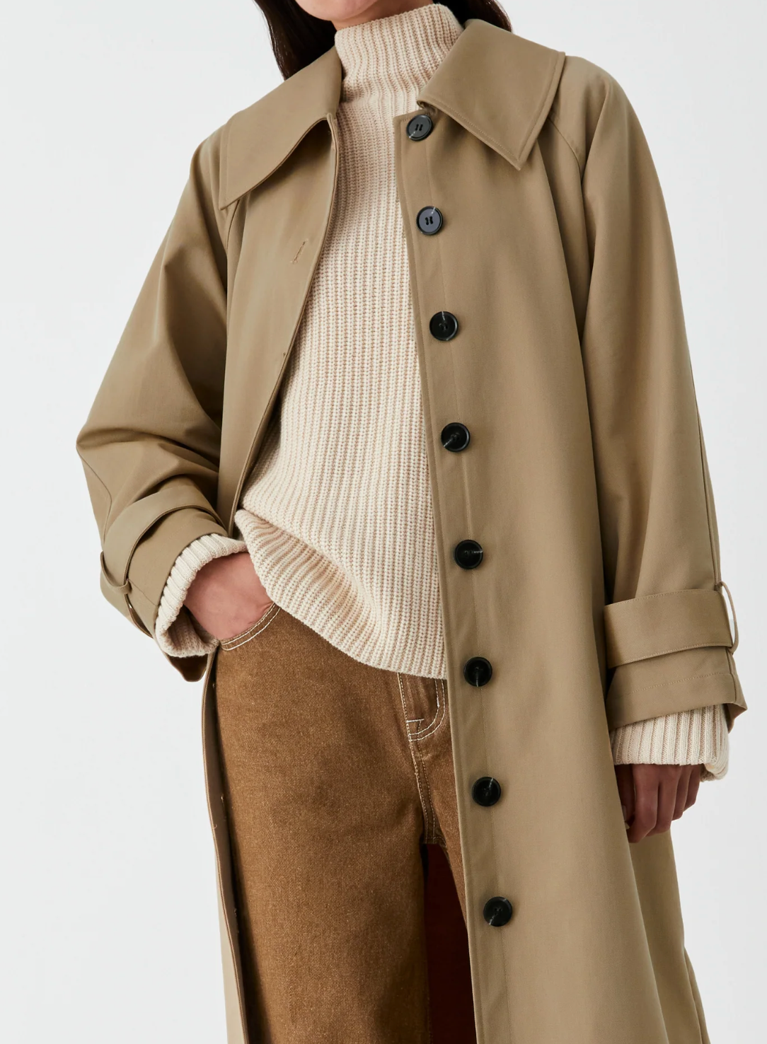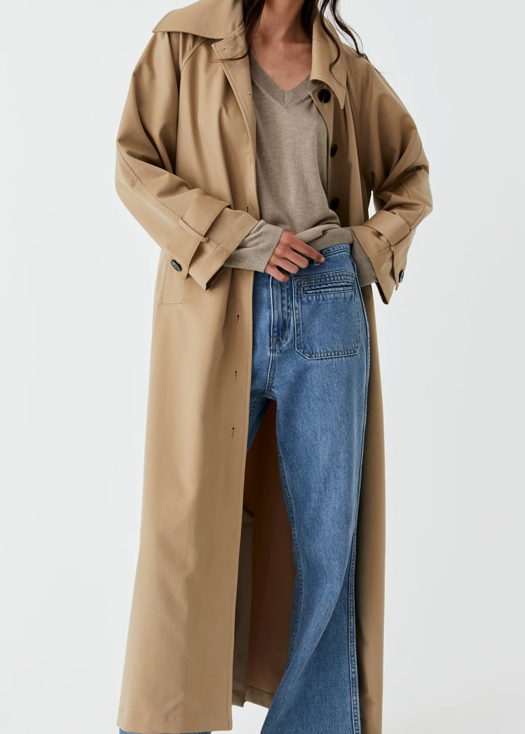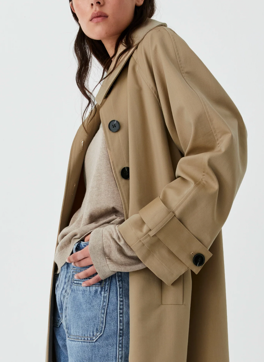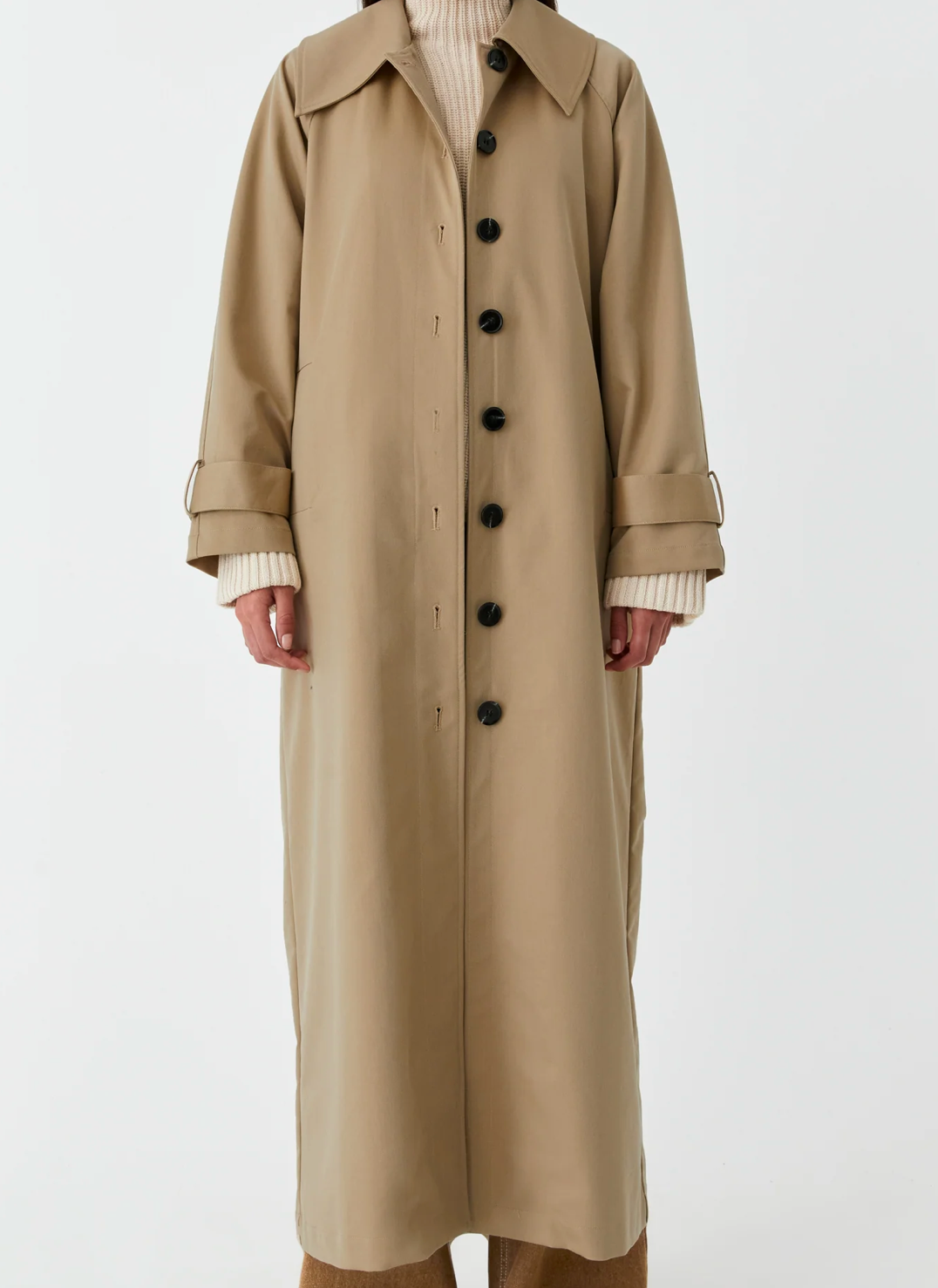 Crafted from a premium cotton blend, the Harvey Trench Coat in sand features a wide collar and large button front placket for a timeless look. The raglan full-length wide sleeves and button tab detail at the cuffs enhance its elegant style.