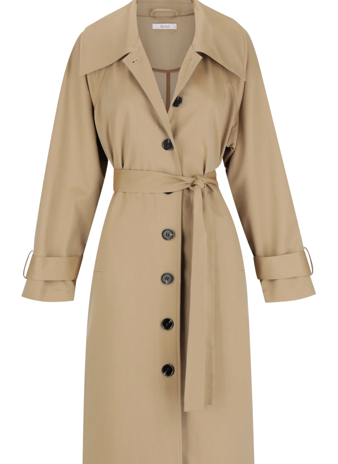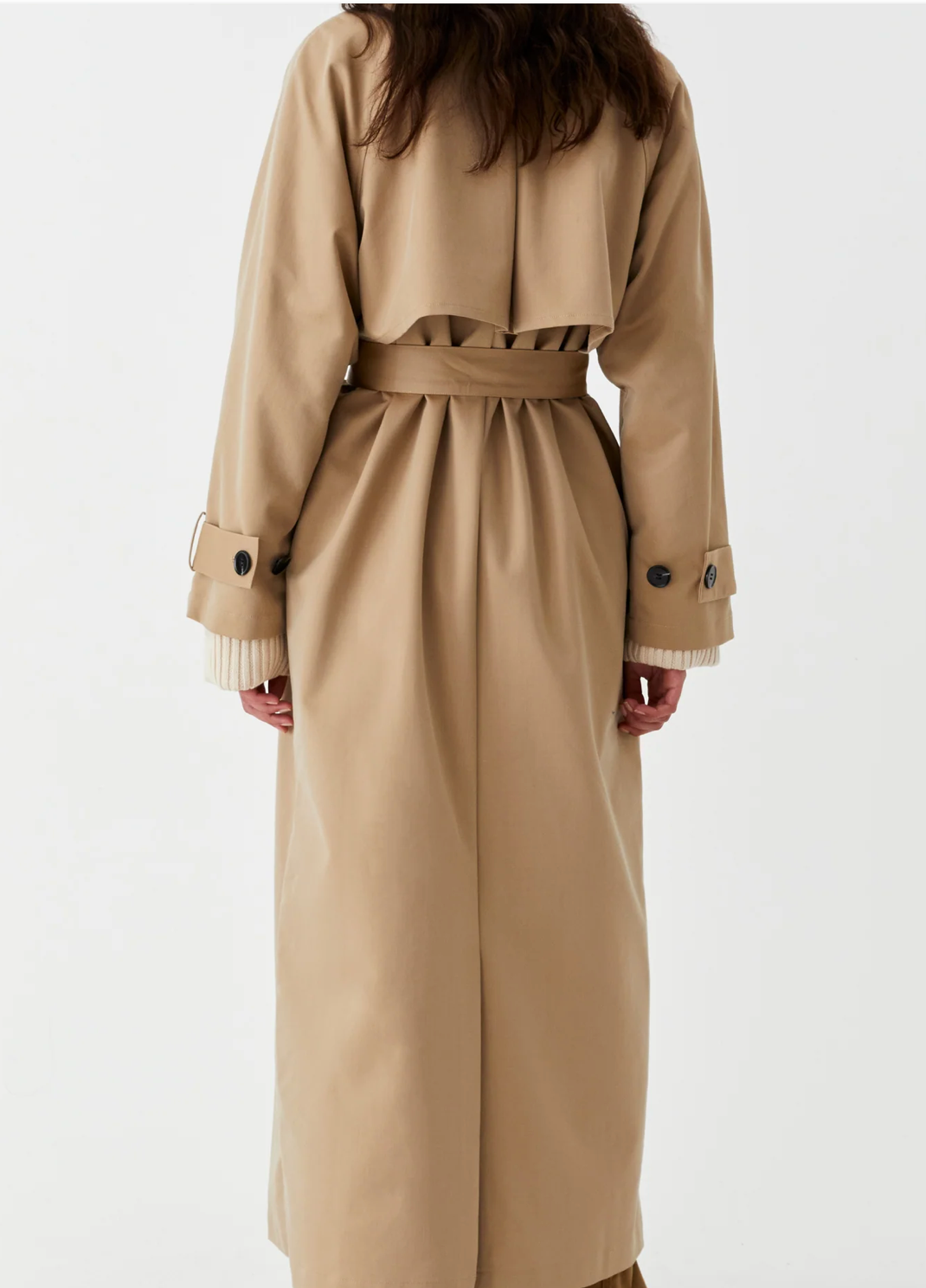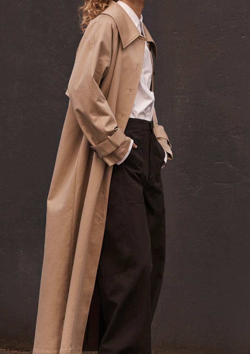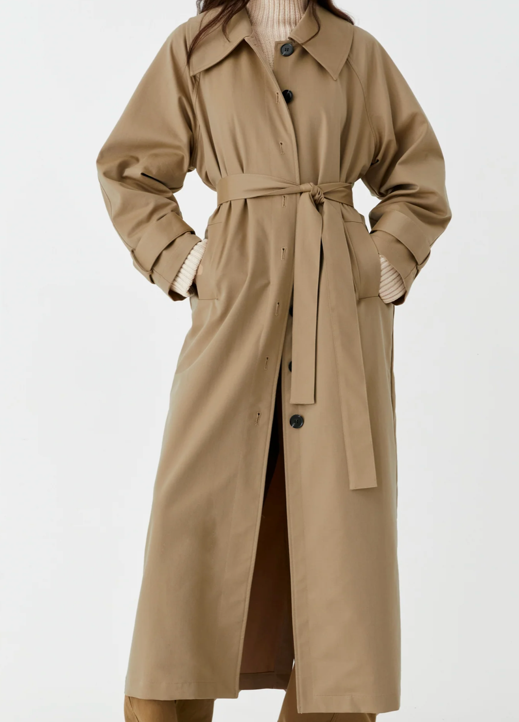 Crafted from a premium cotton blend, the Harvey Trench Coat in sand features a wide collar and large button front placket for a timeless look. The raglan full-length wide sleeves and button tab detail at the cuffs enhance its elegant style.