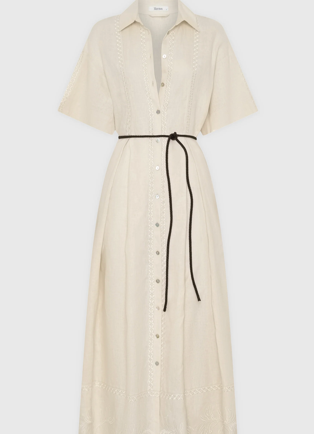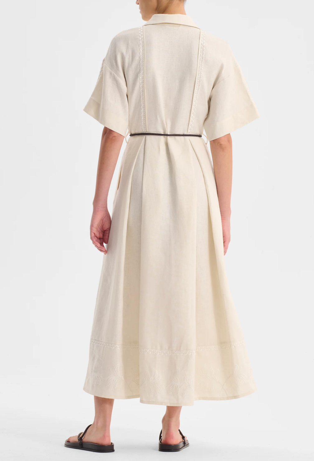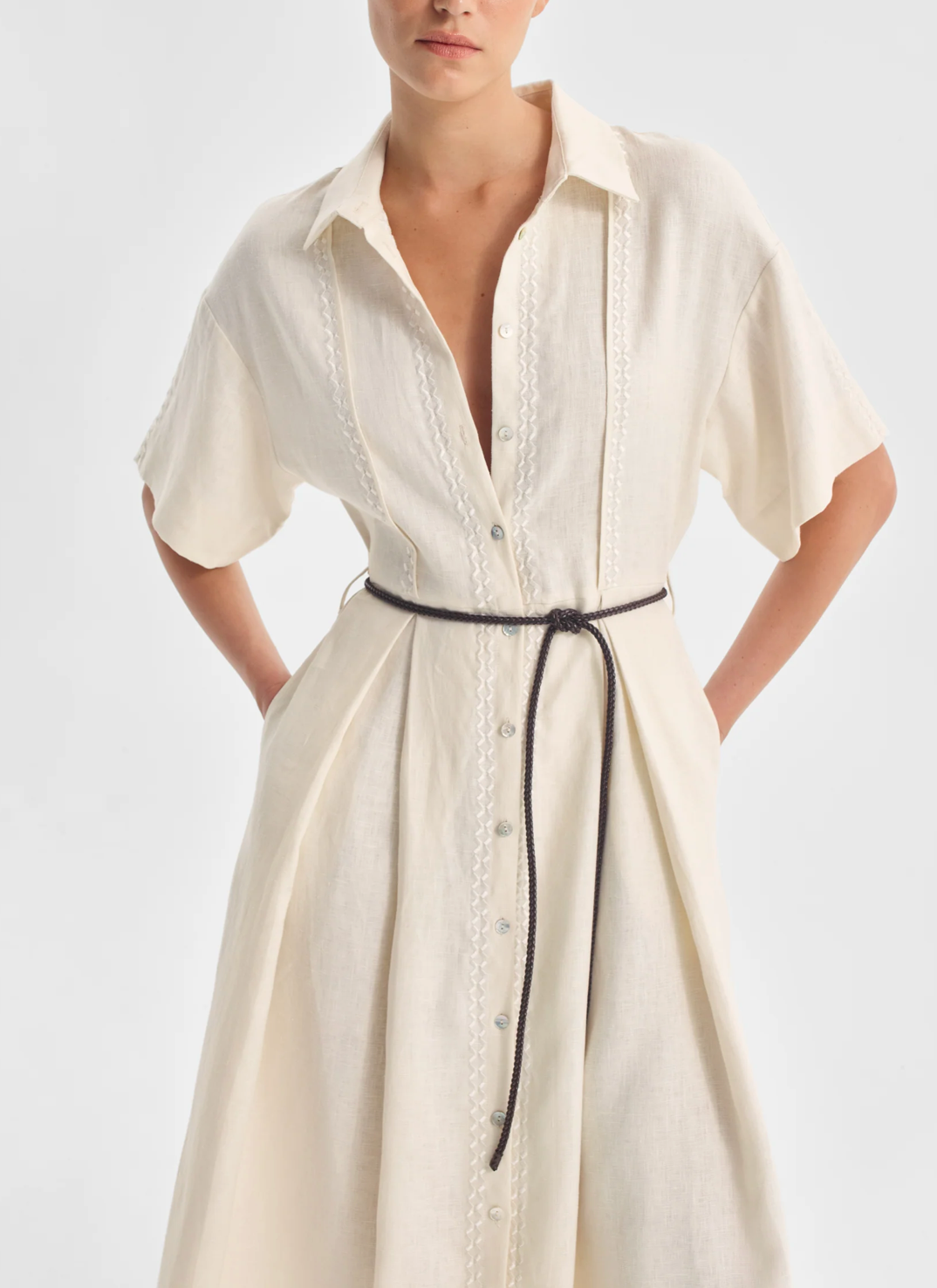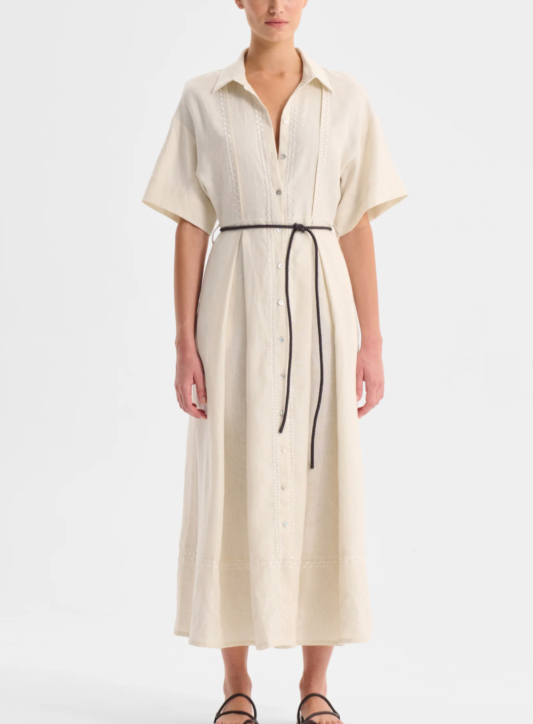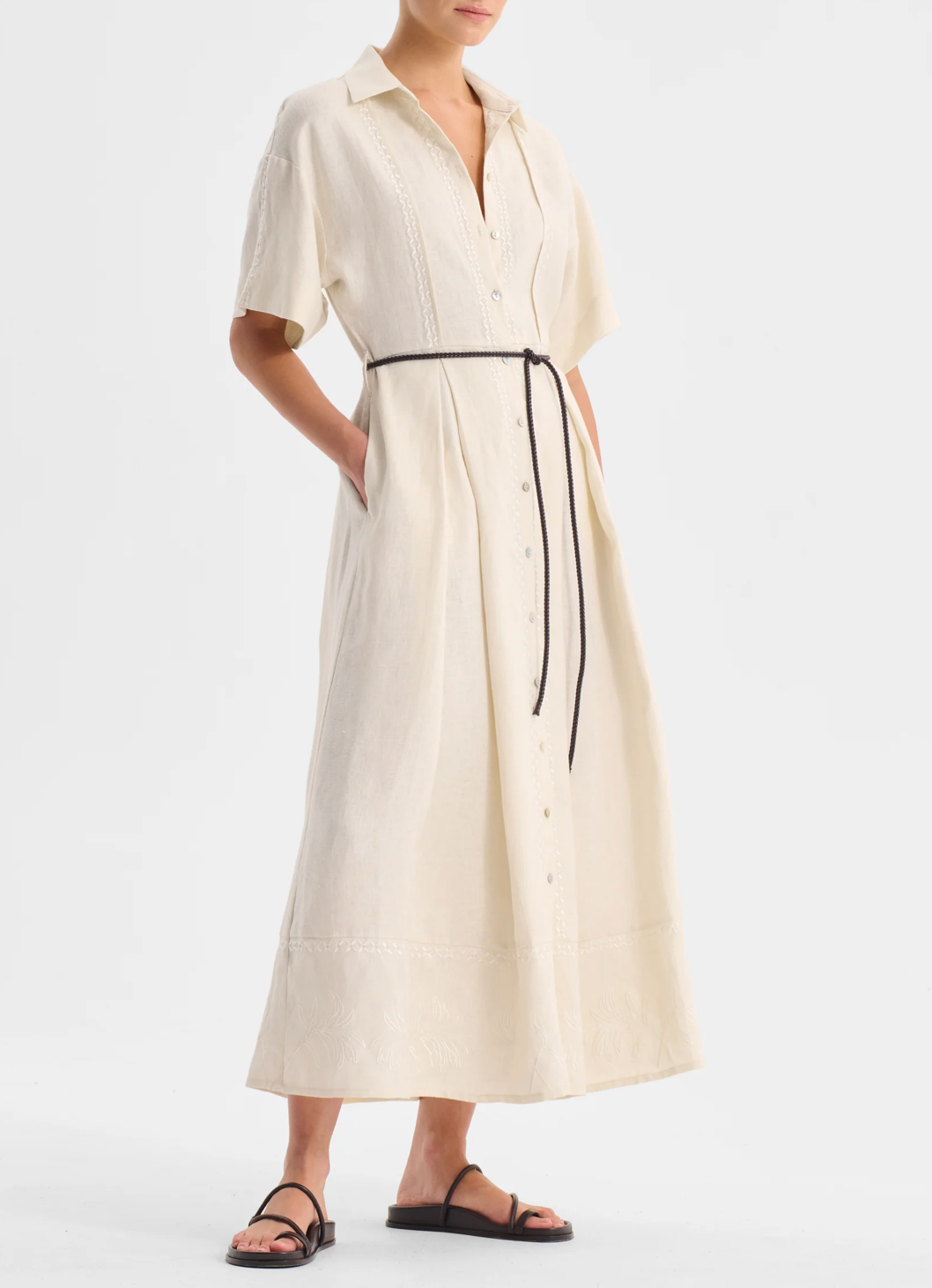 Crafted from premium mid-weight linen, the Maisey Dress features an exclusive embroidery design, traditional collar, and button front placket. With dropped shoulders and elbow-length sleeves, it offers a neat fit through the waist, finished with side seam pockets and a swing midi-length hem. Includes a contrast faux leather braided belt to define the waist.