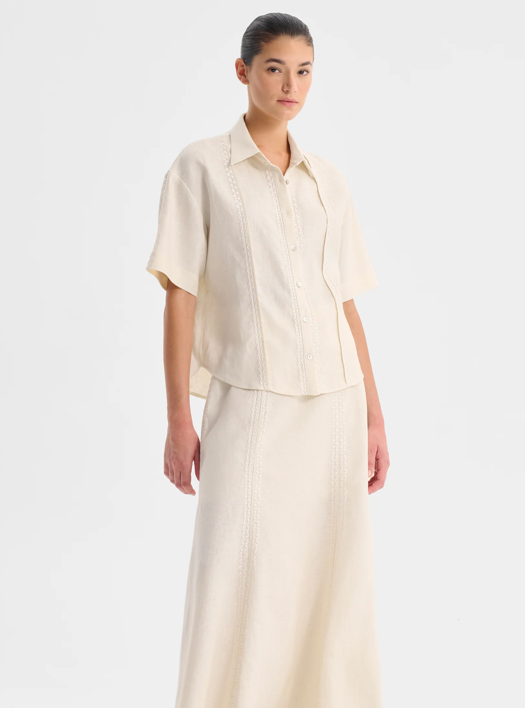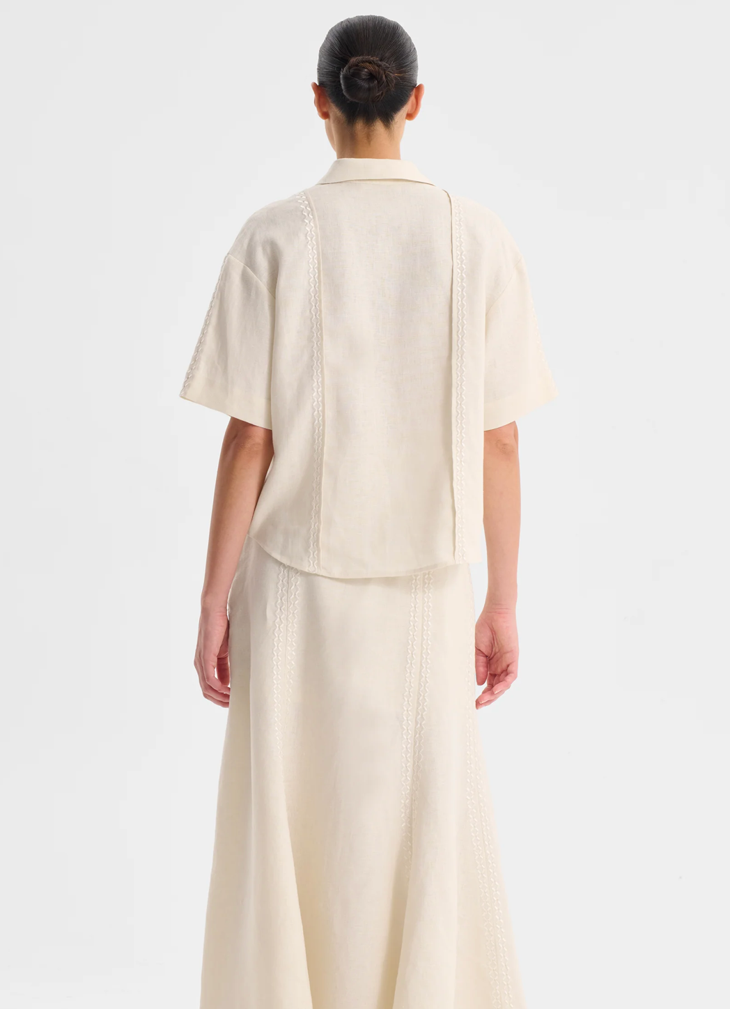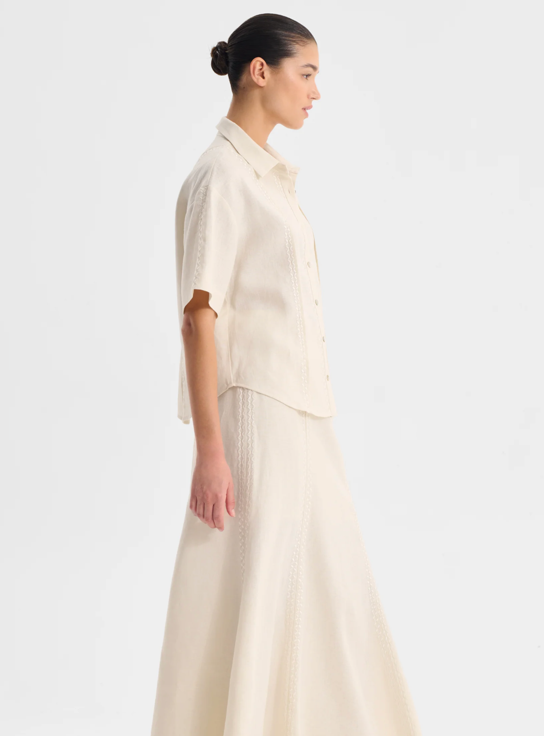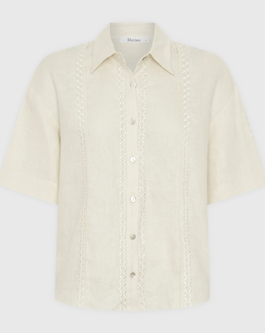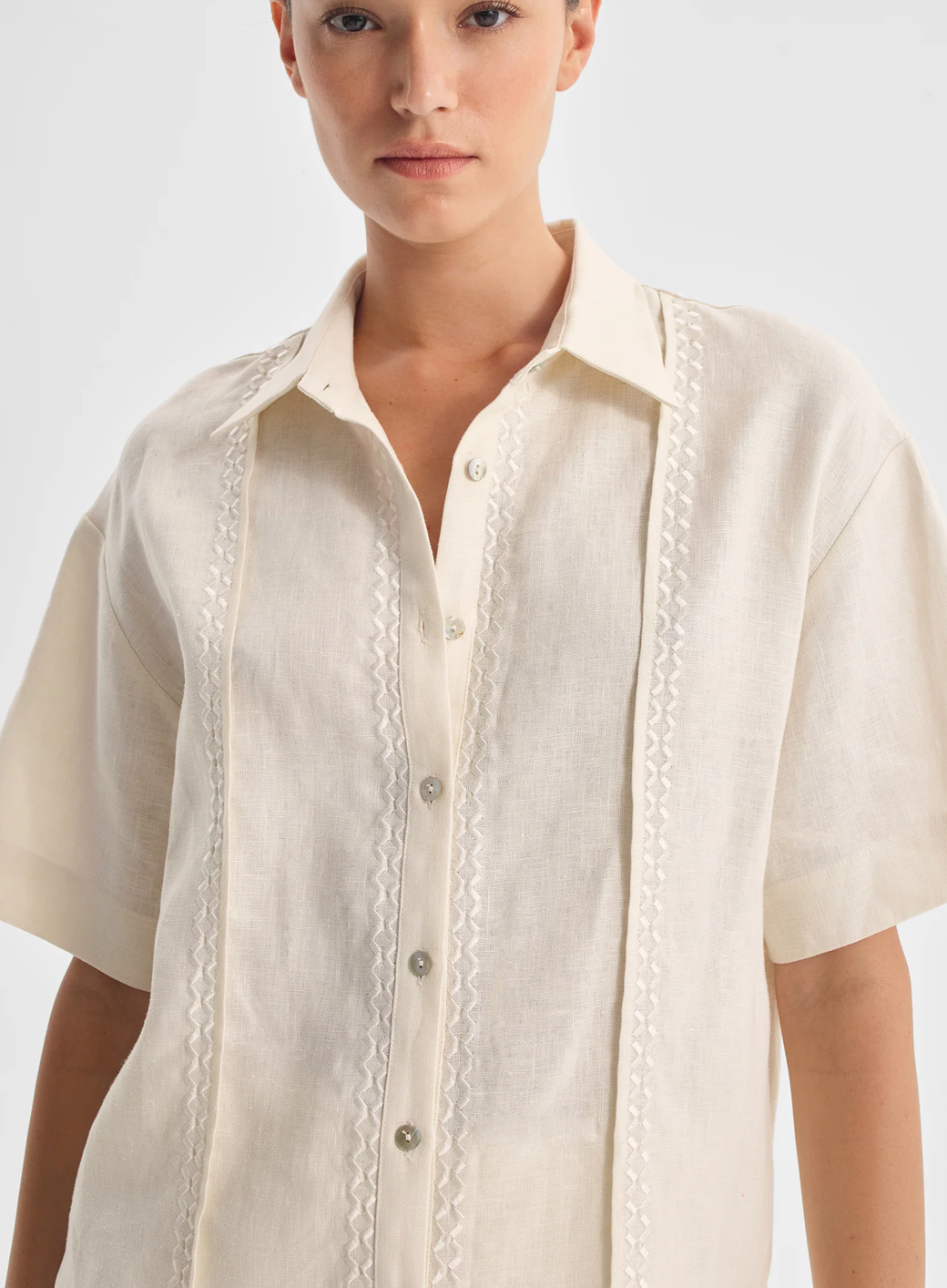 Crafted from premium mid-weight linen with an exclusive embroidery design, the Maisey Shirt features a traditional collar, button front placket, and dropped shoulders. Finished with elbow-length sleeves and a straight fit through the body for an effortlessly relaxed silhouette.