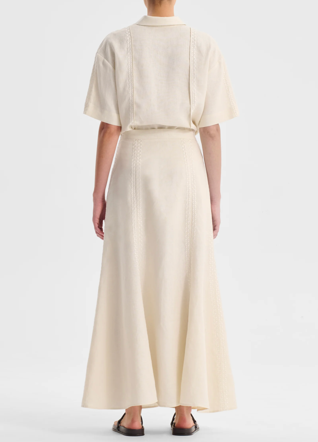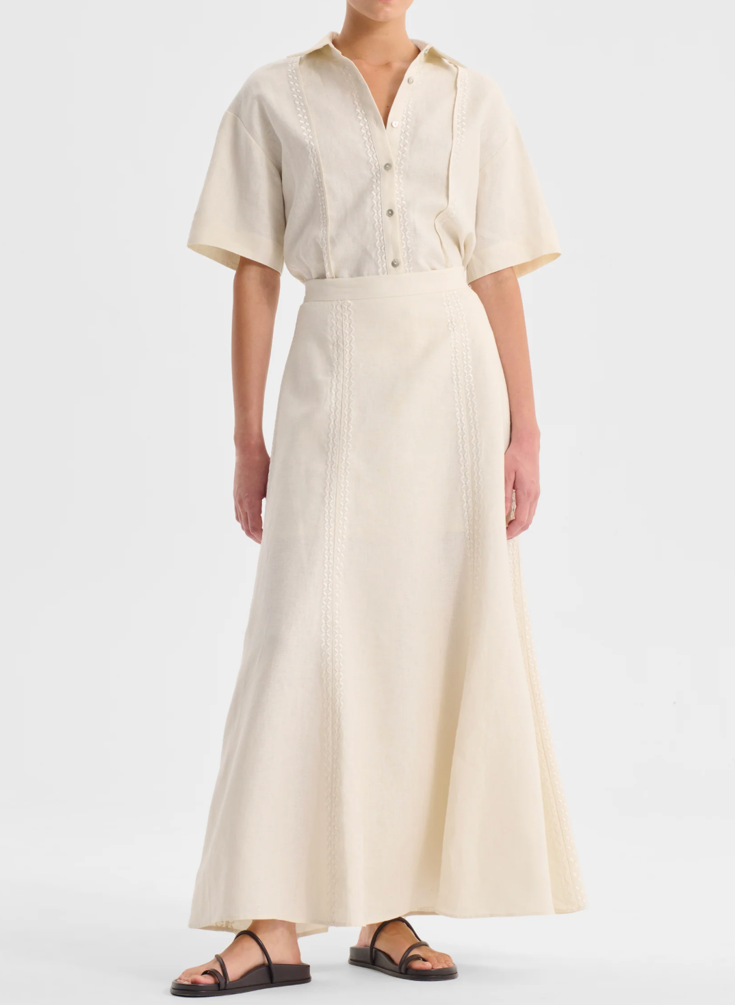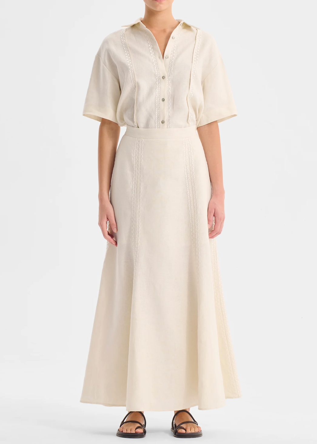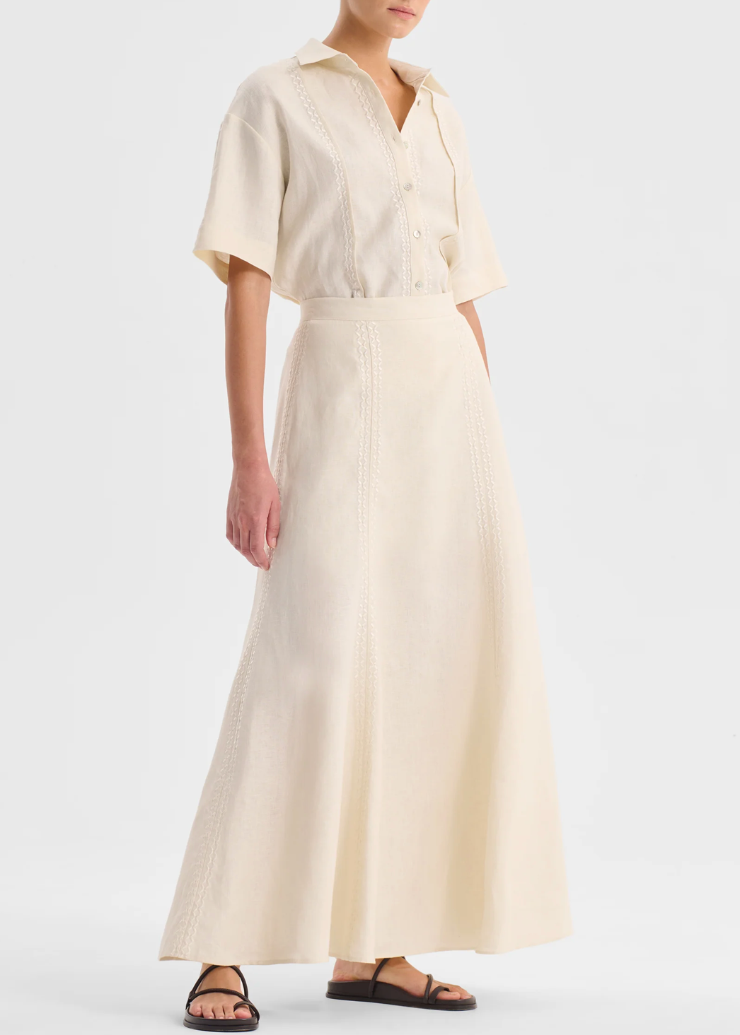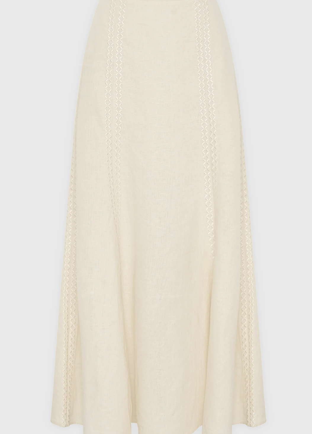 Crafted from premium mid-weight linen with an exclusive embroidery design, the Maisey Skirt features a flared silhouette and an invisible side zip for a seamless finish. Cut to a maxi length and fully lined in cotton, it combines comfort with effortless elegance.