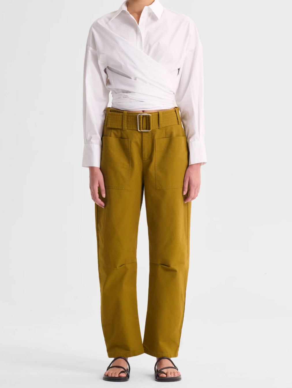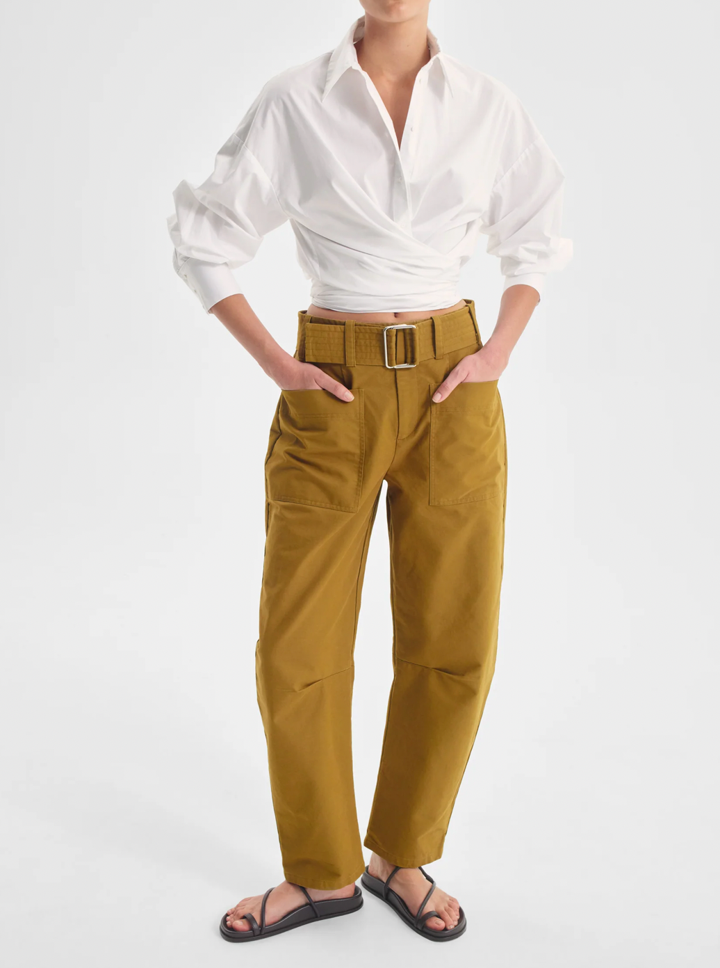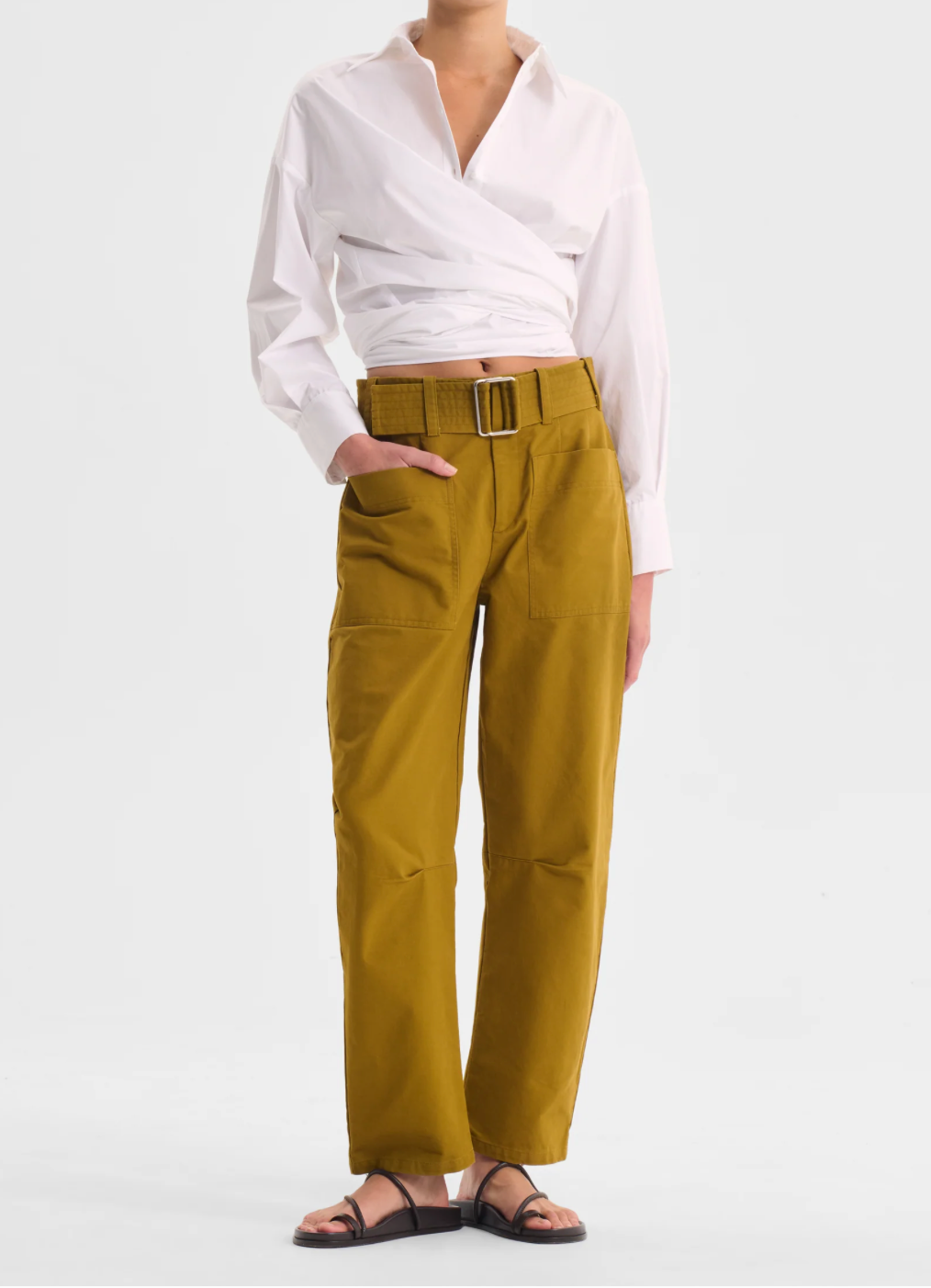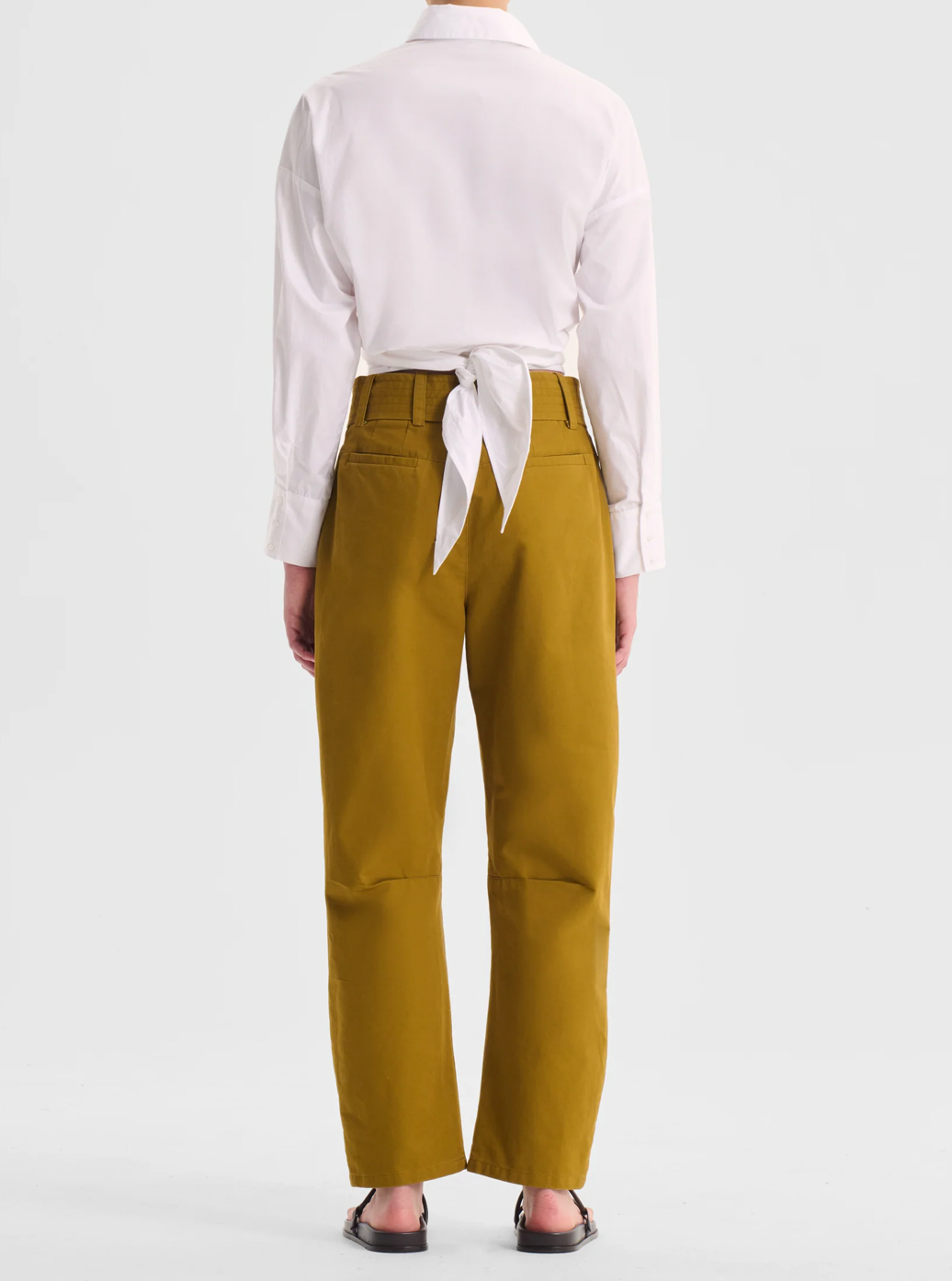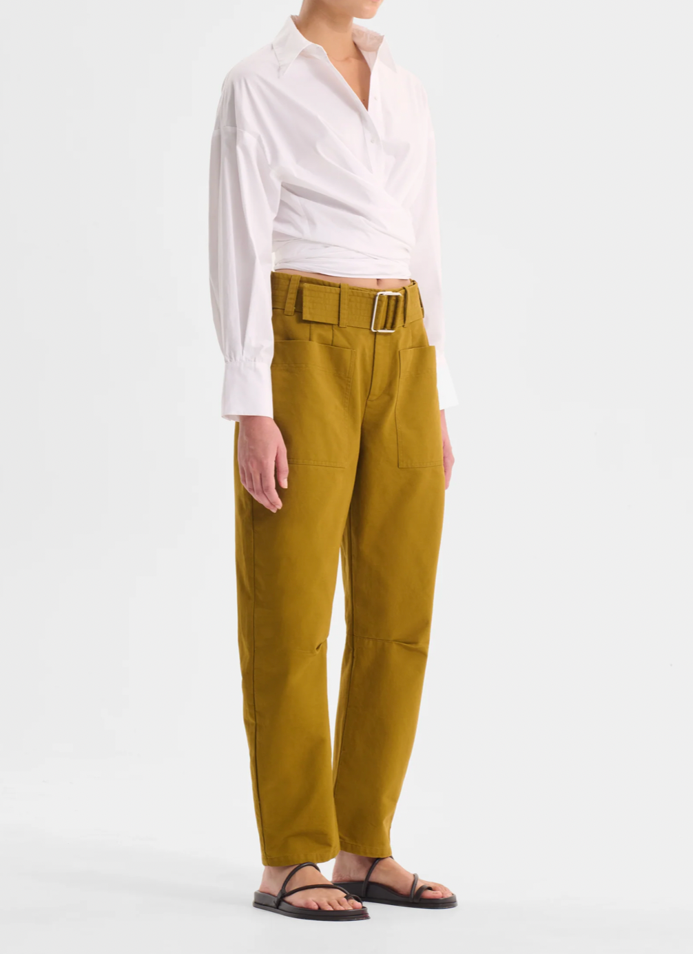 Crafted from mid-weight peached cotton drill, the Marique Pant sits high on the waist with tailored darts at the front and back for shaping. Featuring patch pockets, a relaxed crotch, and inner leg darts, it tapers into a barrel leg silhouette at ankle length. Finished with a self-fabric waist belt for a polished finish.