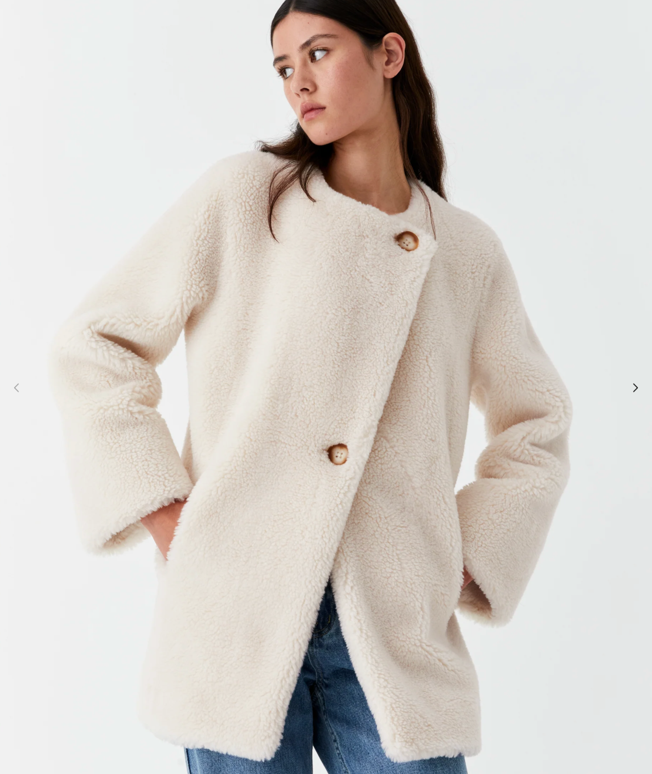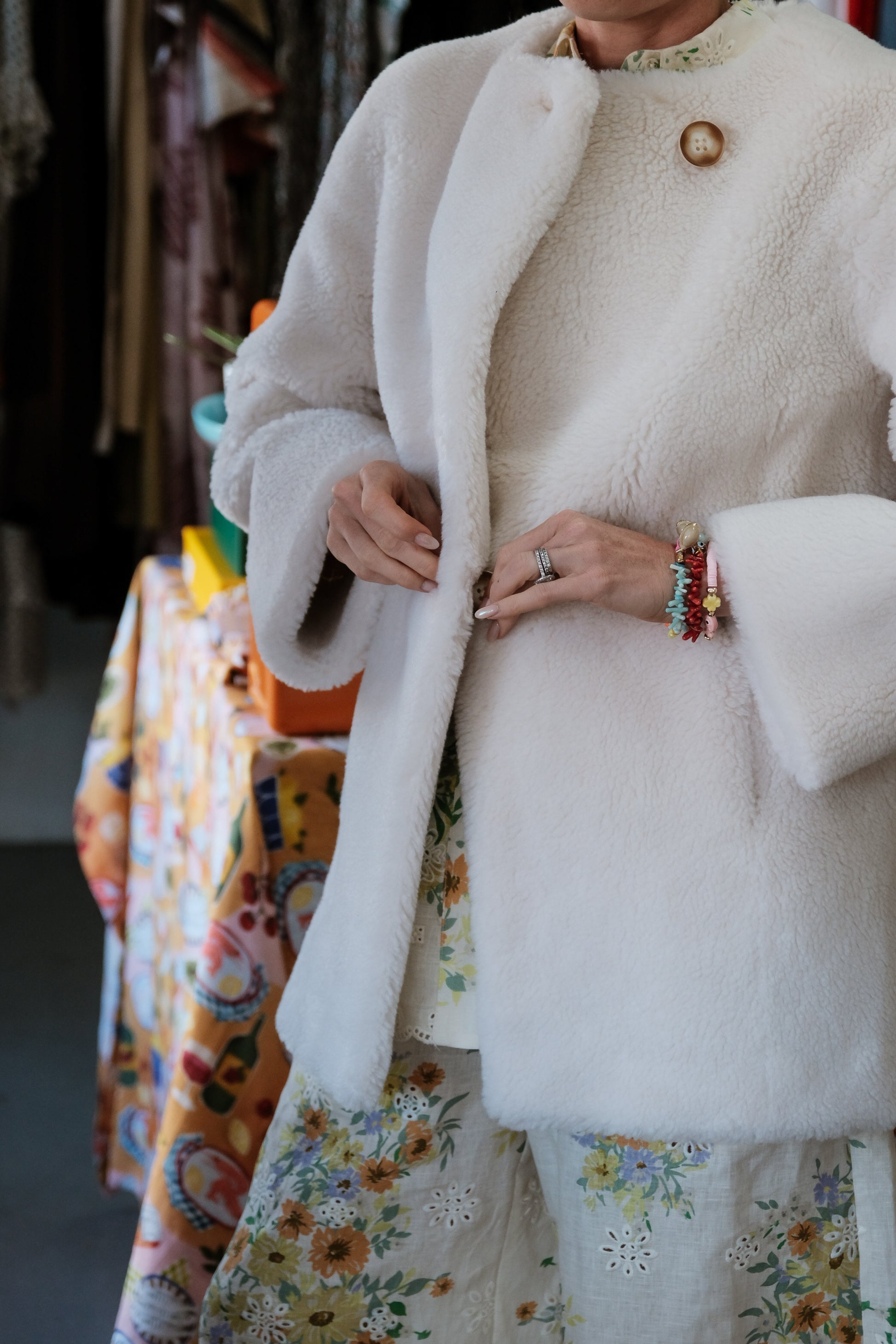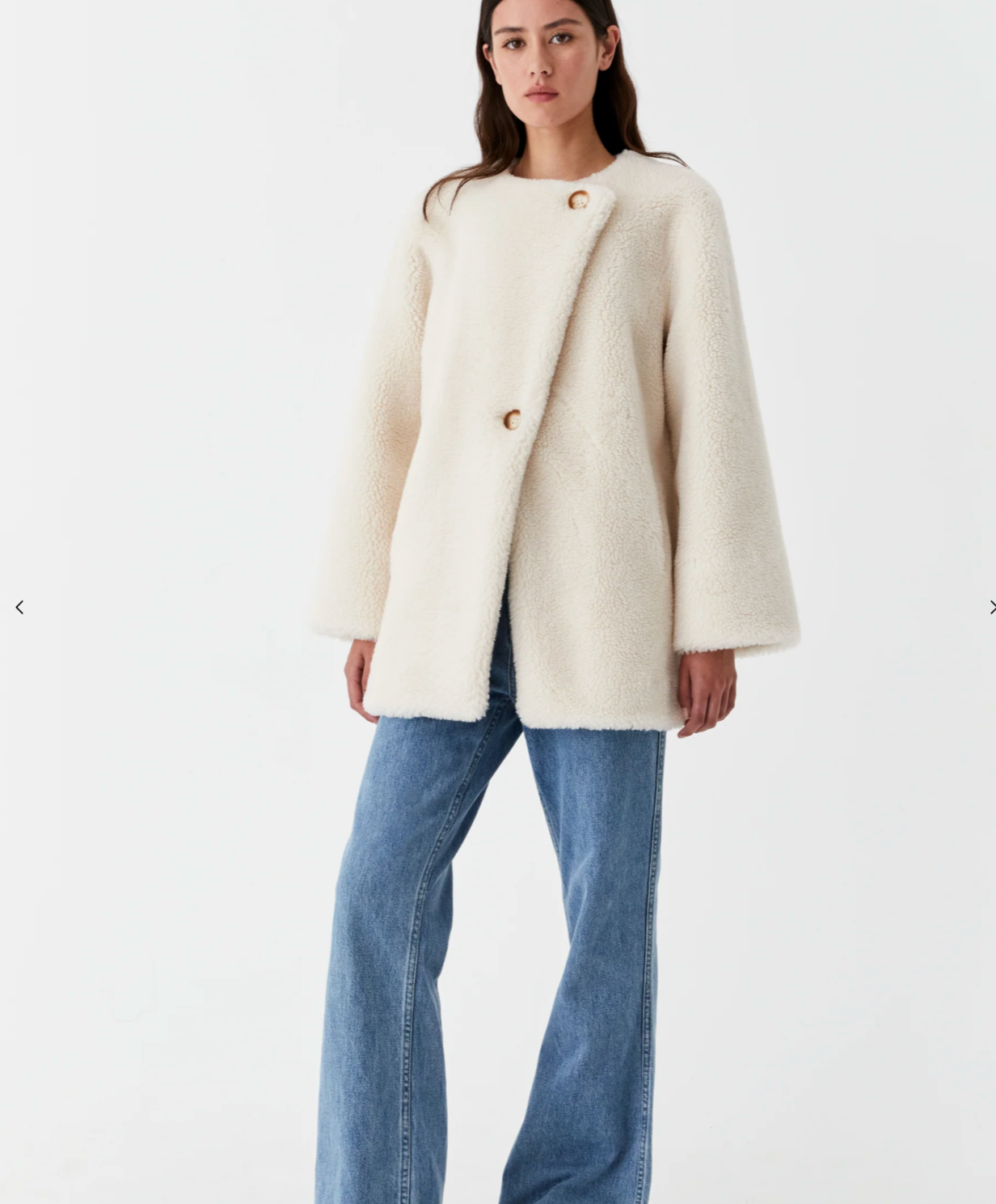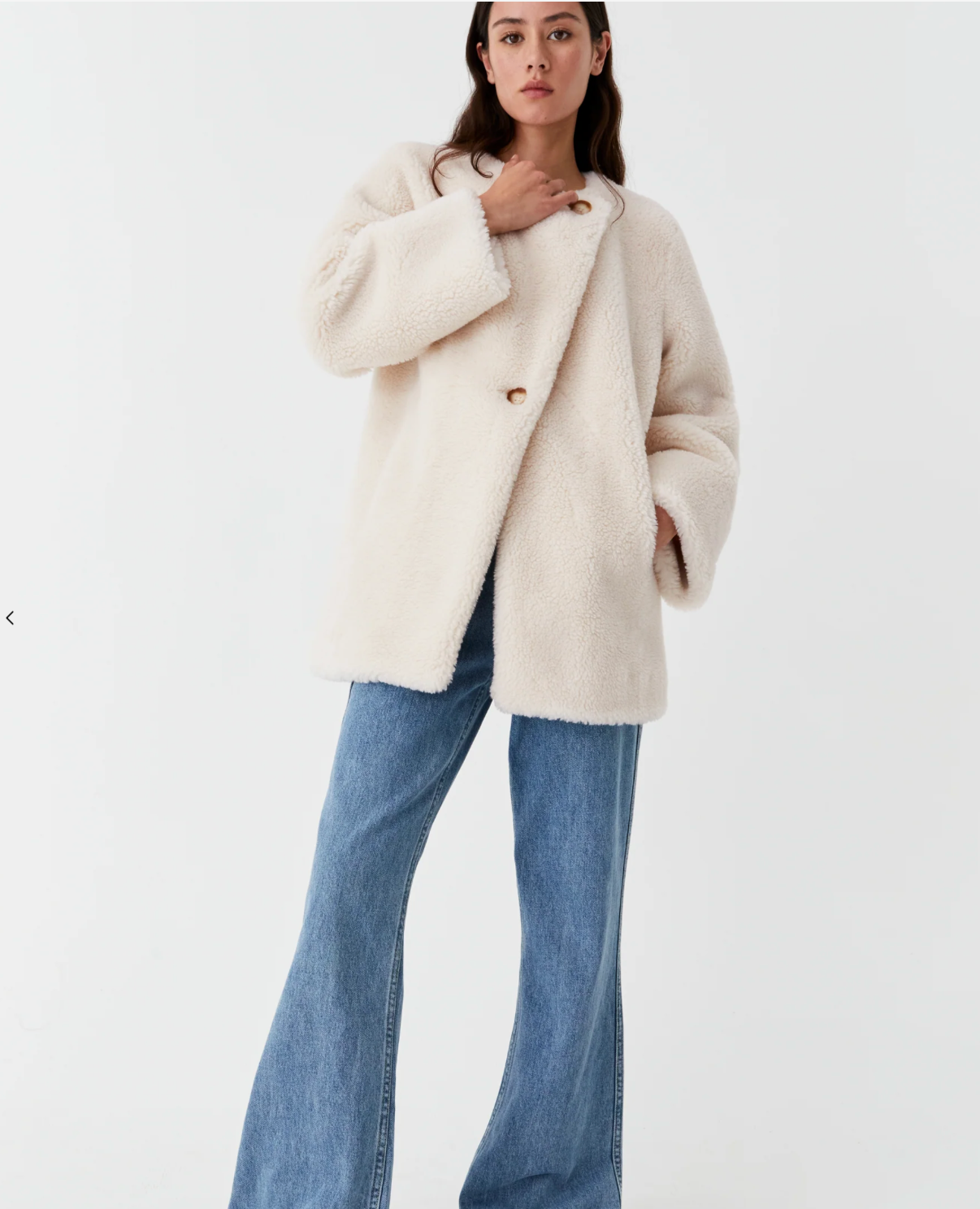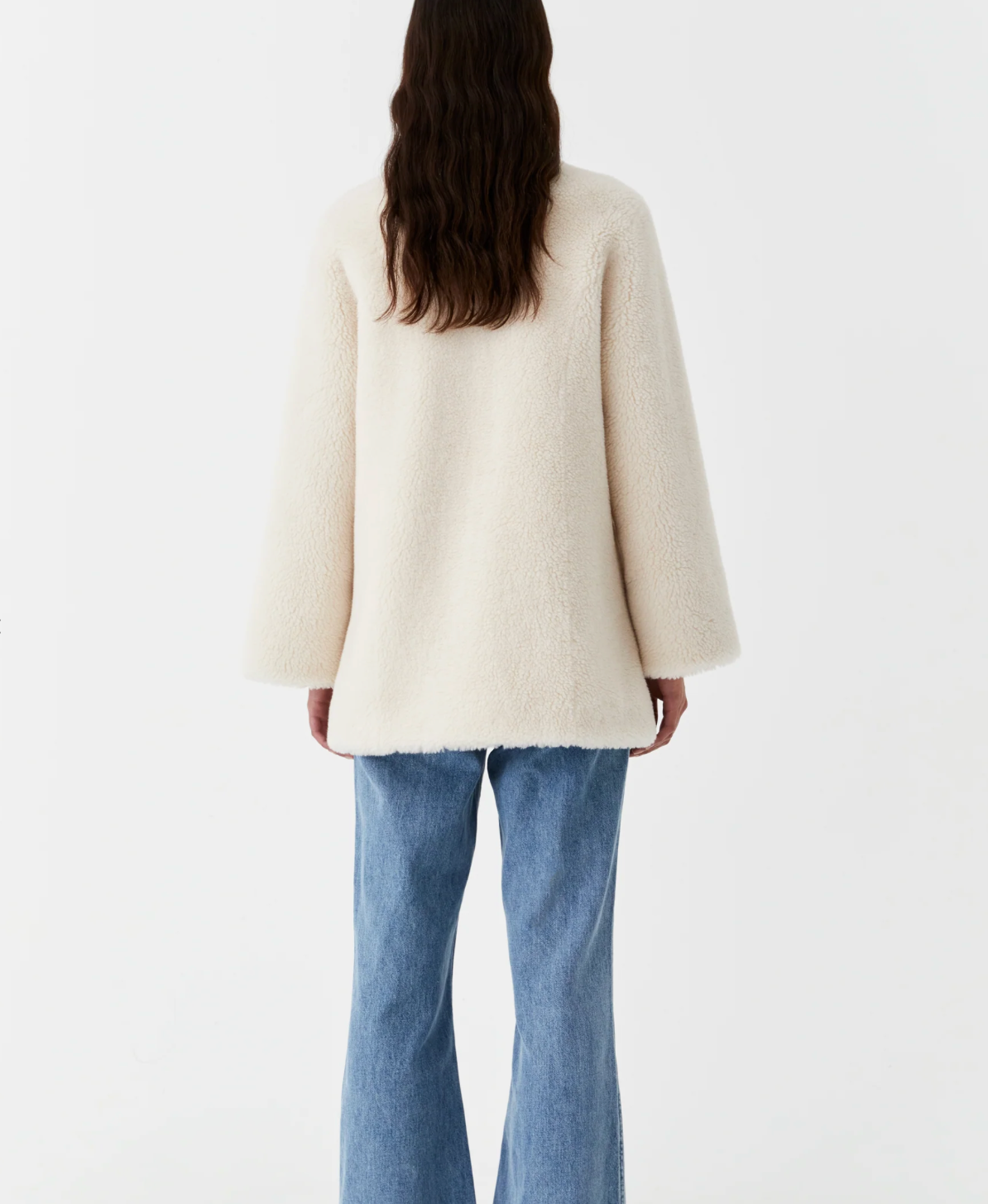 Made from a premium wool-blend shearling, the Porter Jacket in cream combines style with warmth. Designed with a round neckline, wrap front, and button closures at both the neckline and waist, it features full-length sleeves, front pockets, and a tapered fit that flatters the figure.