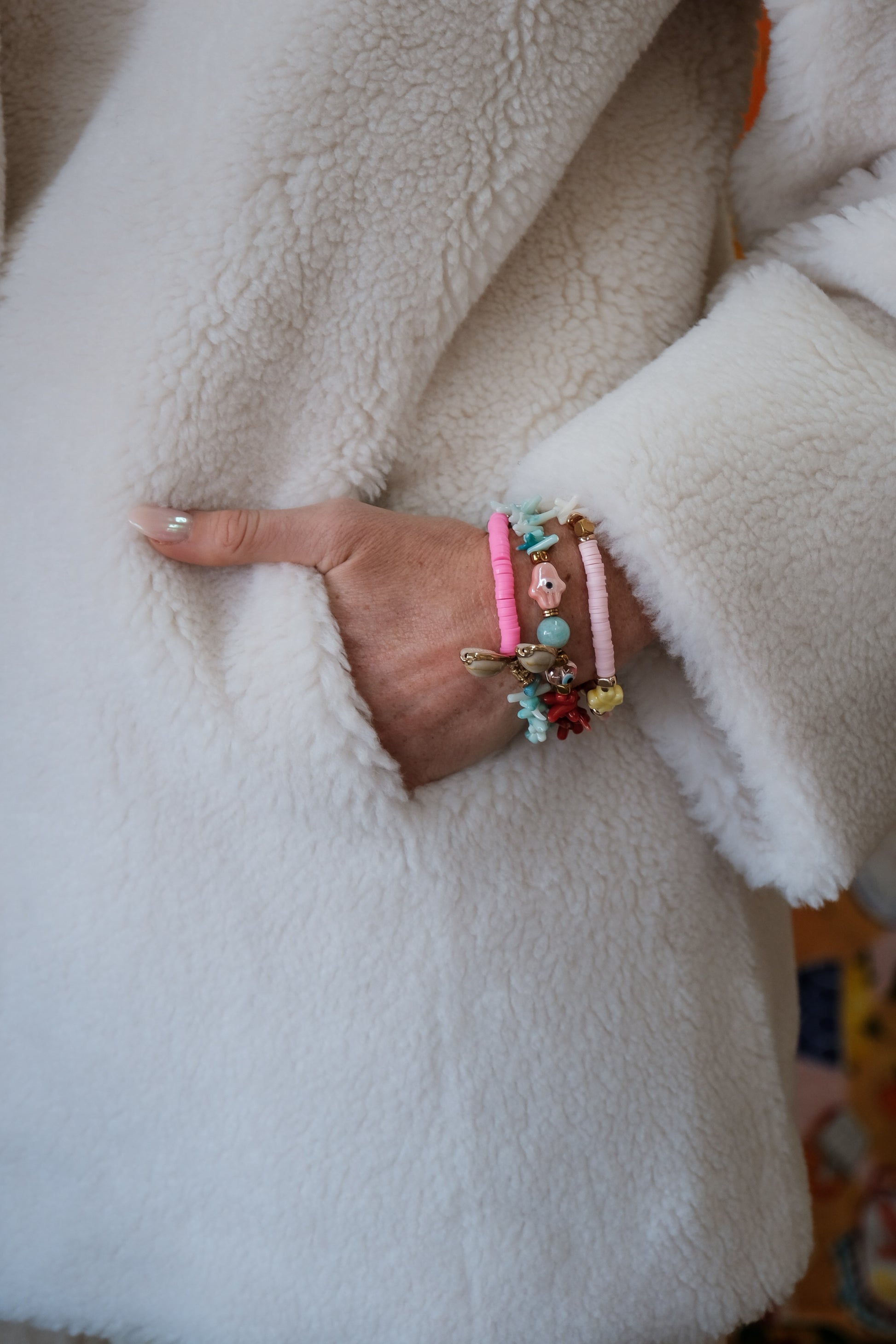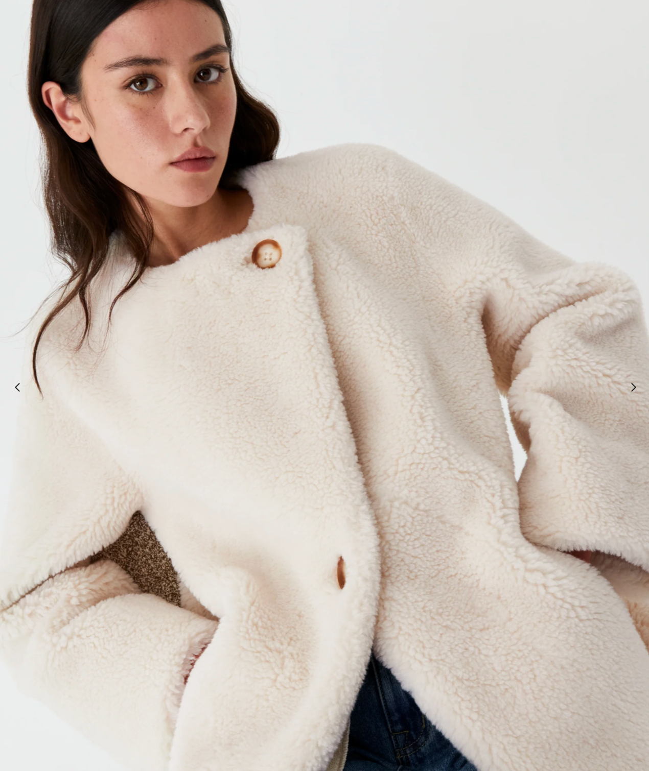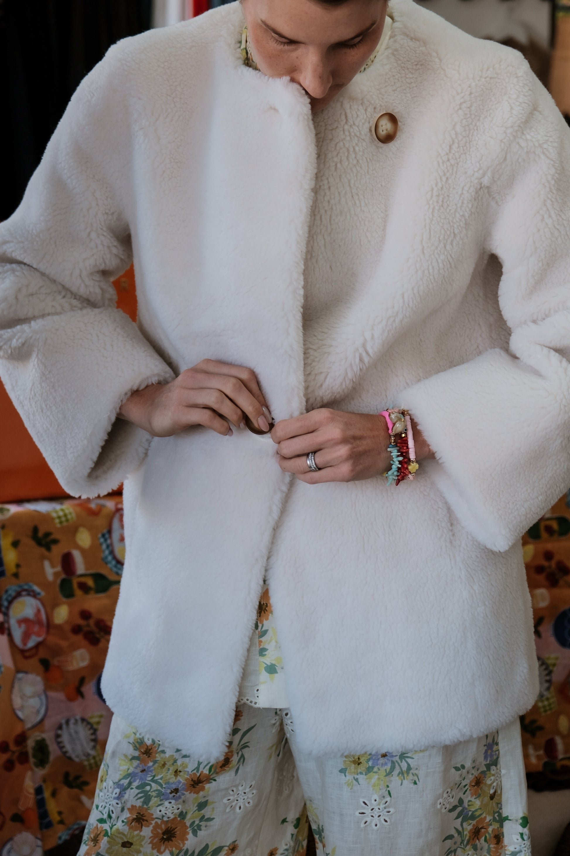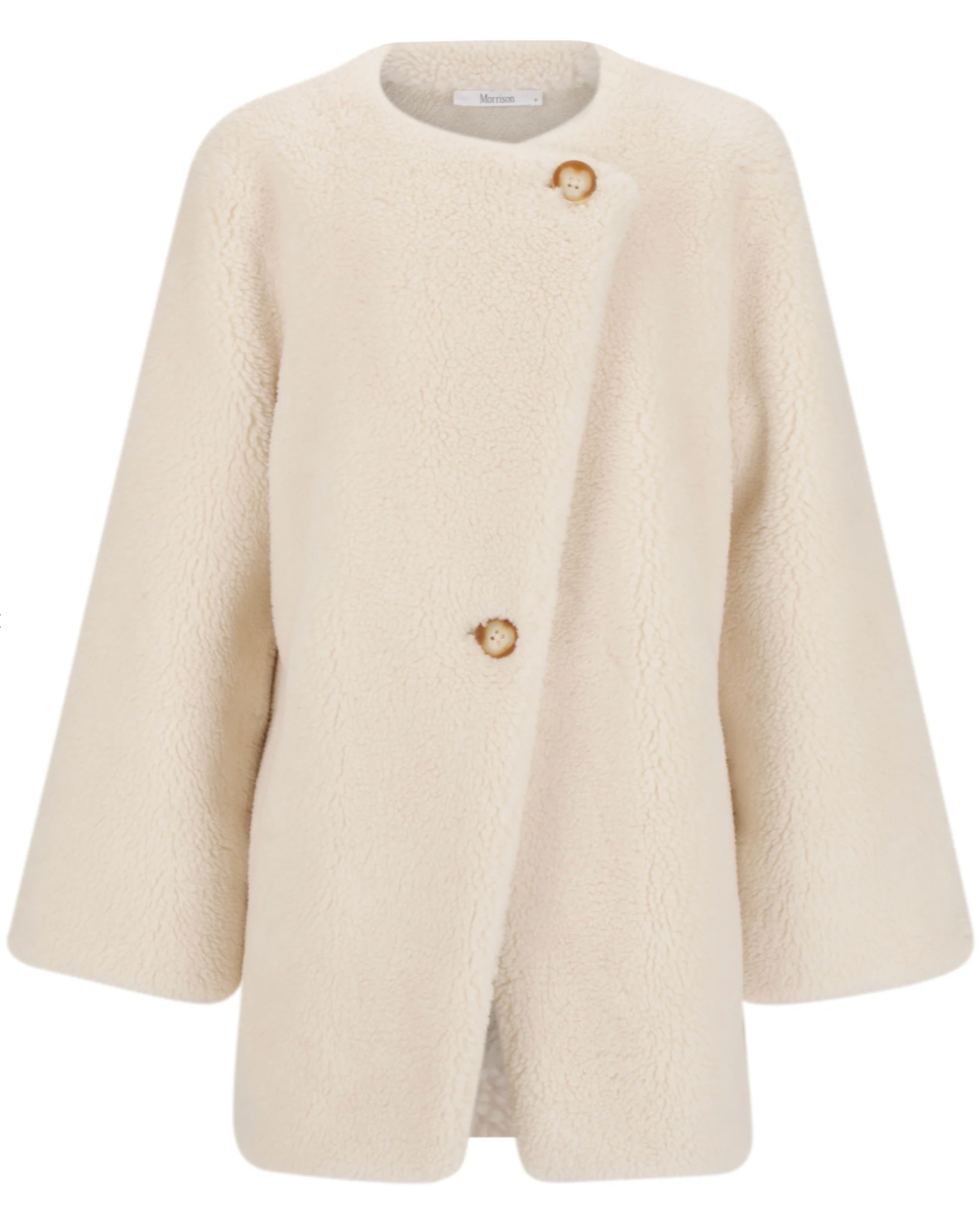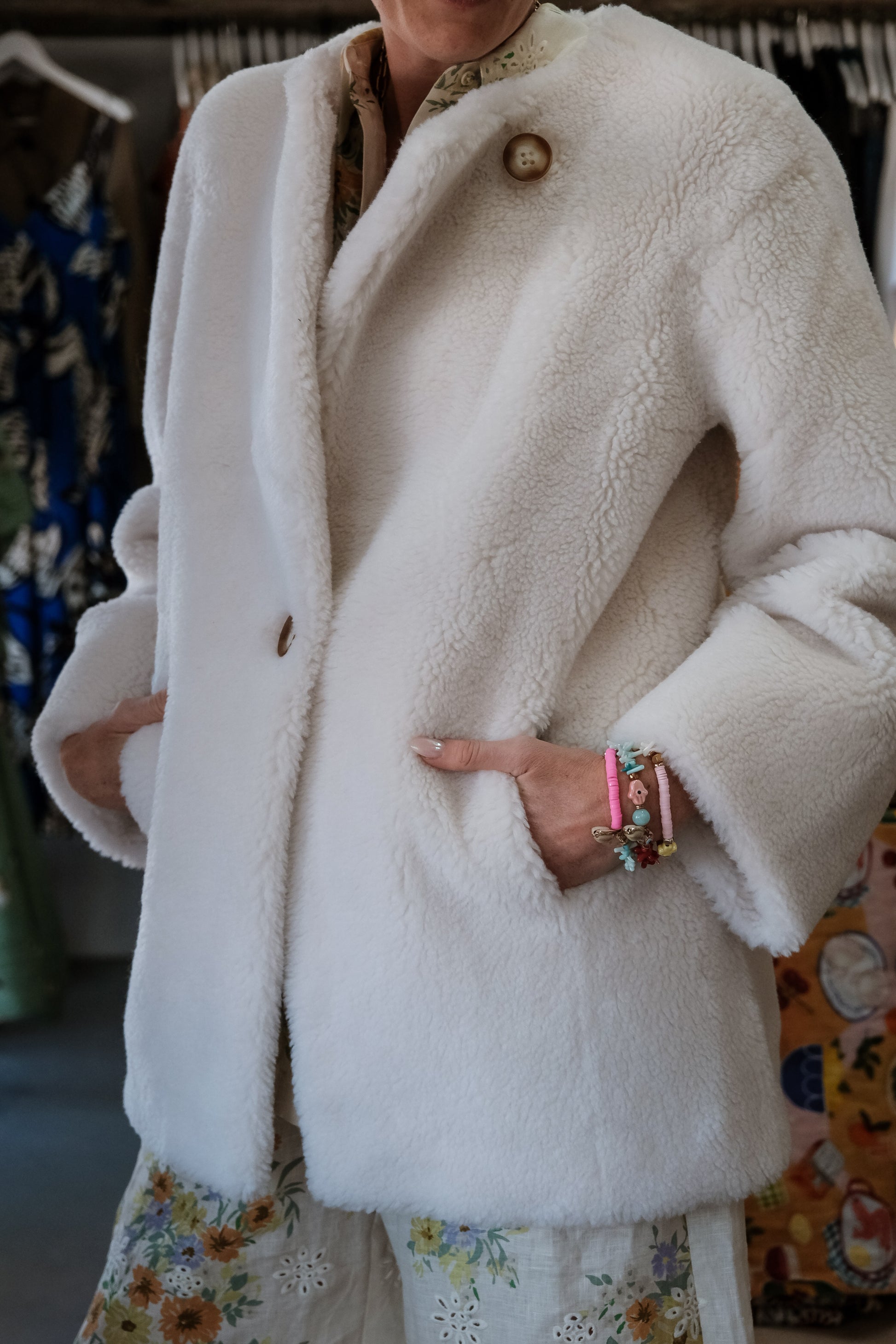 Made from a premium wool-blend shearling, the Porter Jacket in cream combines style with warmth. Designed with a round neckline, wrap front, and button closures at both the neckline and waist, it features full-length sleeves, front pockets, and a tapered fit that flatters the figure.
