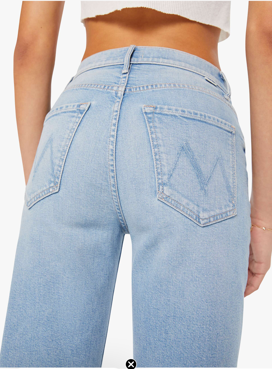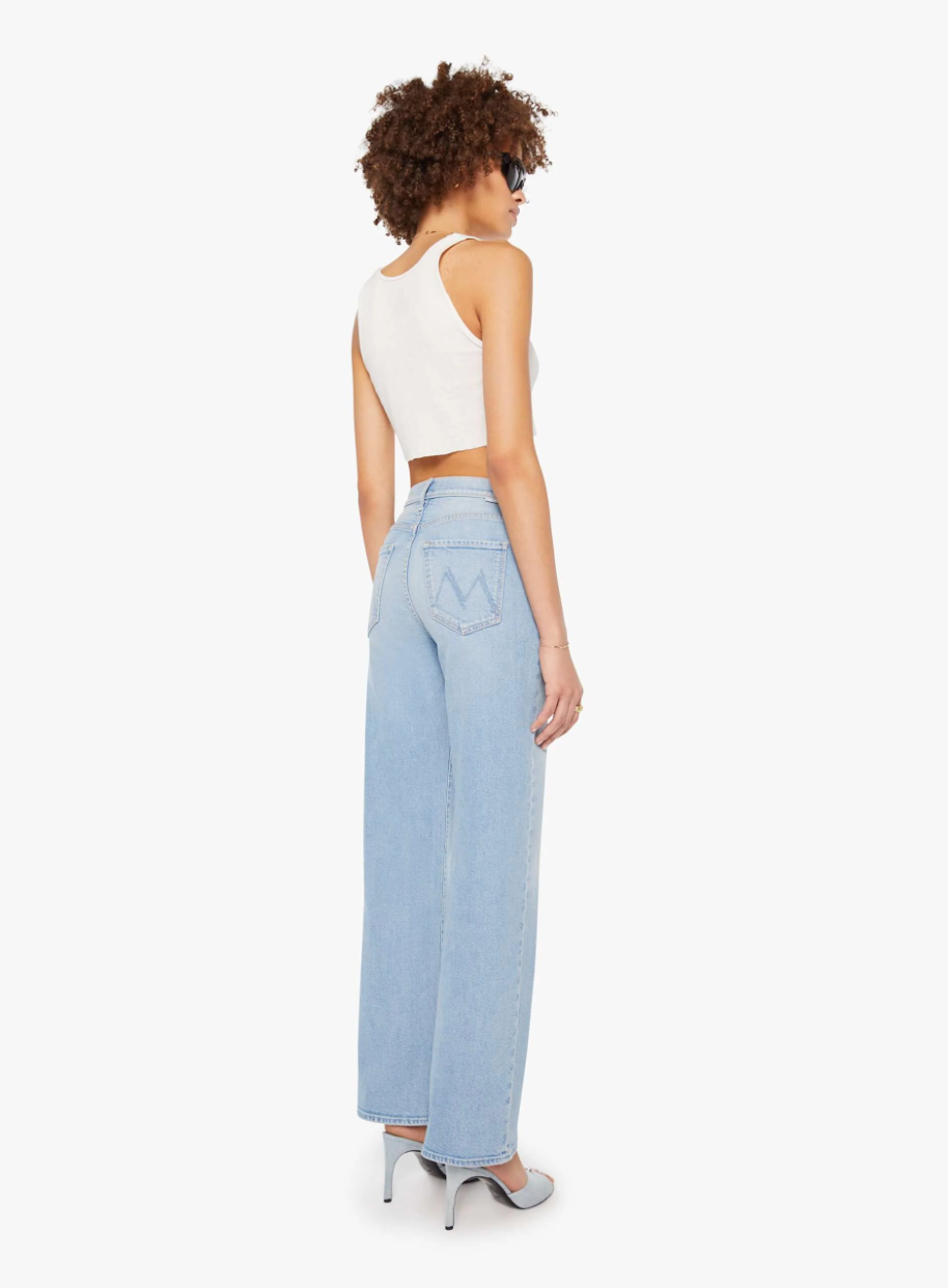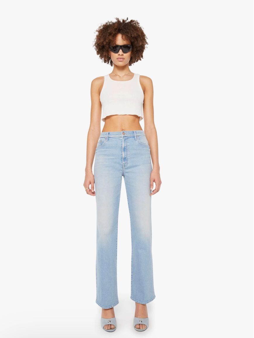 Trail blazer. Super high-rise jeans with a loose fit, wide leg, zip fly and 32-inch inseam with a clean hem. Cut from denim with a touch of stretch, All Fired Up is light blue with whiskering and fading at the knees.