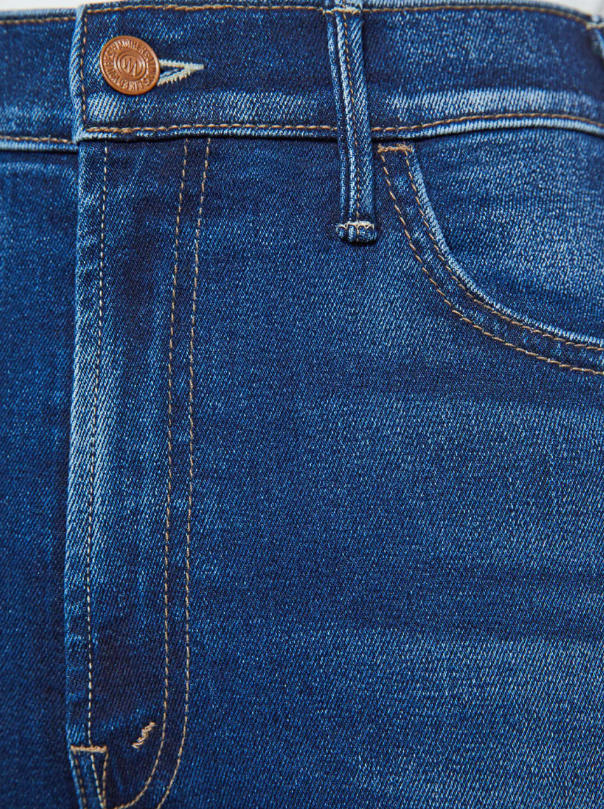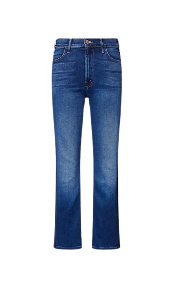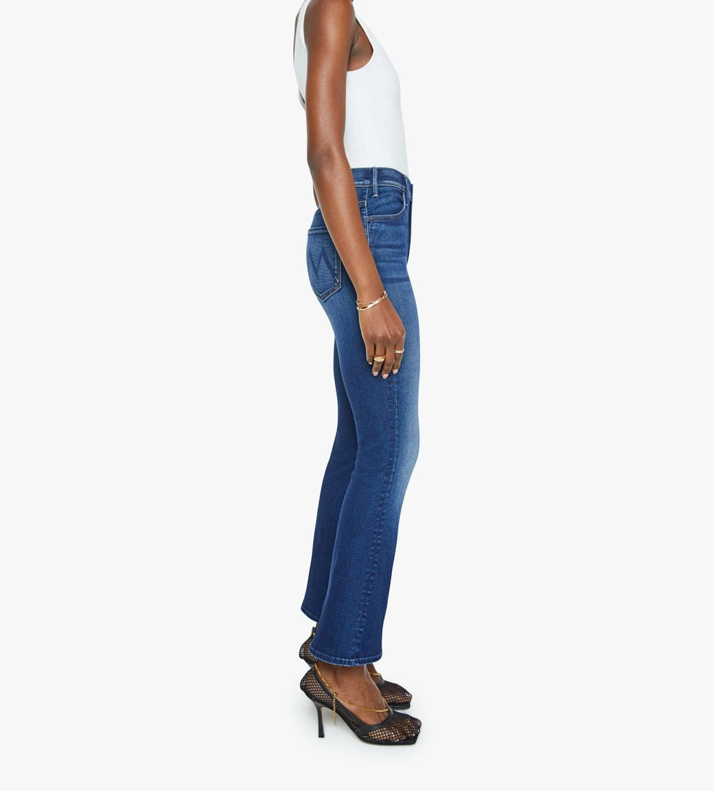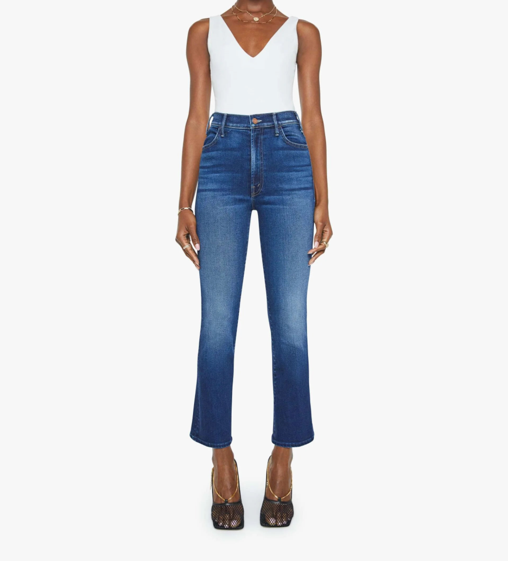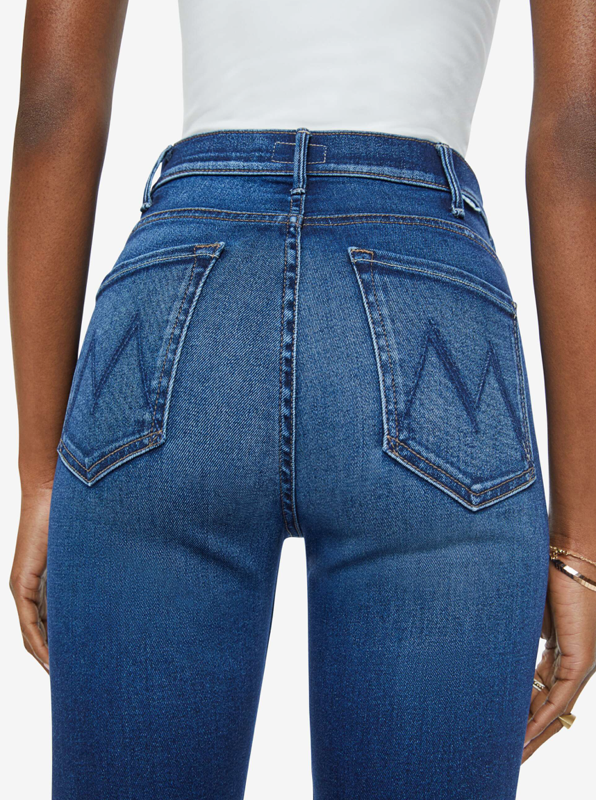 This Best-Selling style from MOTHER is a high-rise ankle length flare Jean features a clean hem and is made from stretch denim. Taking Chances is a dark blue wash with slight whiskering and fading at the knee.