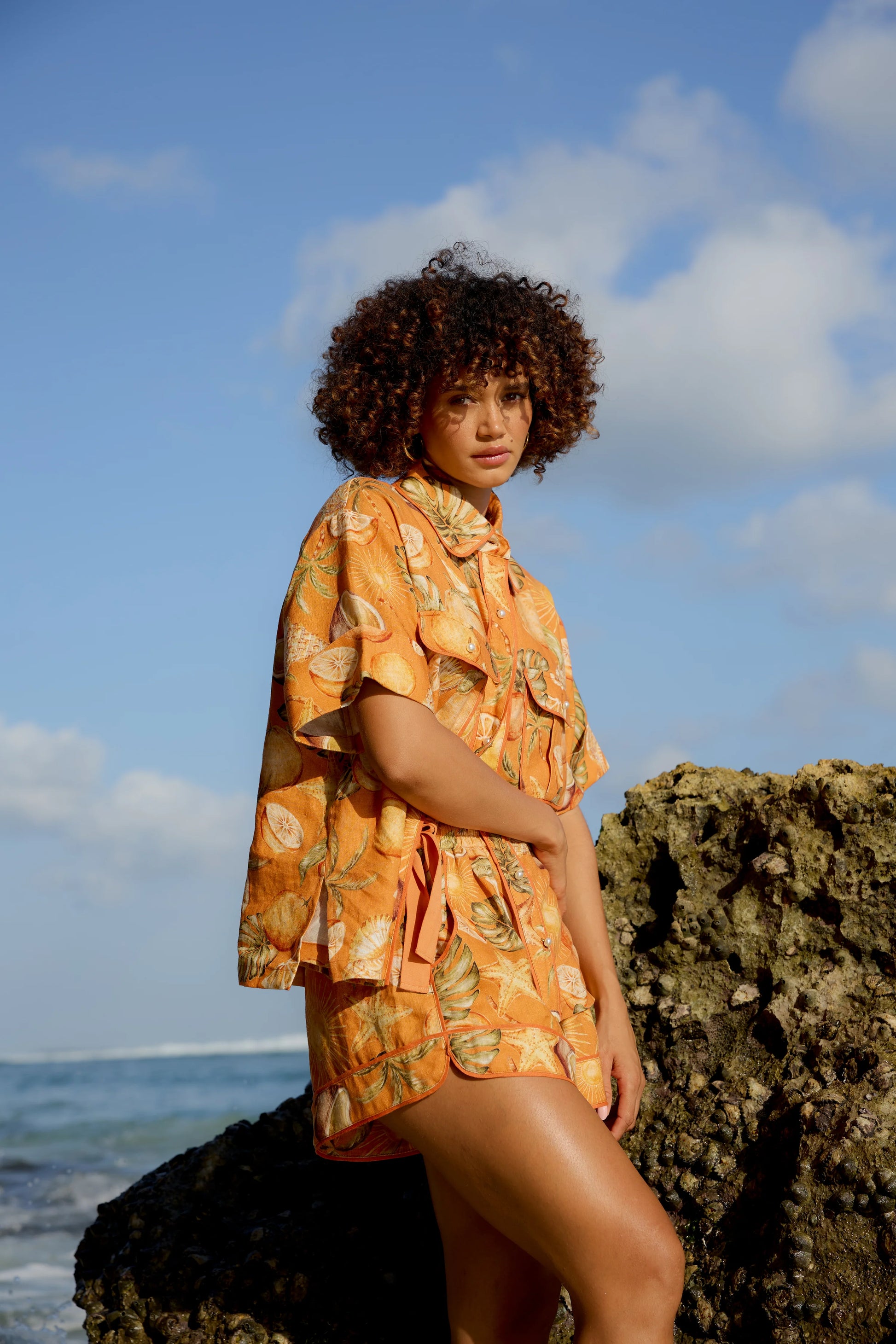 The Coco Loco Linen Shirt in Ochre features an array of hand painted, watercolour motifs including coconuts, star fish and palm trees, digitally printed and crafted in 100% linen. This design is intentionally oversized with a drop shoulder, featuring double breast pockets, collar and faux pearl buttons. Contrast flat piping frames the collar, centre front placket and breast pockets. Designed to be paired with the Coco Loco Linen Short.