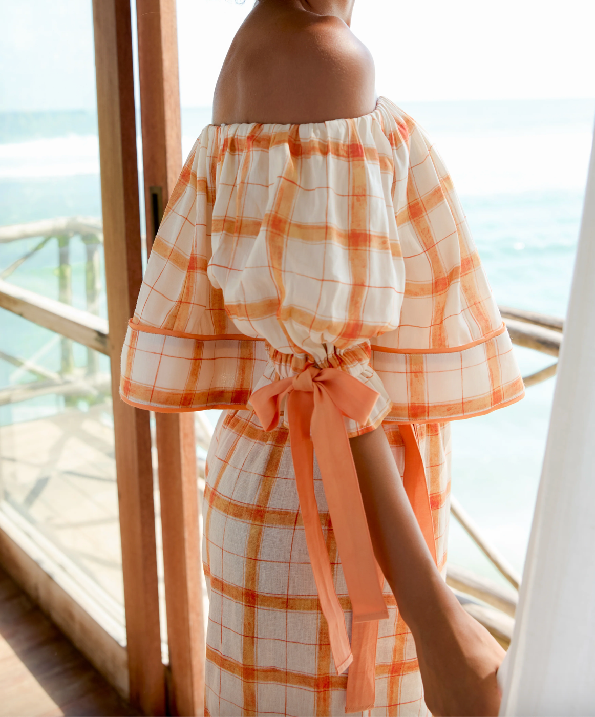 The Le Soleil Top in Mandarine Gingham features a hand painted, watercolour gingham artwork, digitally printed and crafted in 68% linen 32% silk. Designed to be worn off the shoulder with a full elasticated neckline, this style features true bubble sleeves, finished with a frill and gathered in by Mandarine coloured, grosgrain ribbons. The Le Soleil Top is cropped in length and increases in volume from neckline to hem, intentionally weighted at the hem to float and bounce with movement.