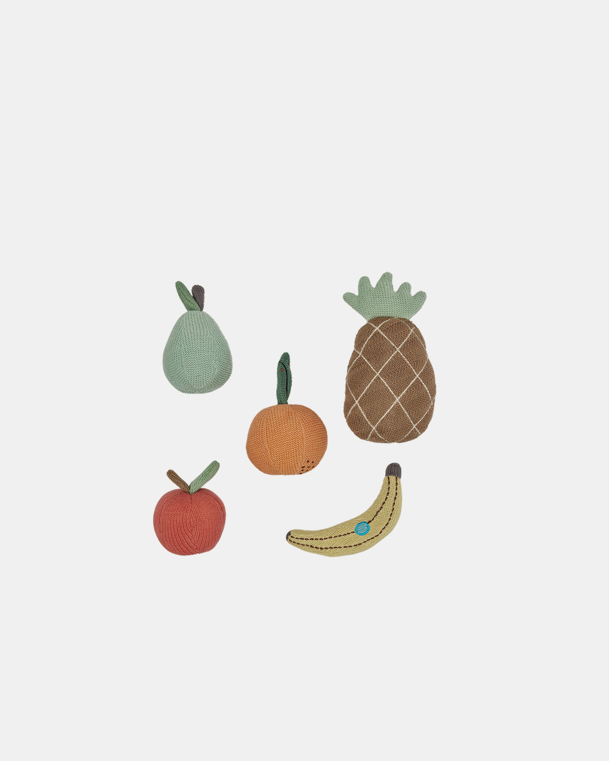 Yummy Mini Fruits set features a delightful collection of an apple, banana, pear, orange, and pineapple. Made from 100% cotton with 100% polyester filling, these soft and playful fruits provide endless fun for imaginative play. Perfectly packaged in a charming fabric bag, this set adds a touch of fruity magic to your child's playtime adventures.