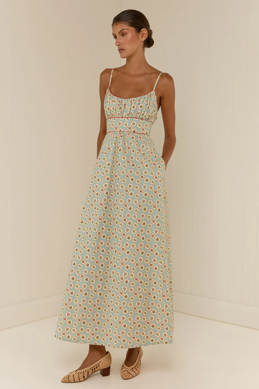 The Bambi Dress is crafted from a premium Cotton Poplin in our exclusive Tarda print. Designed with a ruched bust and fitted waist panel for a flattering and feminine silhouette, it features contrast piping for a refined finish. An elasticated back panel ensures ease of fit, making this an elevated yet effortless everyday style.