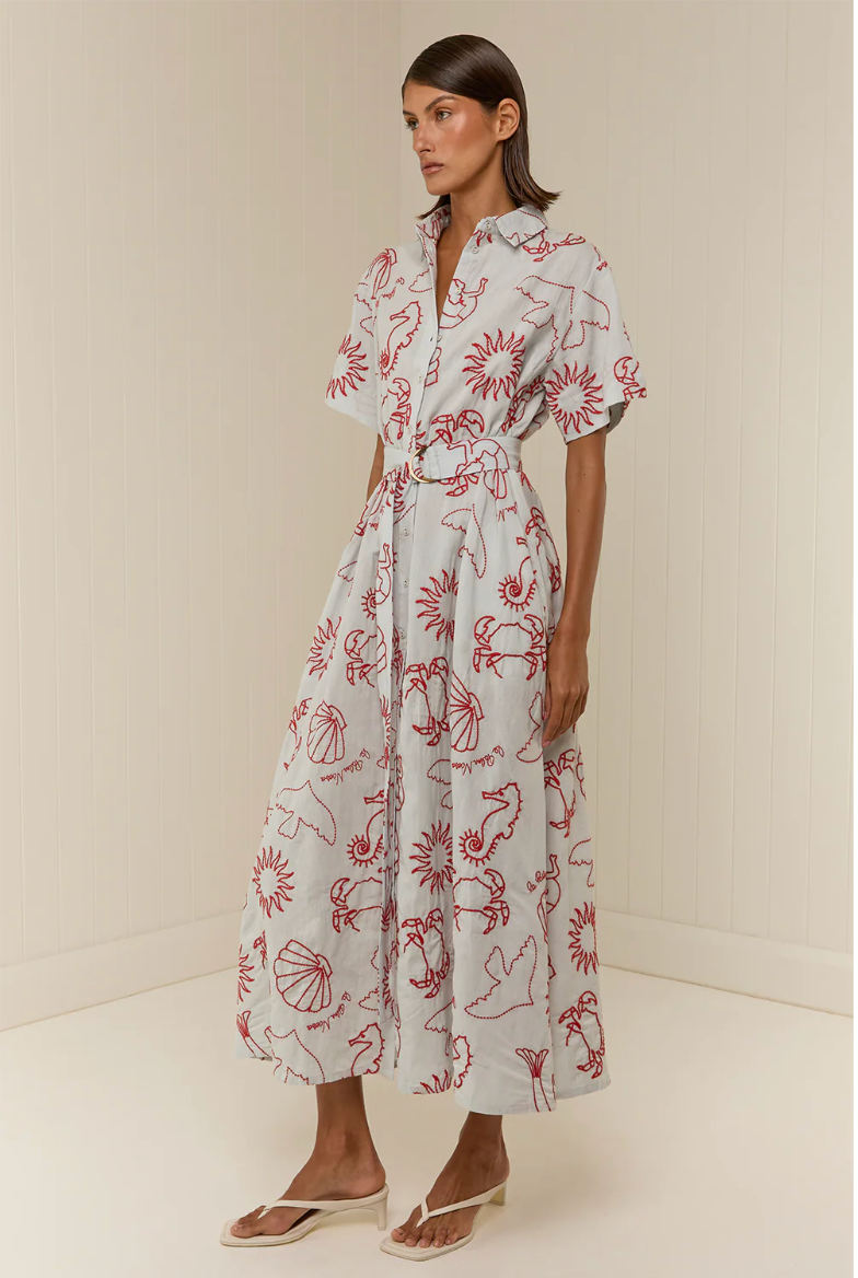 The Token Dress is crafted from a premium Cotton Linen blend, printed in our exclusive Le Palm print. The Token Dress features an all-over contrast embroidery detailing and is designed as a relaxed fit, featuring cuffed sleeves and centre front button detailing. Style with a matching D-ring belt to cinch the waist and create a relaxed yet elevated look.