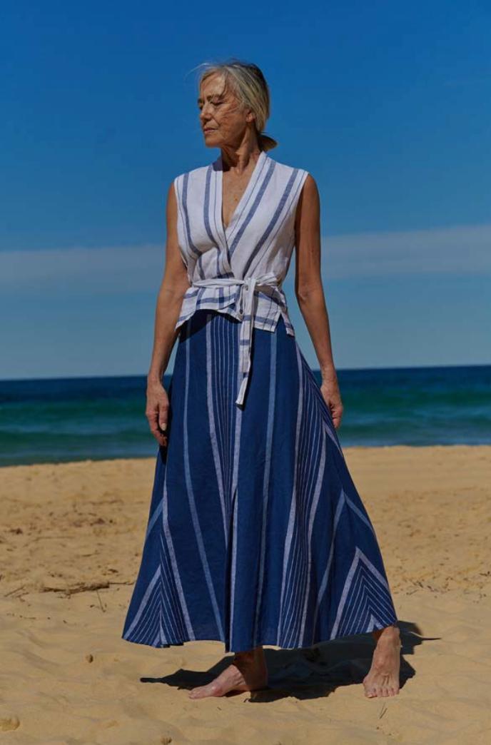 The Long A Line Skirt is a full-bodied circle skirt with a flat waistband. The linen material is a soft washed, lightweight and the skirt is elegant in its drape. The skirt also has two side pockets