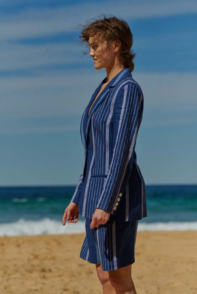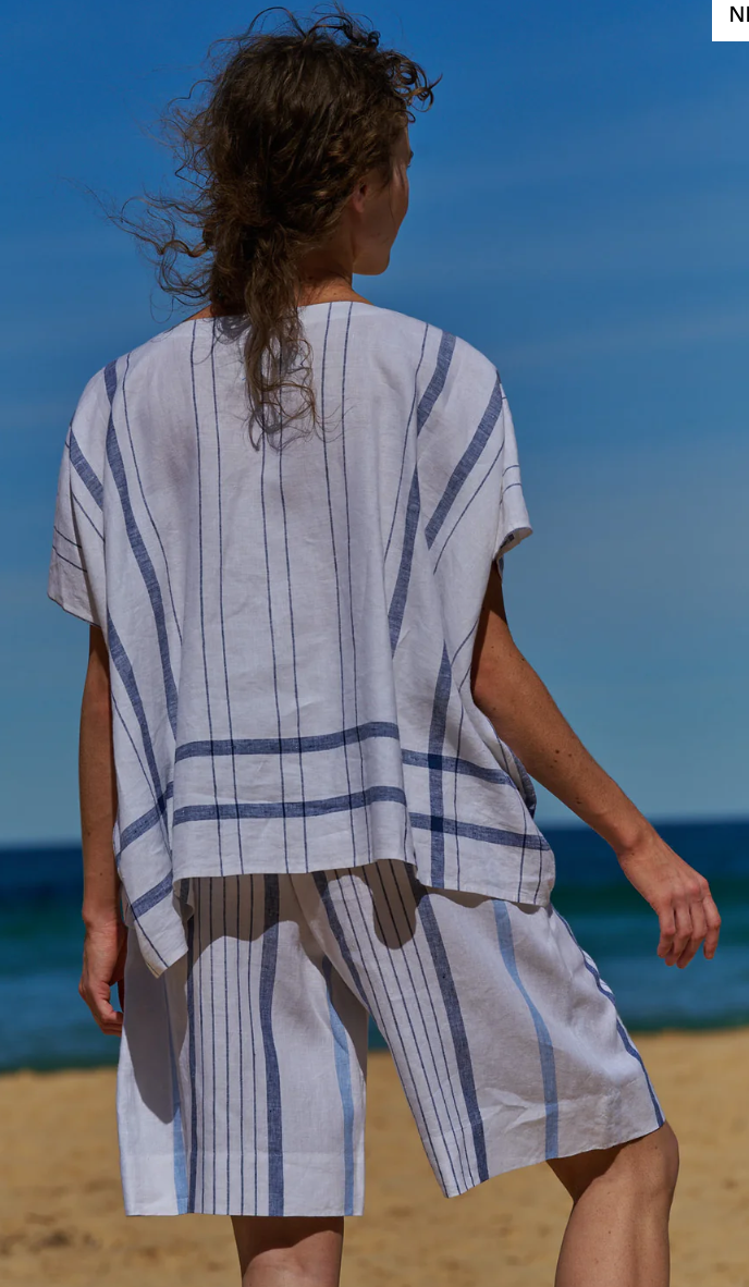 A relaxed linen short with an elasticised waist, the shorts fall above the knee. The shorts features a wide hem band, side pockets and a tie which is detailed with fraying and white hand stitching.