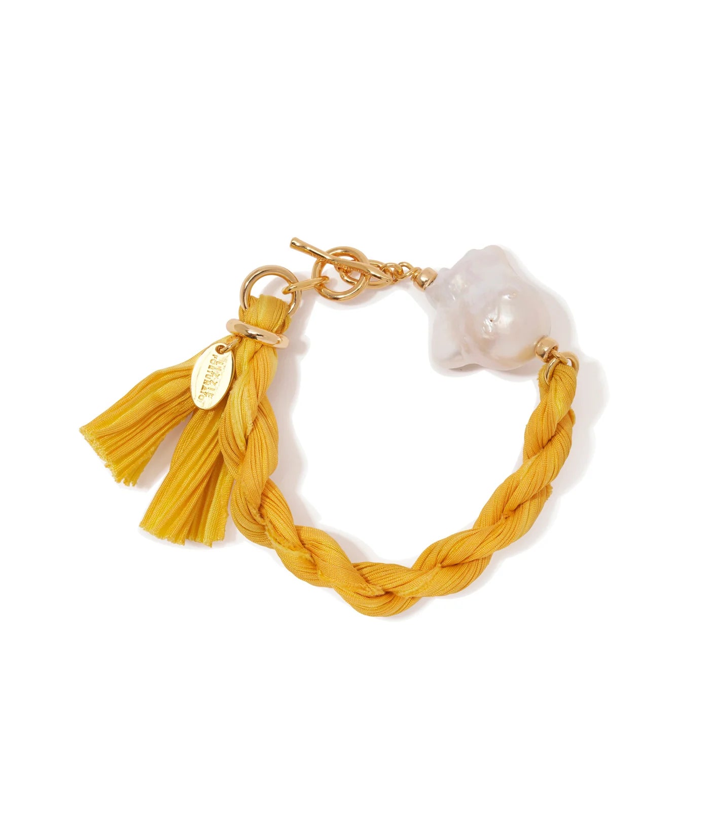 Twist and shout for a gorgeously tactile bracelet rendered in shibori silk ribbon, with large freshwater pearl and gold-plated brass toggle closure. Available in Yellow or light pink.