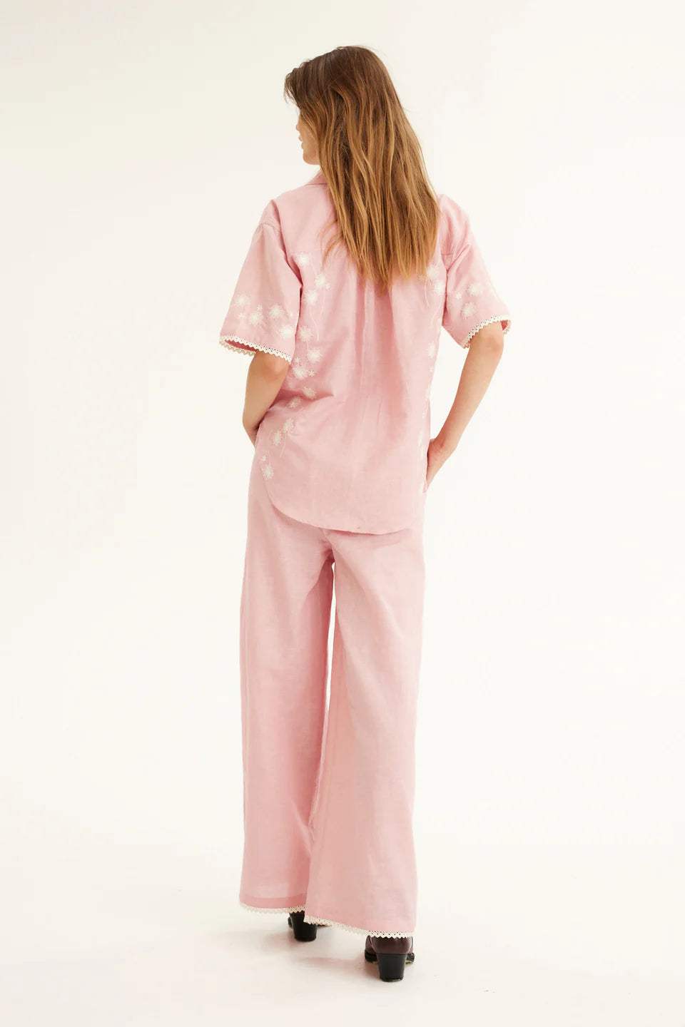 Beautiful linen relaxed shirt with ivory embroidered florals. True to size. Buy your normal size.