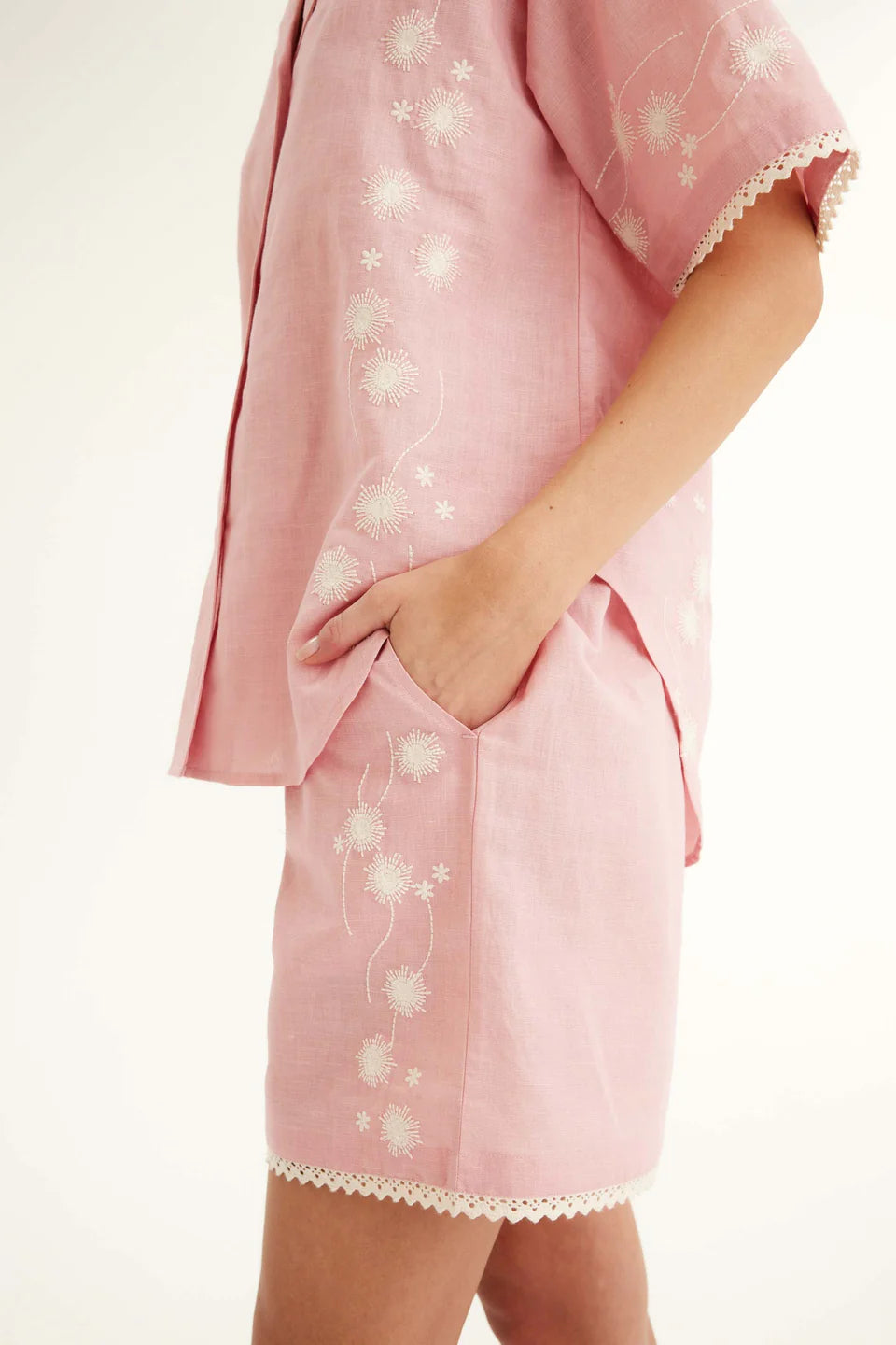 Rosie Shorts features elastic at the waist with tie strings at front and side pockets. high waisted, relaxed mid length short.