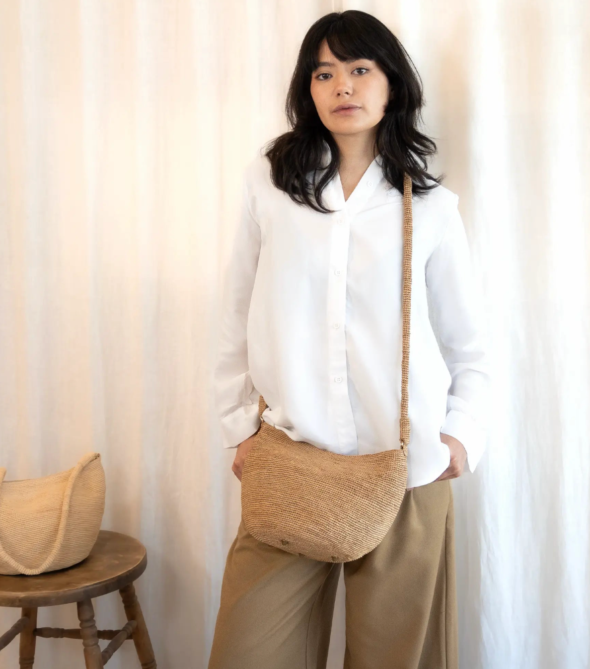 It features a soft tubular strap and versatile two-way carry: wear it crossbody for everyday ease, or by its short handle as a chic handbag. Fully lined with a secure zip closure, the KIBO Bag is the perfect blend of artisanal craftsmanship, sustainable design, and timeless practicality.