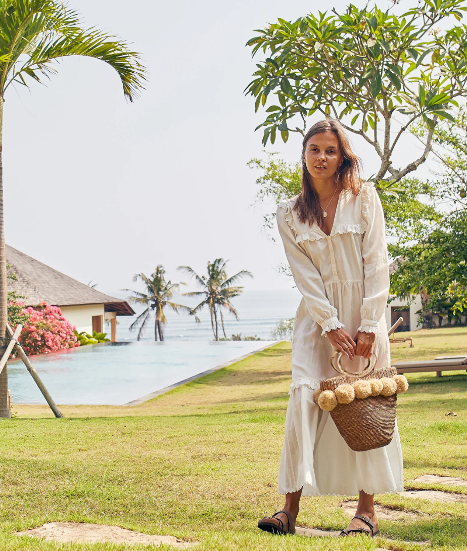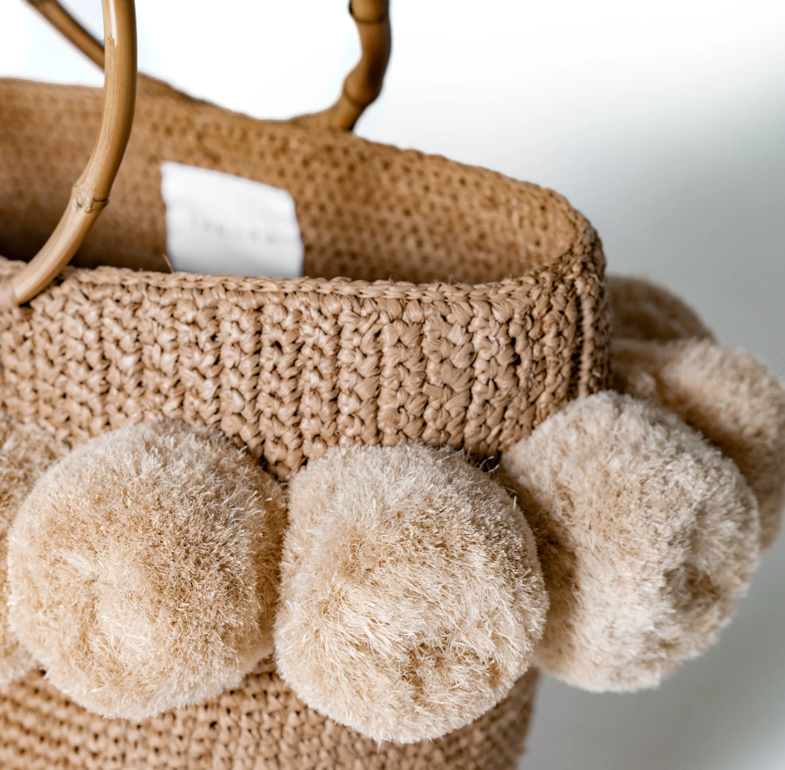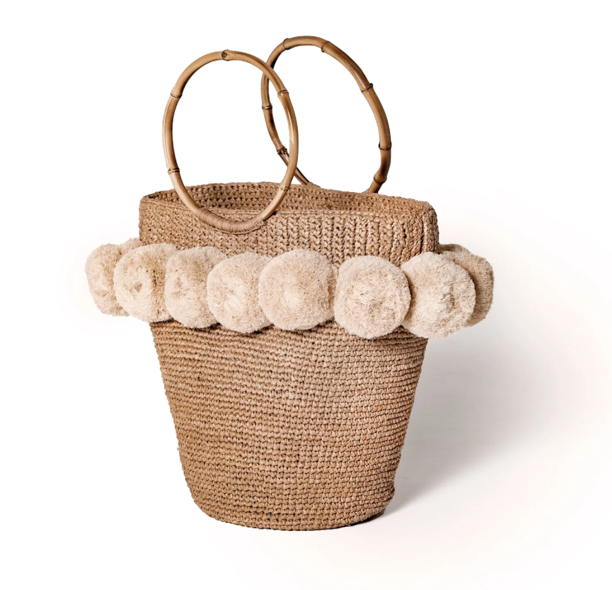 This bucket wrist bag features our signature raffia pom poms. SEO will be a charming addition to sun-kissed ensembles. The nuance of colours between the natural tone pom poms and tea dyed crochet body makes SEO an enviable companion for your coffee run.