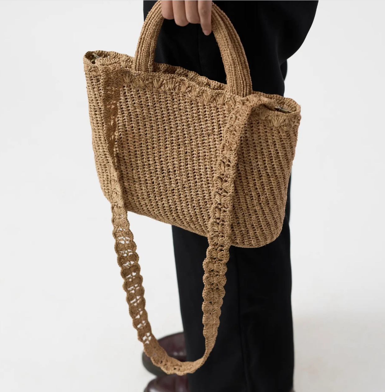 It features a detachable crossbody strap for hands-free wear, or can be carried by hand for a more polished look. With its clean lines and roomy interior, it balances elegance with everyday function.