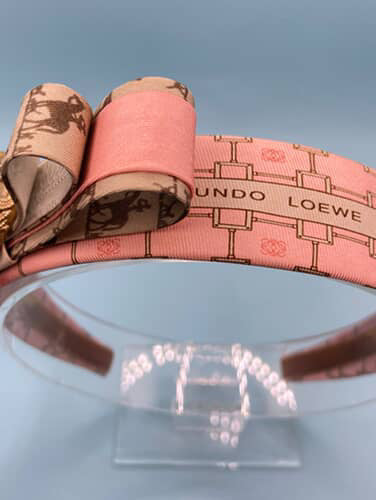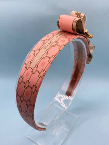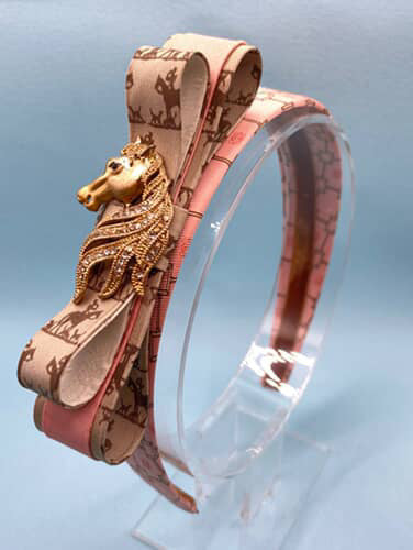 Pink and coffee silk headband with horse and bow embellishment made from Hermes and Loweve tie.