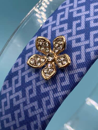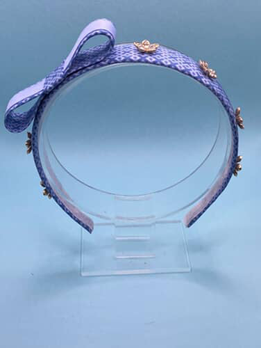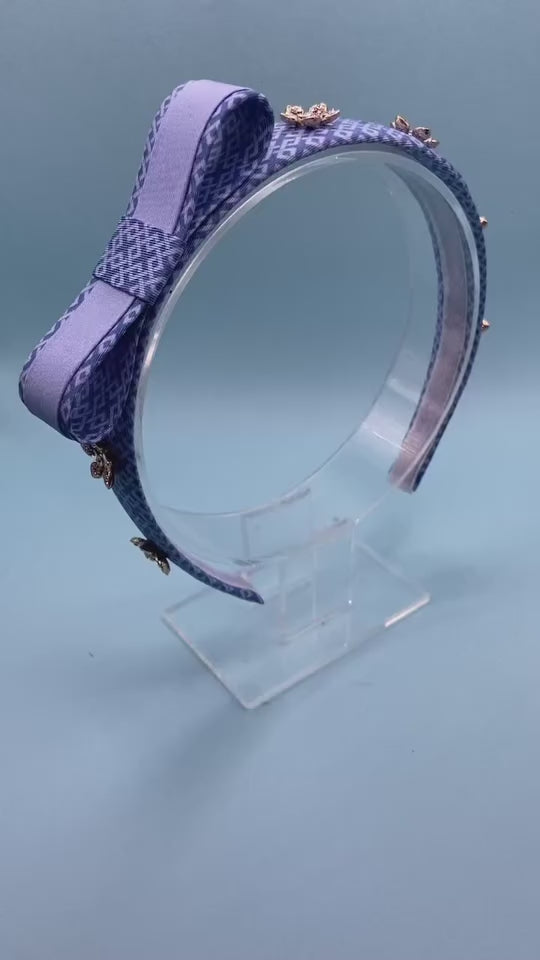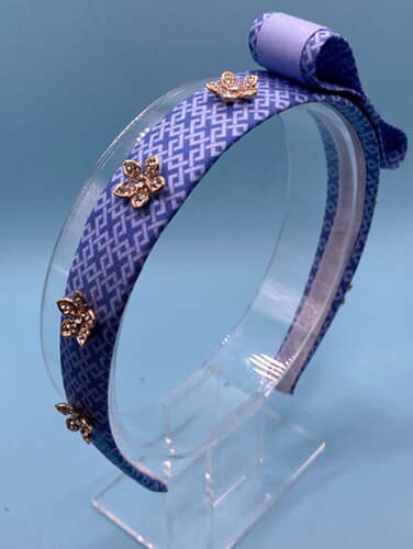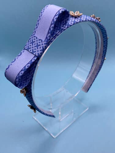 Blue silk headband with geometric print with bow detail and diamante flowers made from a vintage Hermes tie.