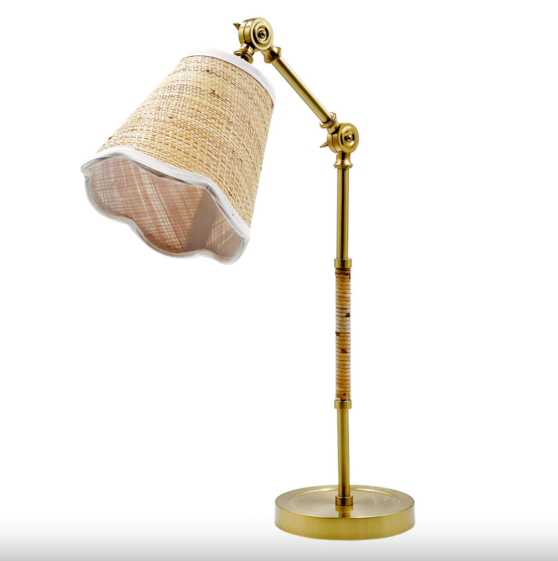 The Wallace Lamp features a polished brass base and neck with matching adjustments and a small raffia shade with white edging.