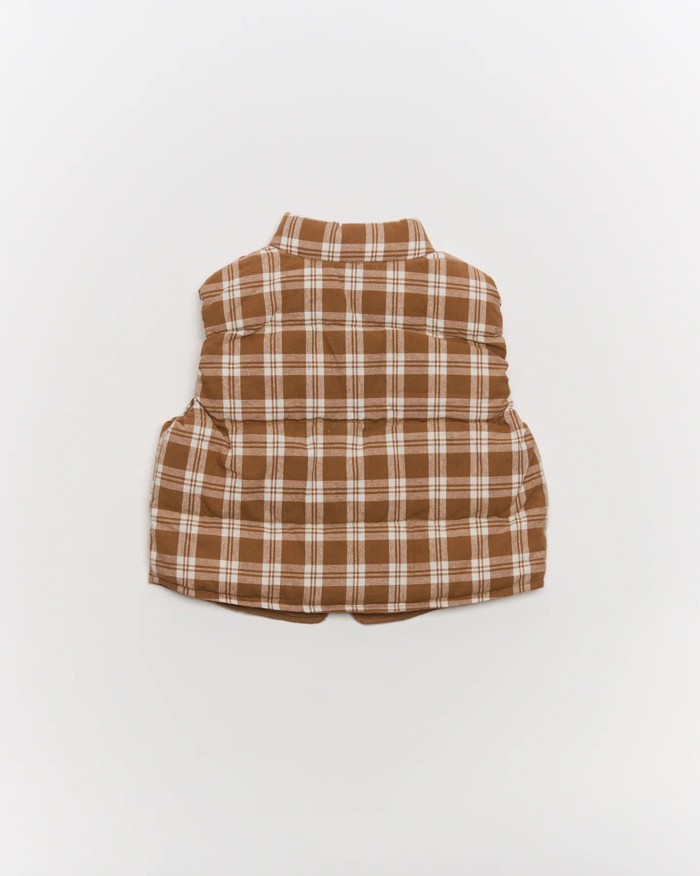 The Liam Vest in Tan Check is a stylish and practical choice for layering during cooler days. Featuring a classic tan check pattern, this vest combines warmth with timeless style. The lightweight padding keeps your little one cozy without adding bulk, while the full front zipper ensures easy on and off. With two handy pockets for small treasures, this vest is both functional and fashionable, making it a perfect addition to any outfit, whether for outdoor play or casual outings.