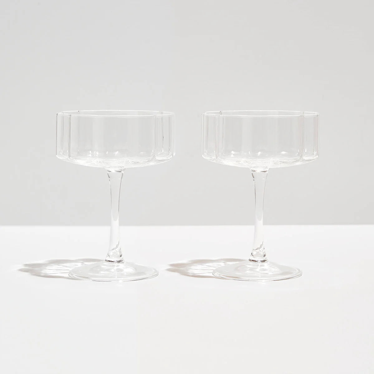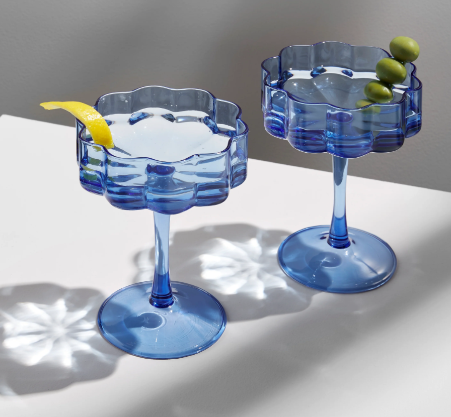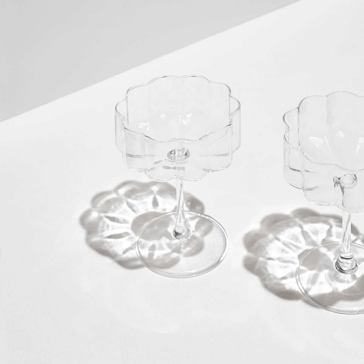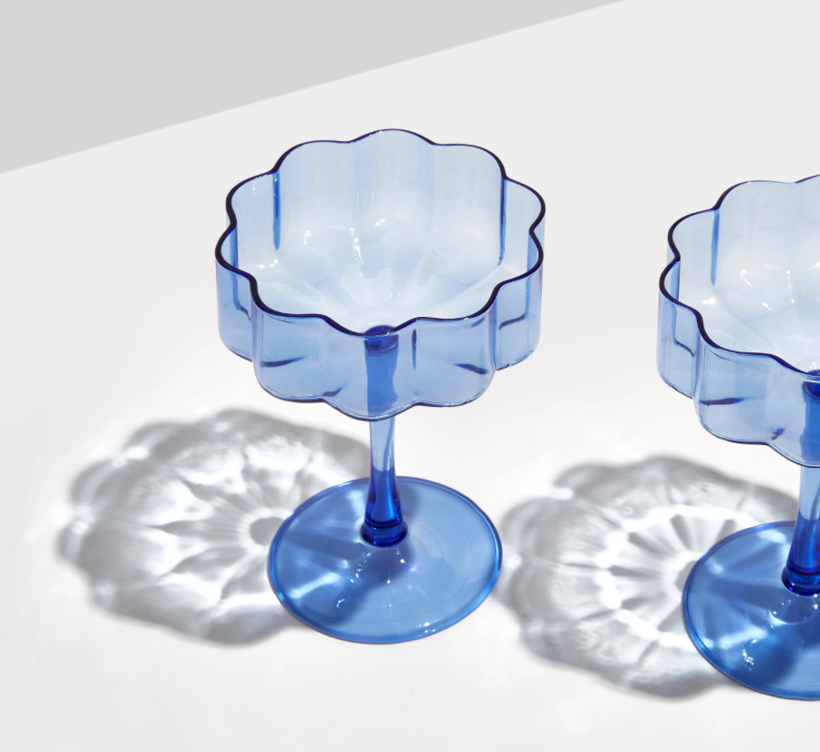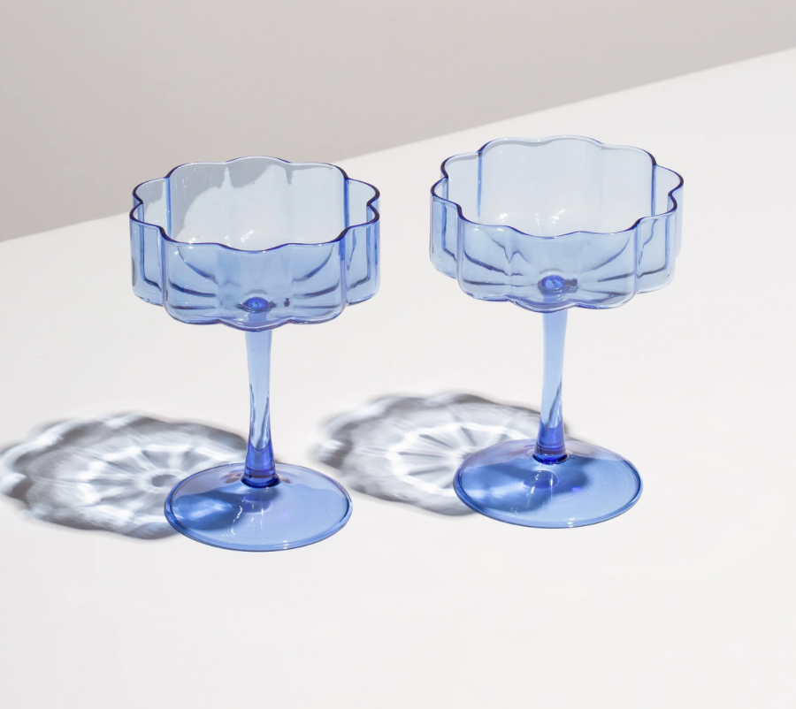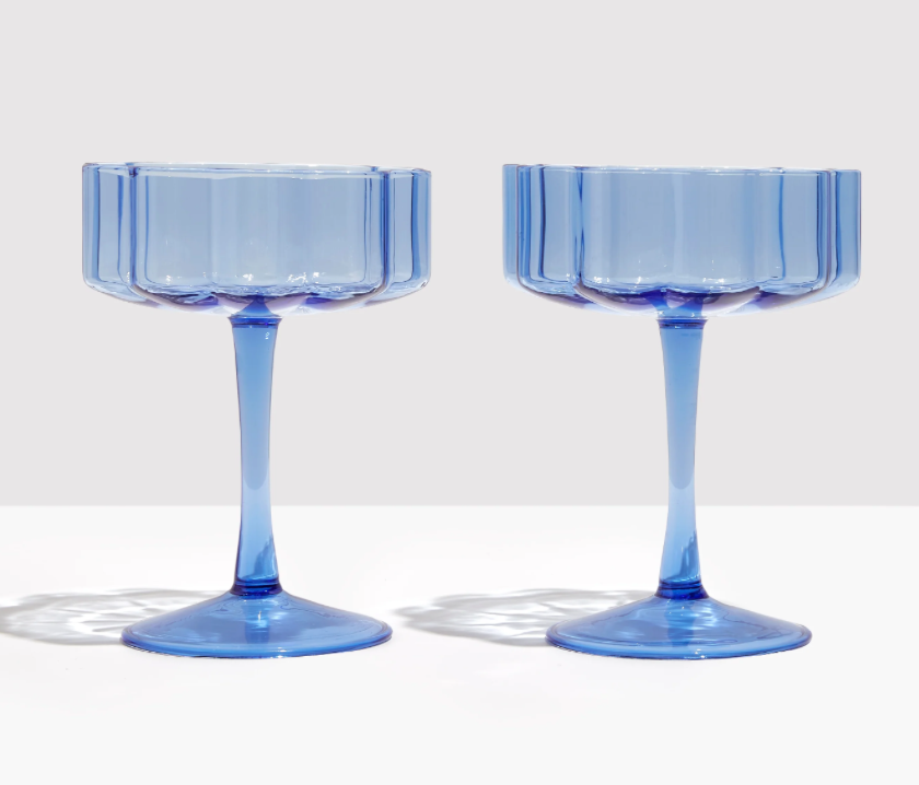 FAZEEK's WAVE COUPE GLASSES - BLUE are a modern and playful reimagining of a glassware classic. Featuring an elegant, elongated stem and a wide bowl embellished with beautiful signature rippled edges. These hand-blown glasses are the ultimate vessel to serve your favourite sparkling varietals, decadent cocktails or delicious desserts.