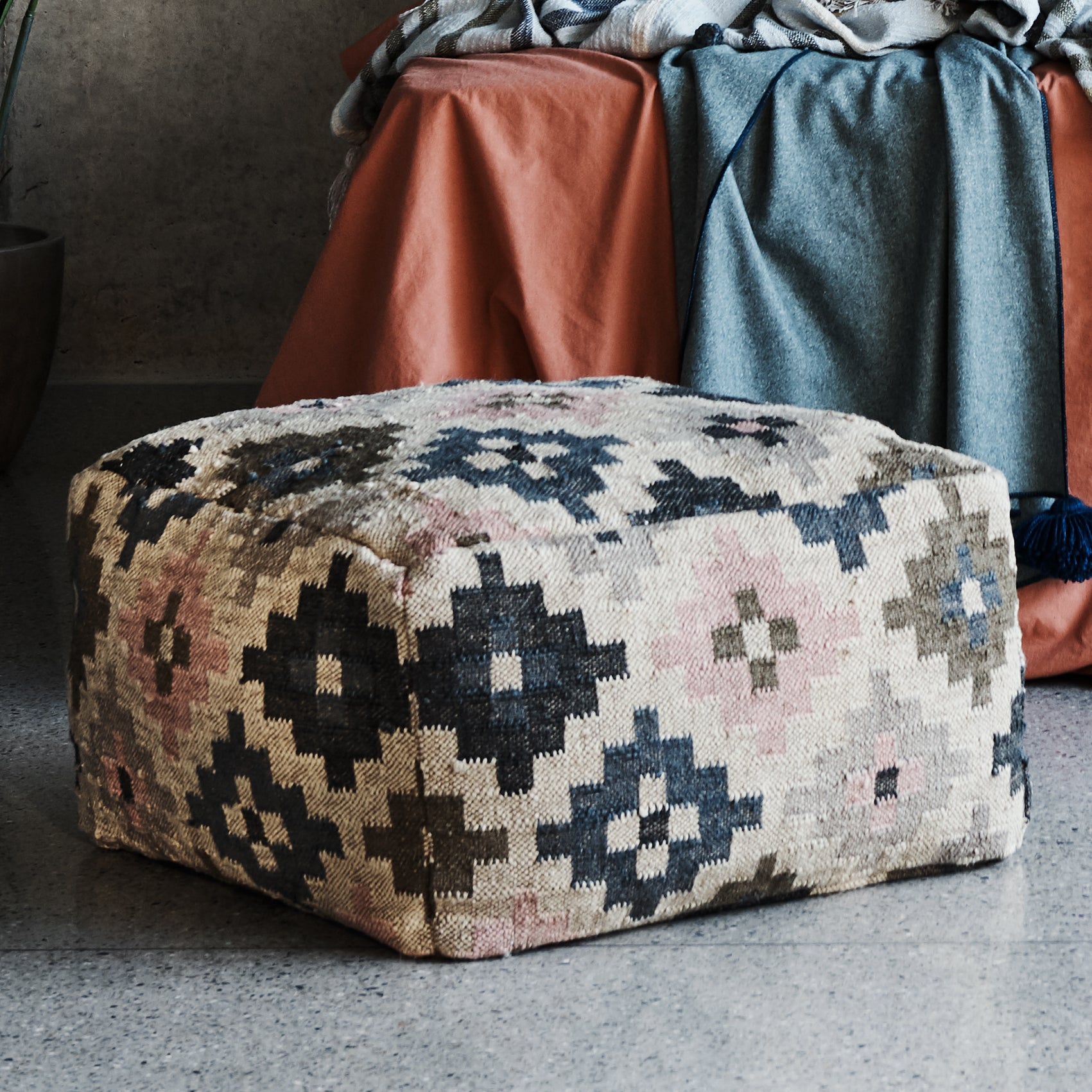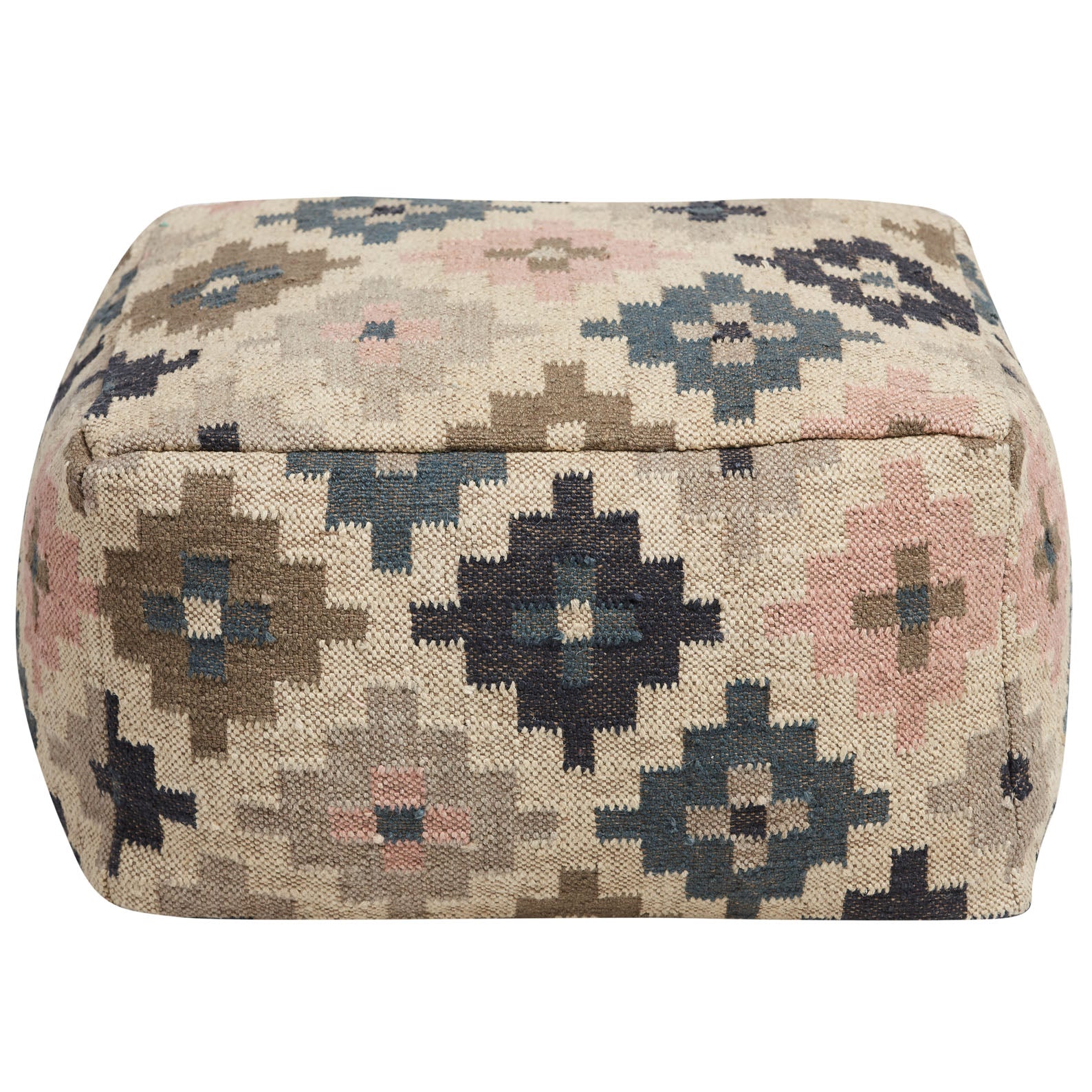 The Winter Khaleesi Ottoman is woven in winter tones of Khaki, Navy, Natural and Soft Grey.